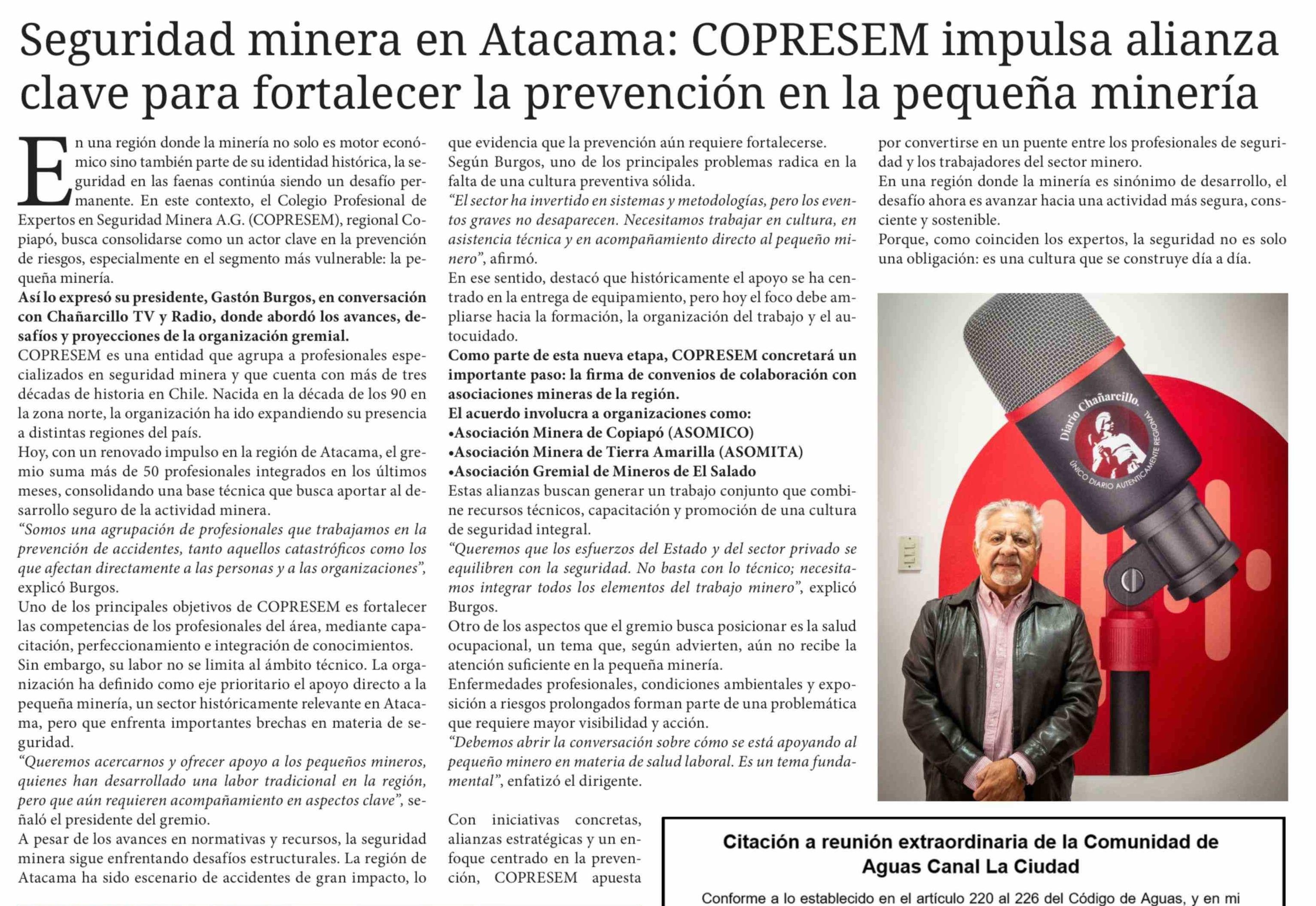 Seguridad minera en Atacama: COPRESEM impulsa alianza clave para fortalecer la prevención en la pequeña minería 28-04-2026 Diario Chañarcillo |