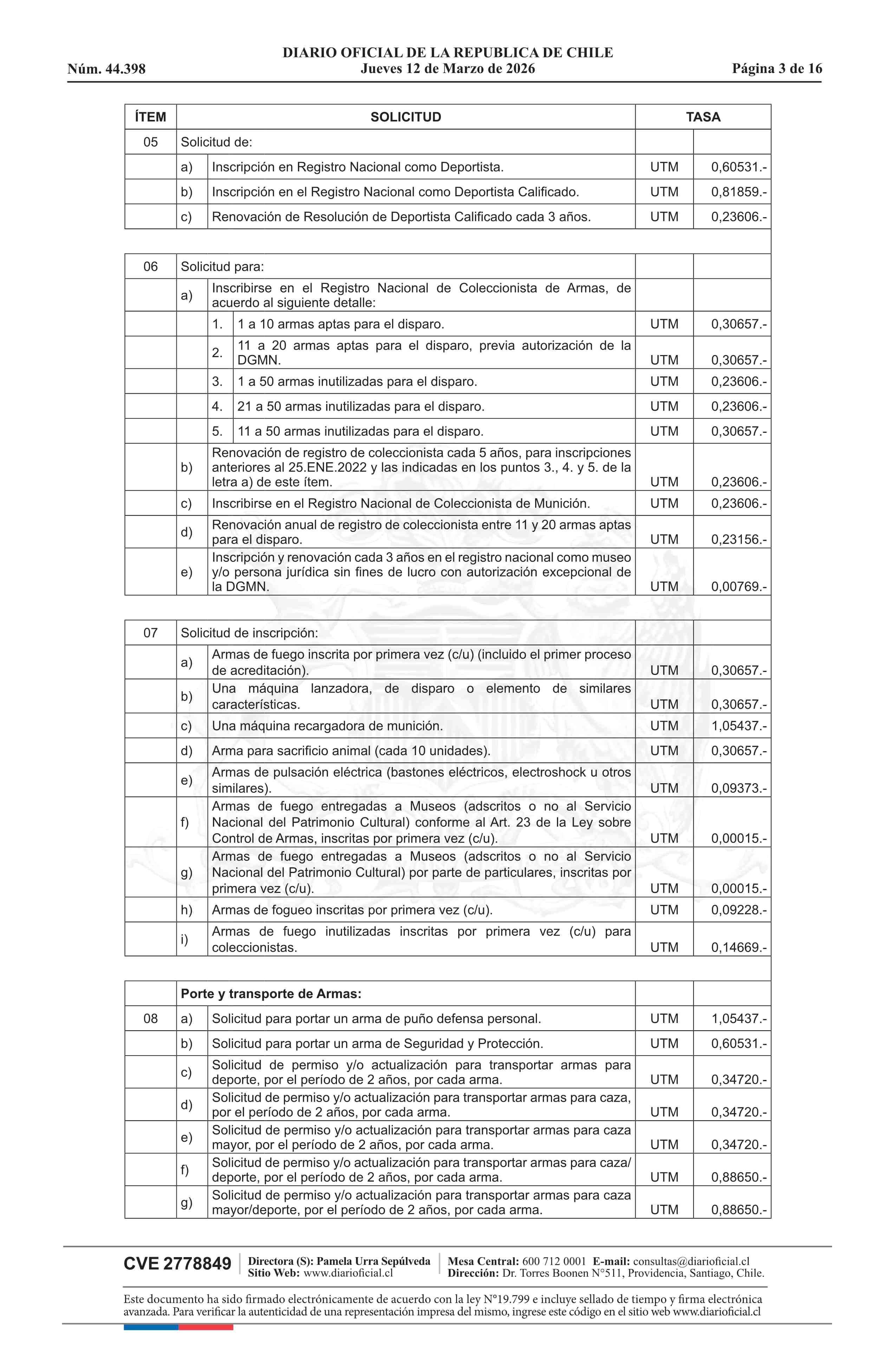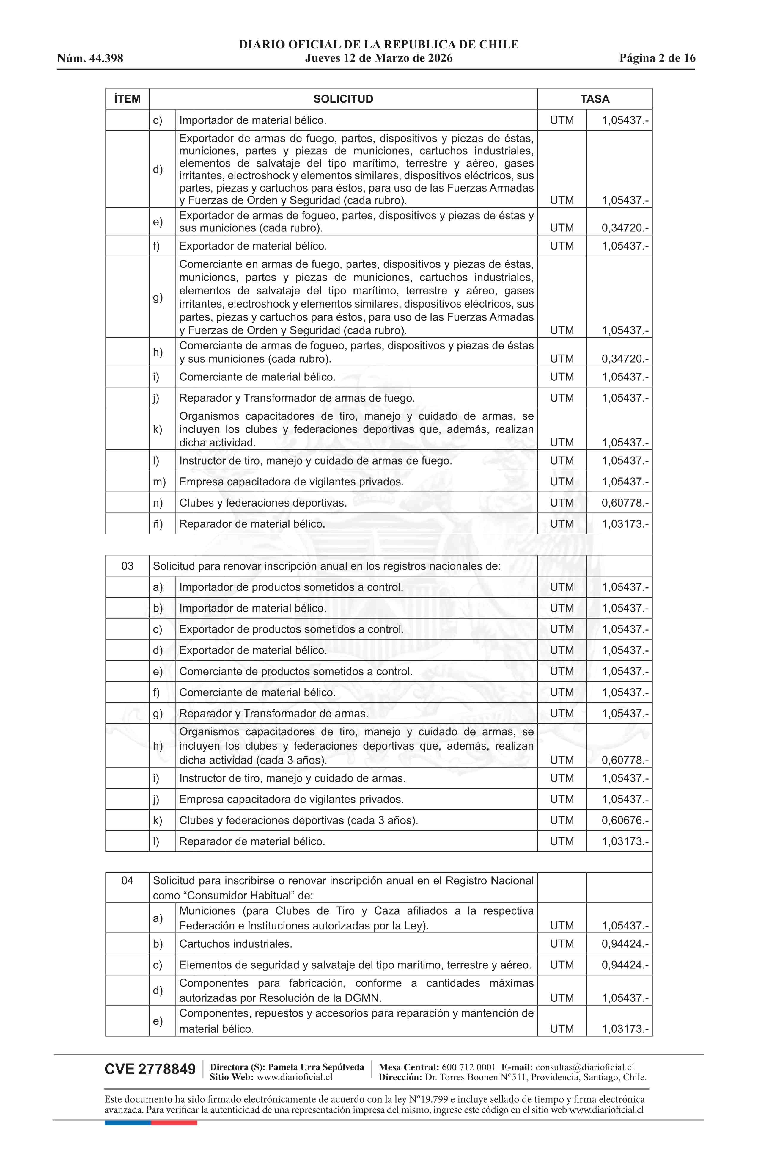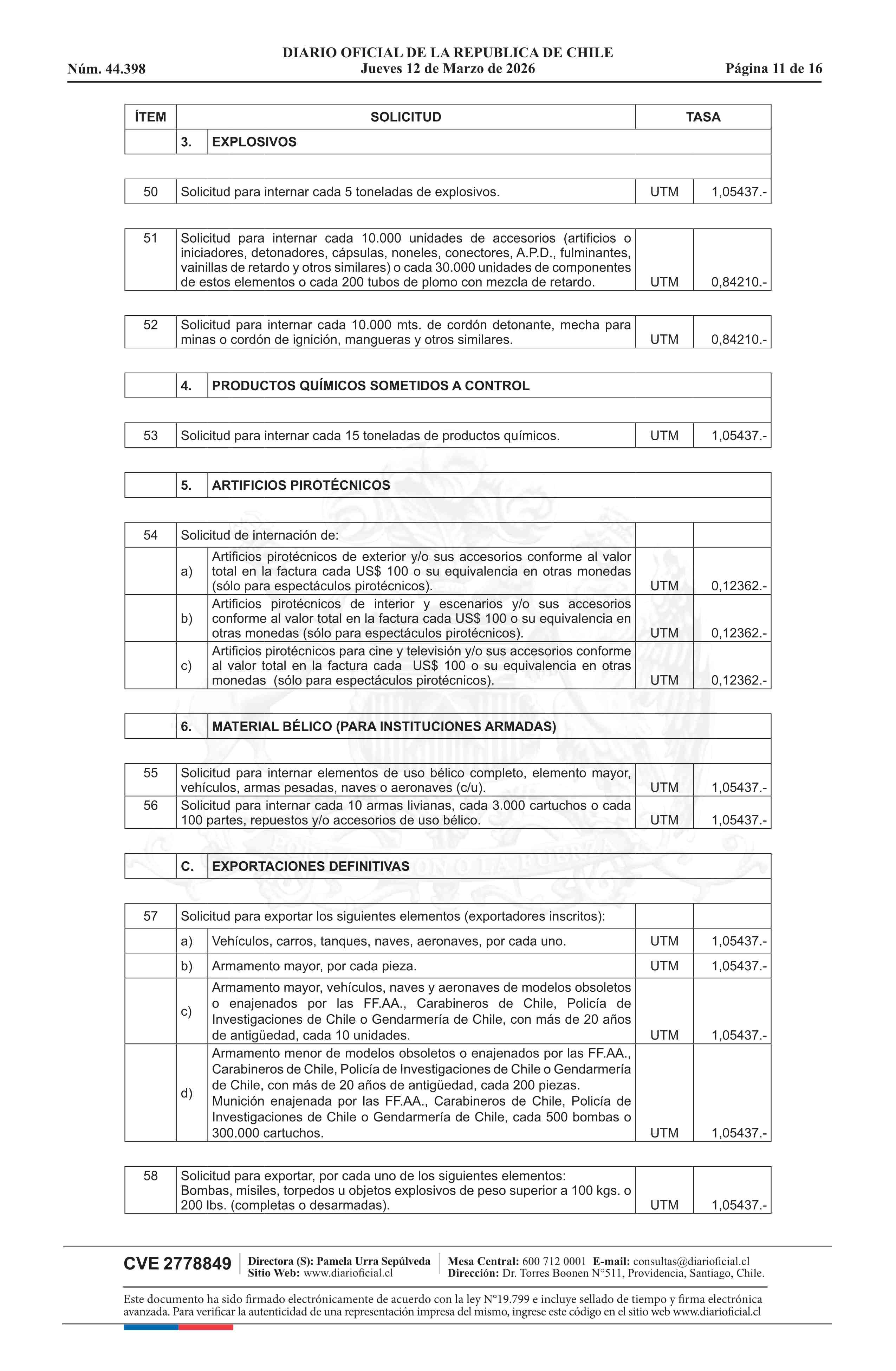 Decreto exento número 1, de 2026.- Fija tasas de derechos a solicitudes de la ley N° 17.798, sobre Control de Armas 12-03-2026 Diario Oficial Edición Electrónica |
