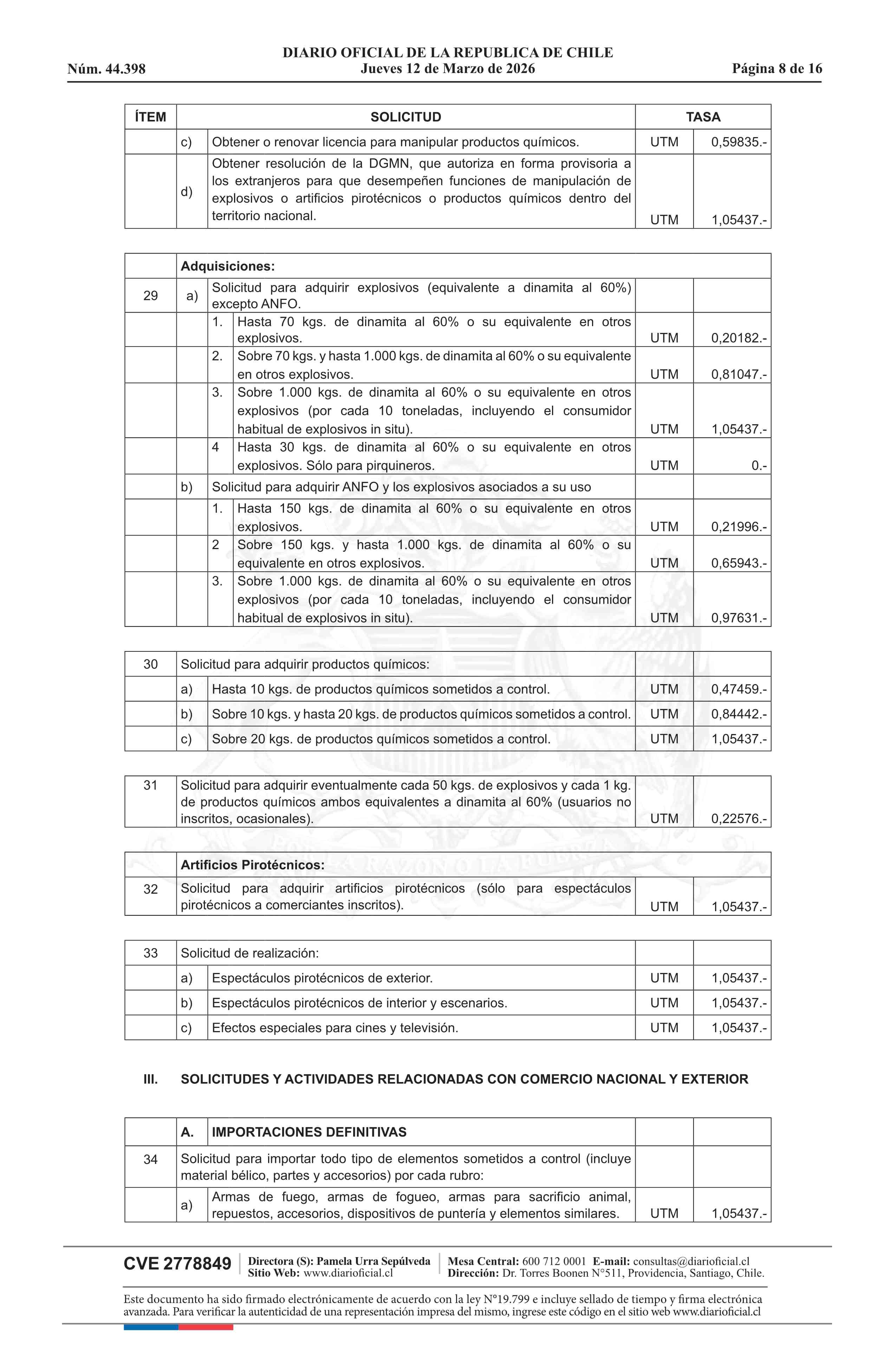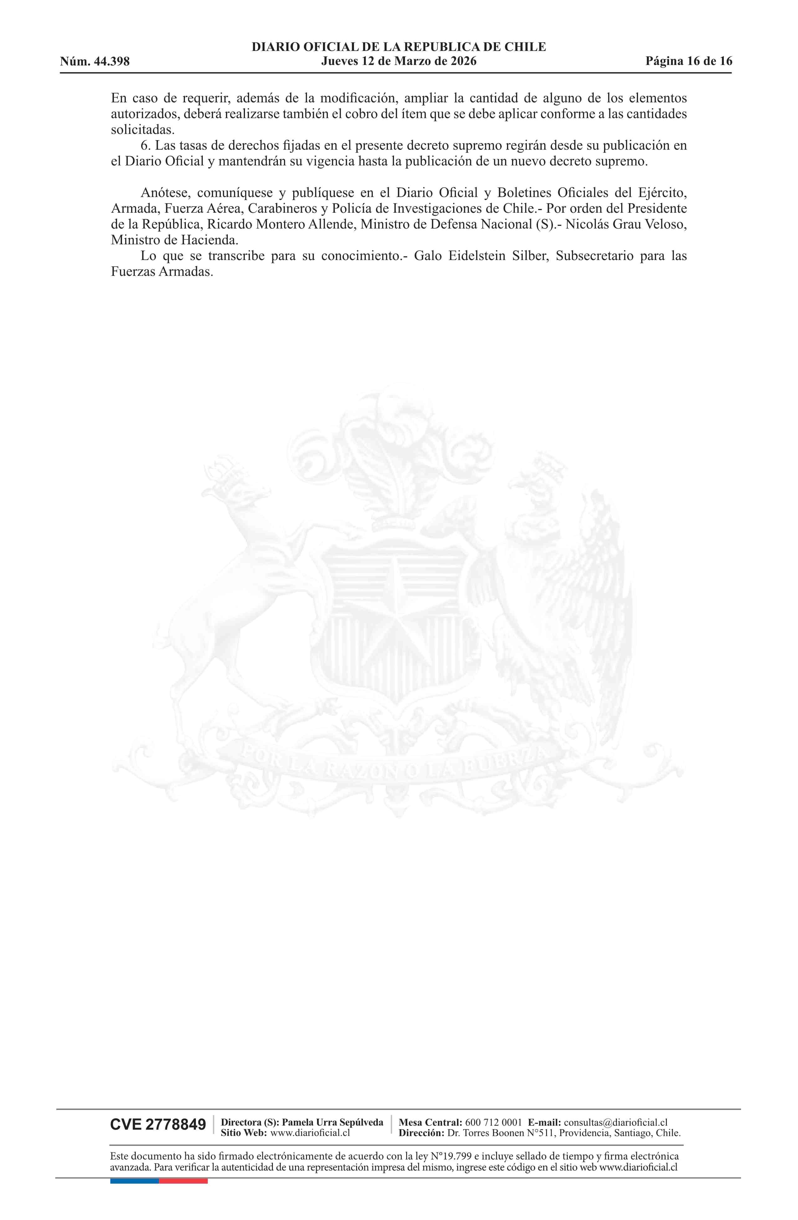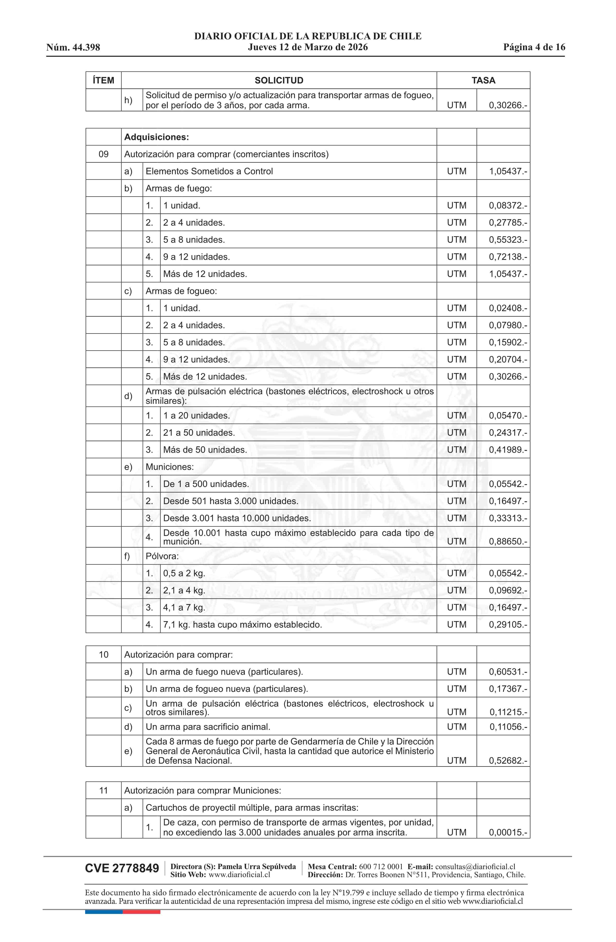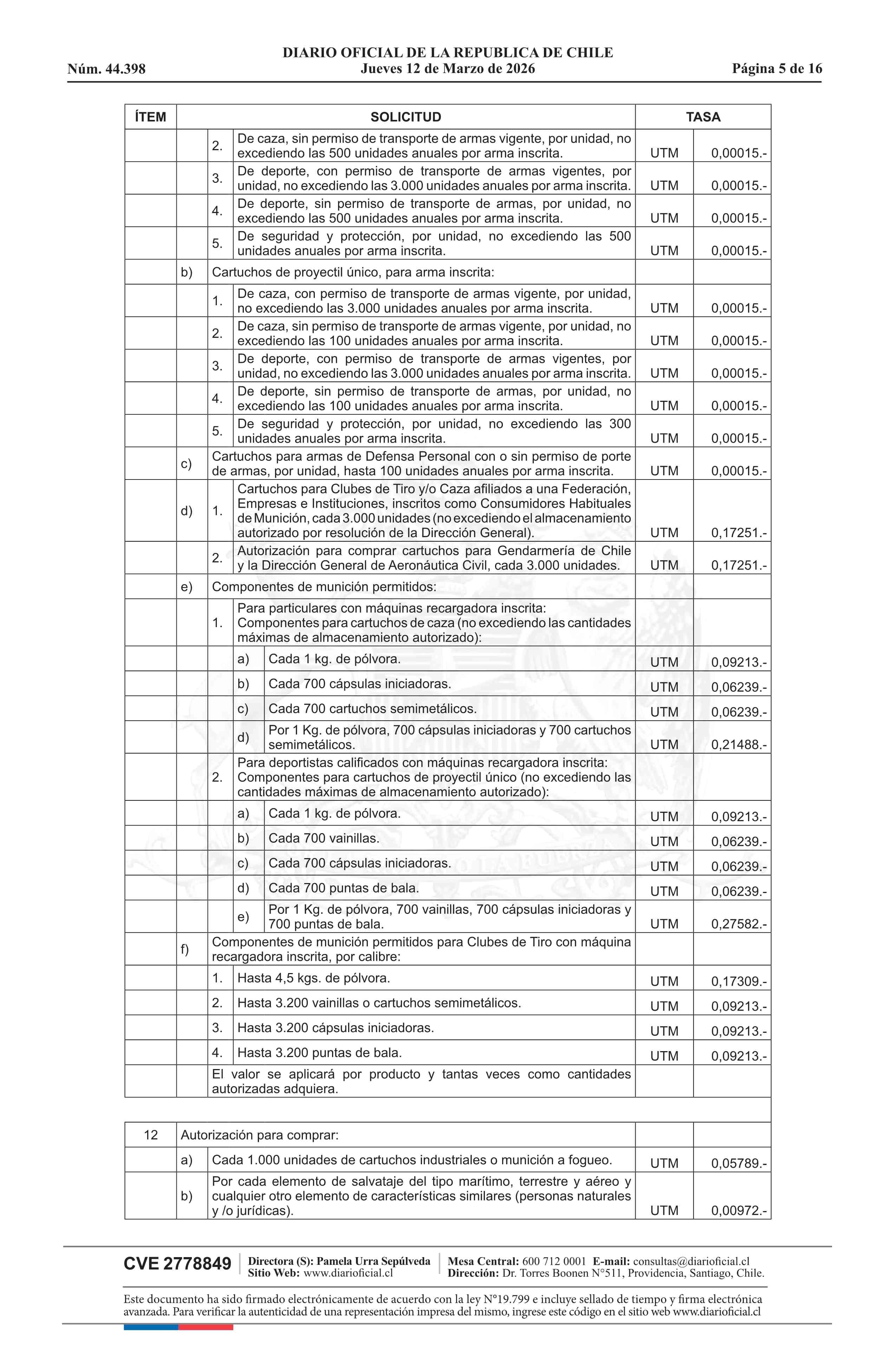 Decreto exento número 1, de 2026.- Fija tasas de derechos a solicitudes de la ley N° 17.798, sobre Control de Armas 12-03-2026 Diario Oficial Edición Electrónica |