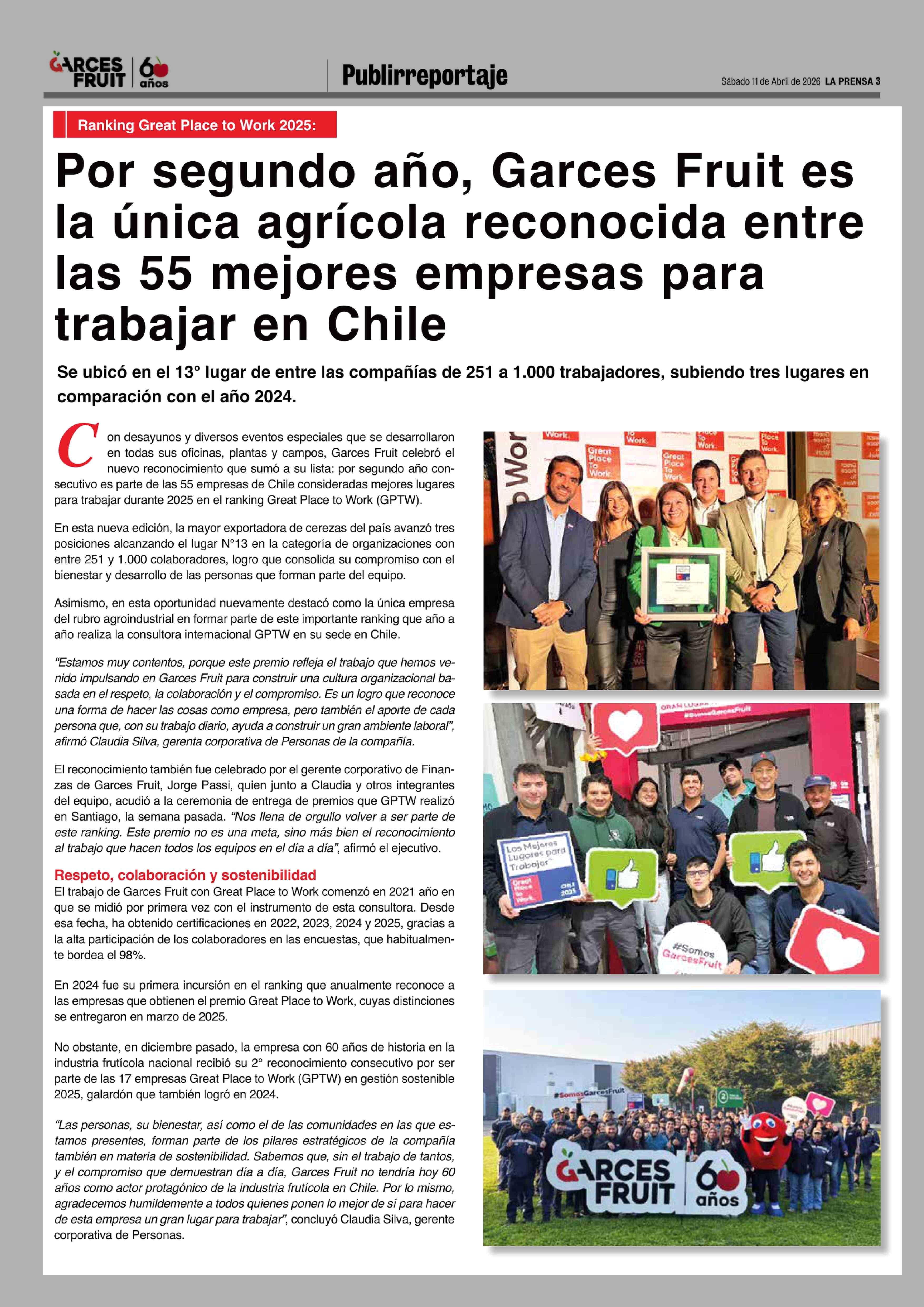 Por segundo año, Garces Fruit es la única agrícola reconocida entre las 55 mejores empresas para trabajar en Chile 11-04-2026 La Prensa de Curicó |