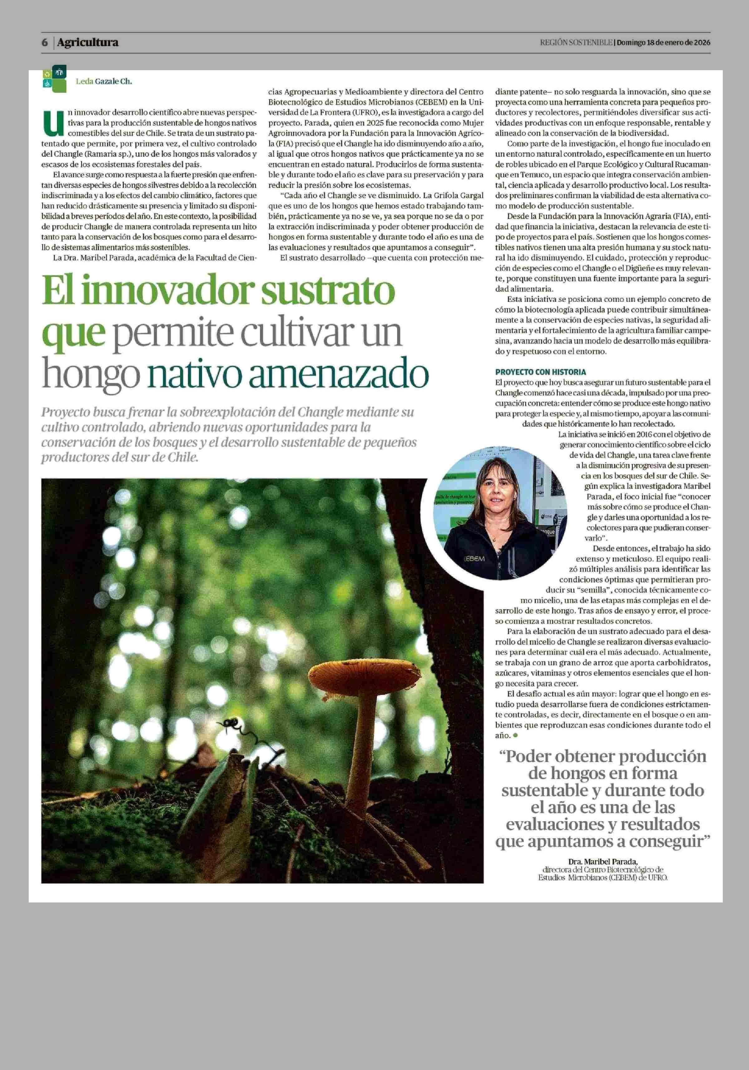 El innovador sustrato que permite cultivar un hongo nativo amenazado 18-01-2026 Diario Austral Región de Los Ríos |