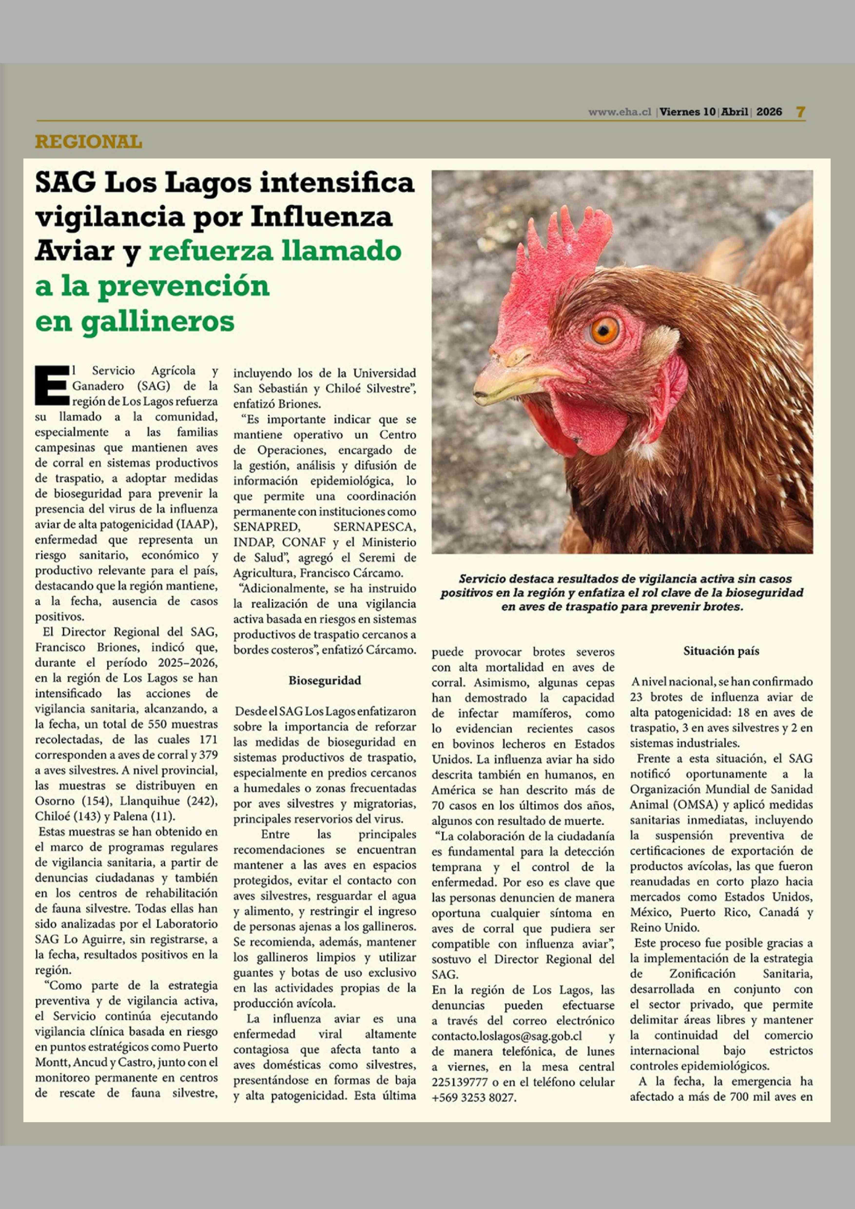 SAG Los Lagos intensifica vigilancia por Influenza Aviar y refuerza llamado a la prevención en gallineros 10-04-2026 El Heraldo Austral |
