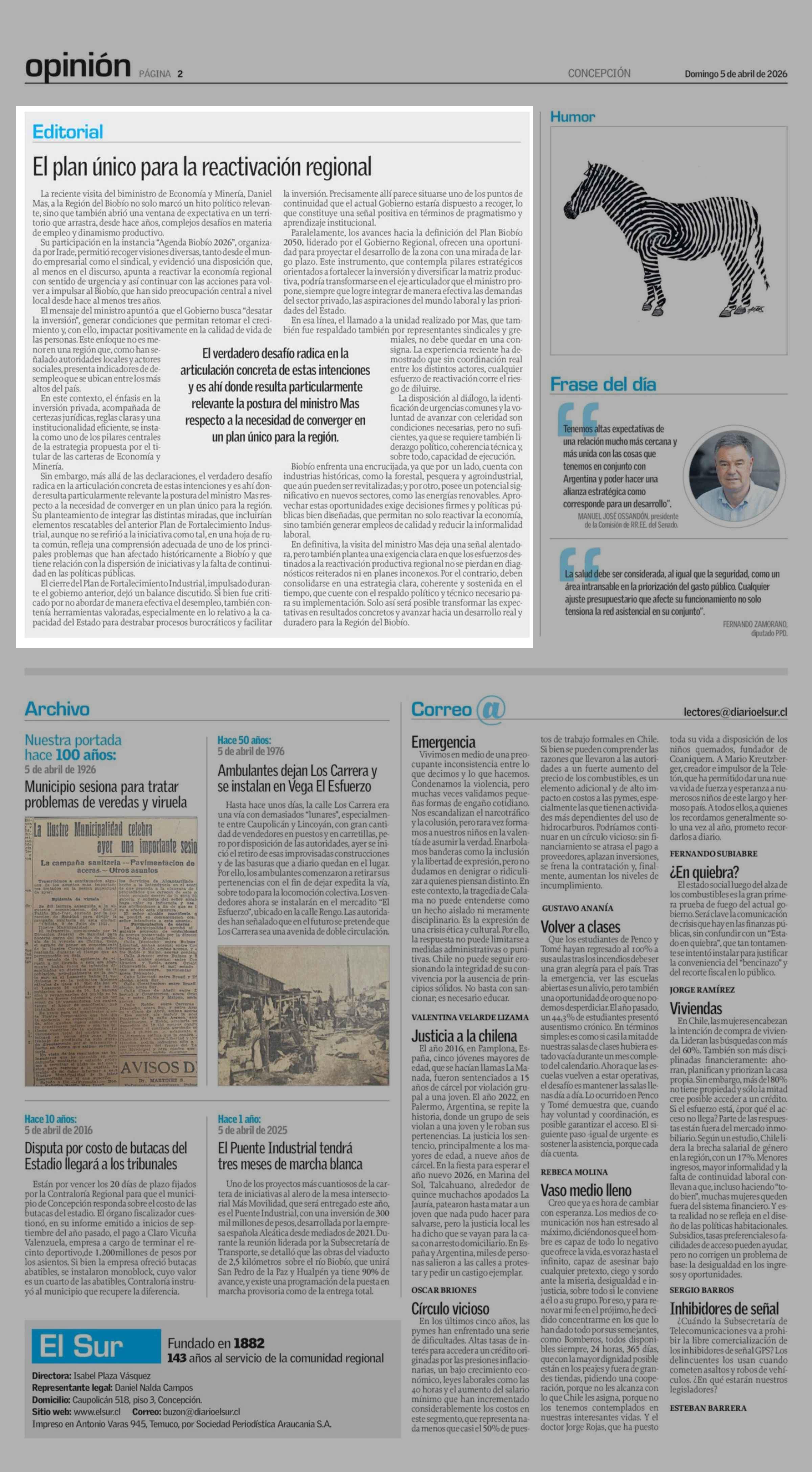 EDITORIAL: El plan único para la reactivación regional 05-04-2026 El Sur |