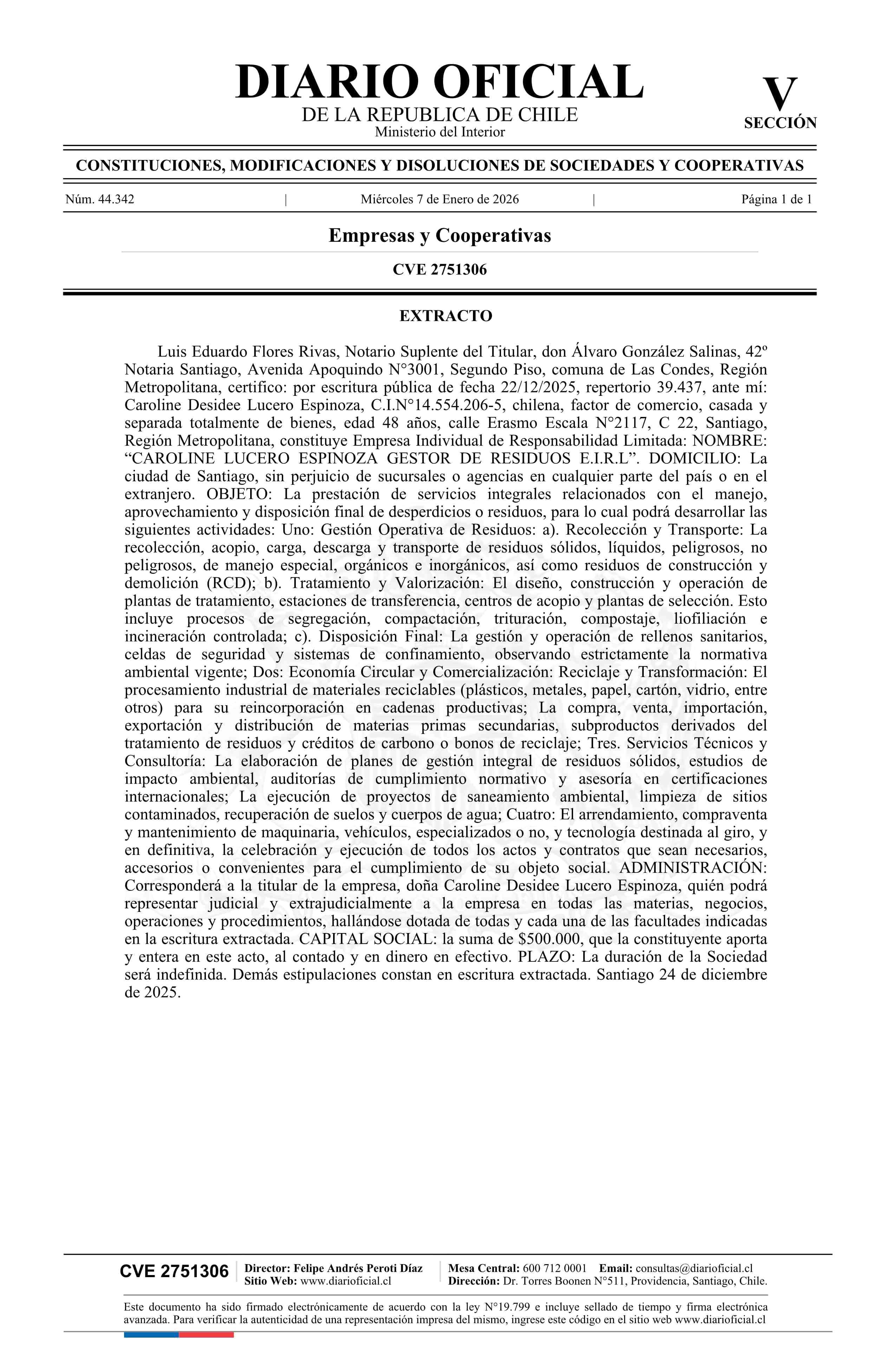CAROLINE LUCERO ESPINOZA GESTOR DE RESIDUOS E.I.R.L. 07-01-2026 Diario Oficial Edición Electrónica |