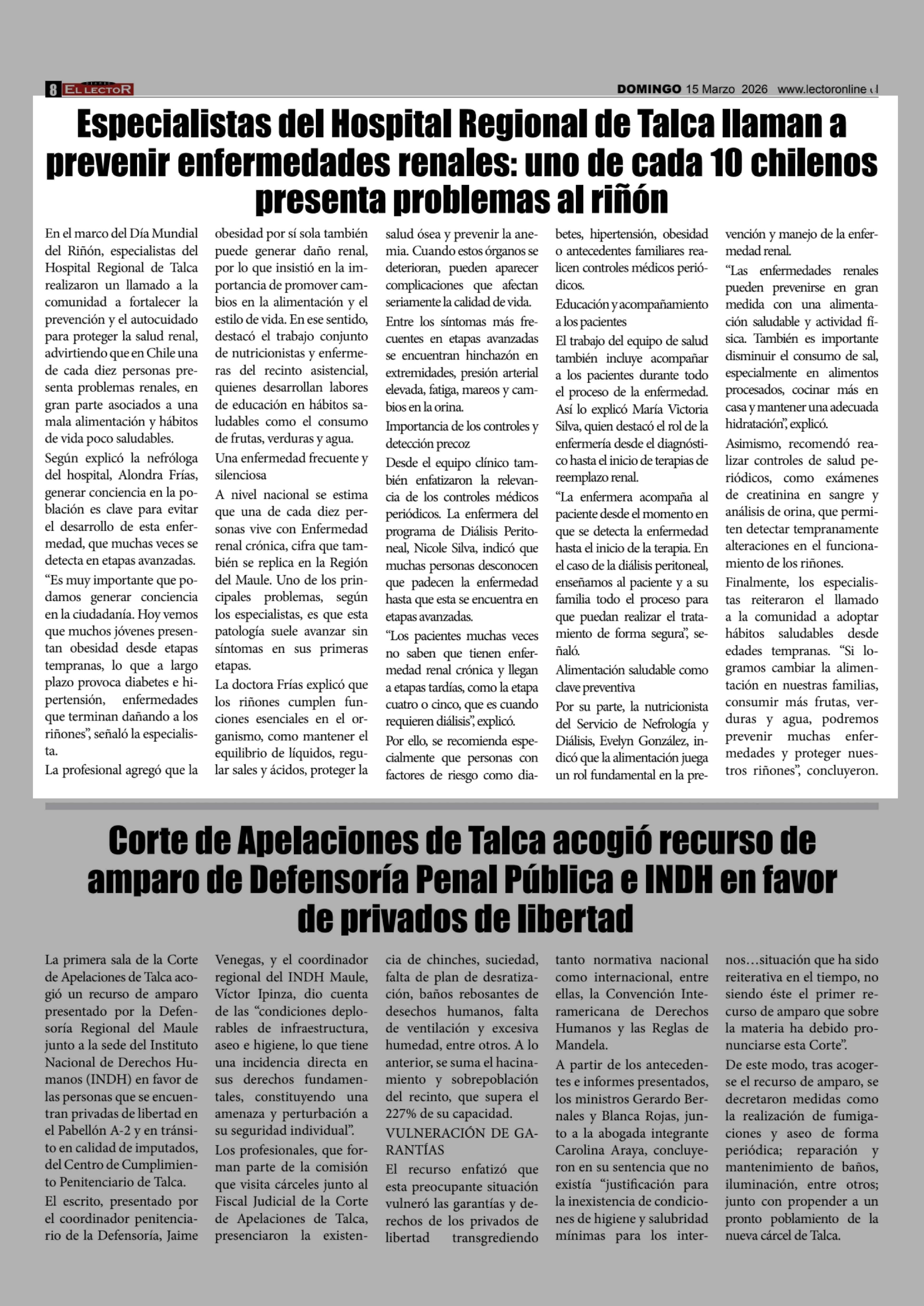 Título: Especialistas del Hospital Regional de Talca llaman a prevenir enfermedades renales: uno de cada 10 chilenos presenta problemas al riñón