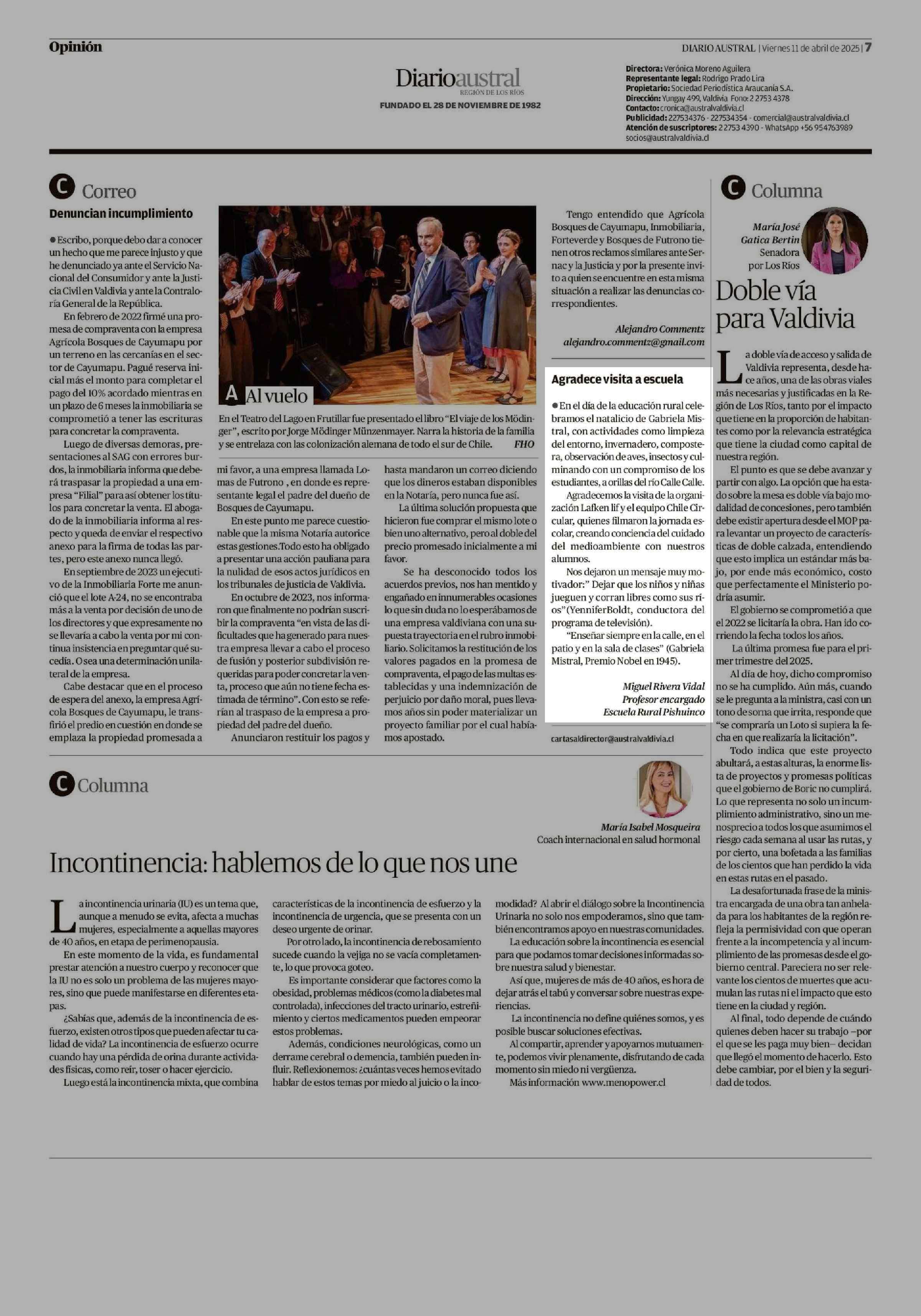 CARTAS: Agradece visita a escuela 11-04-2025 Diario Austral Región de Los Ríos |