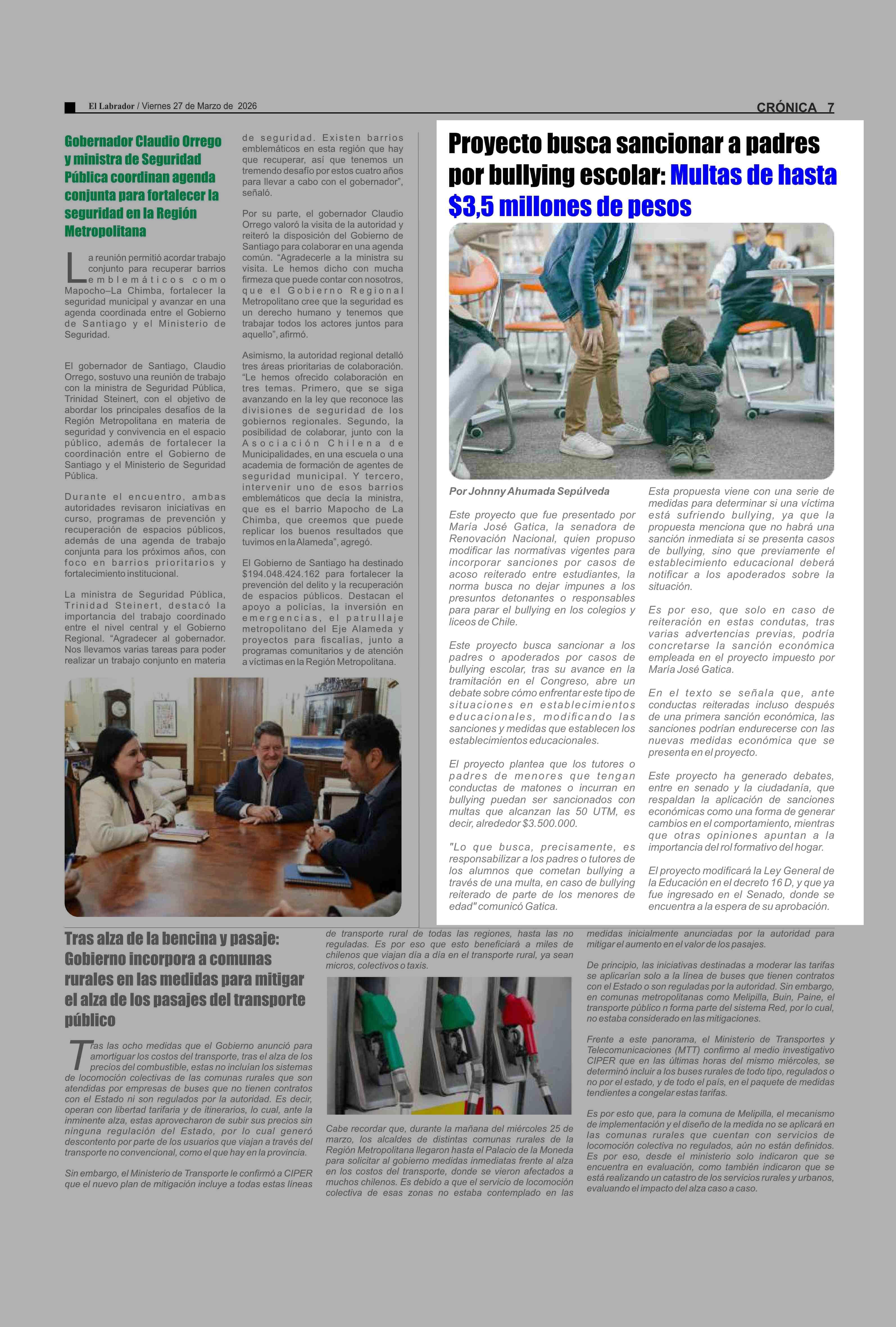 Proyecto busca sancionar a padres por bullying escolar: Multas de hasta $3,5 millones de pesos 27-03-2026 El Labrador |