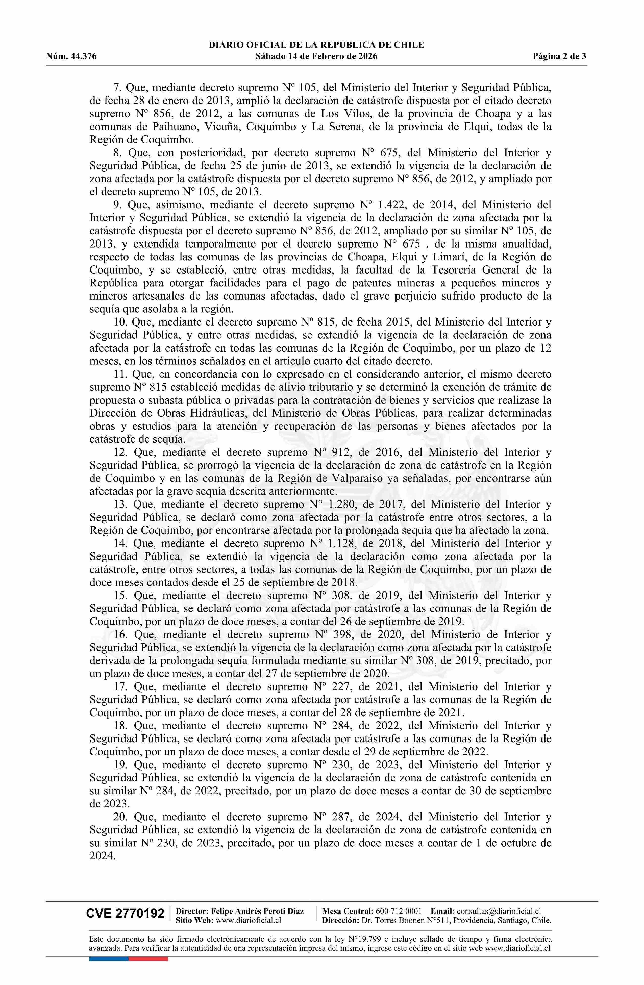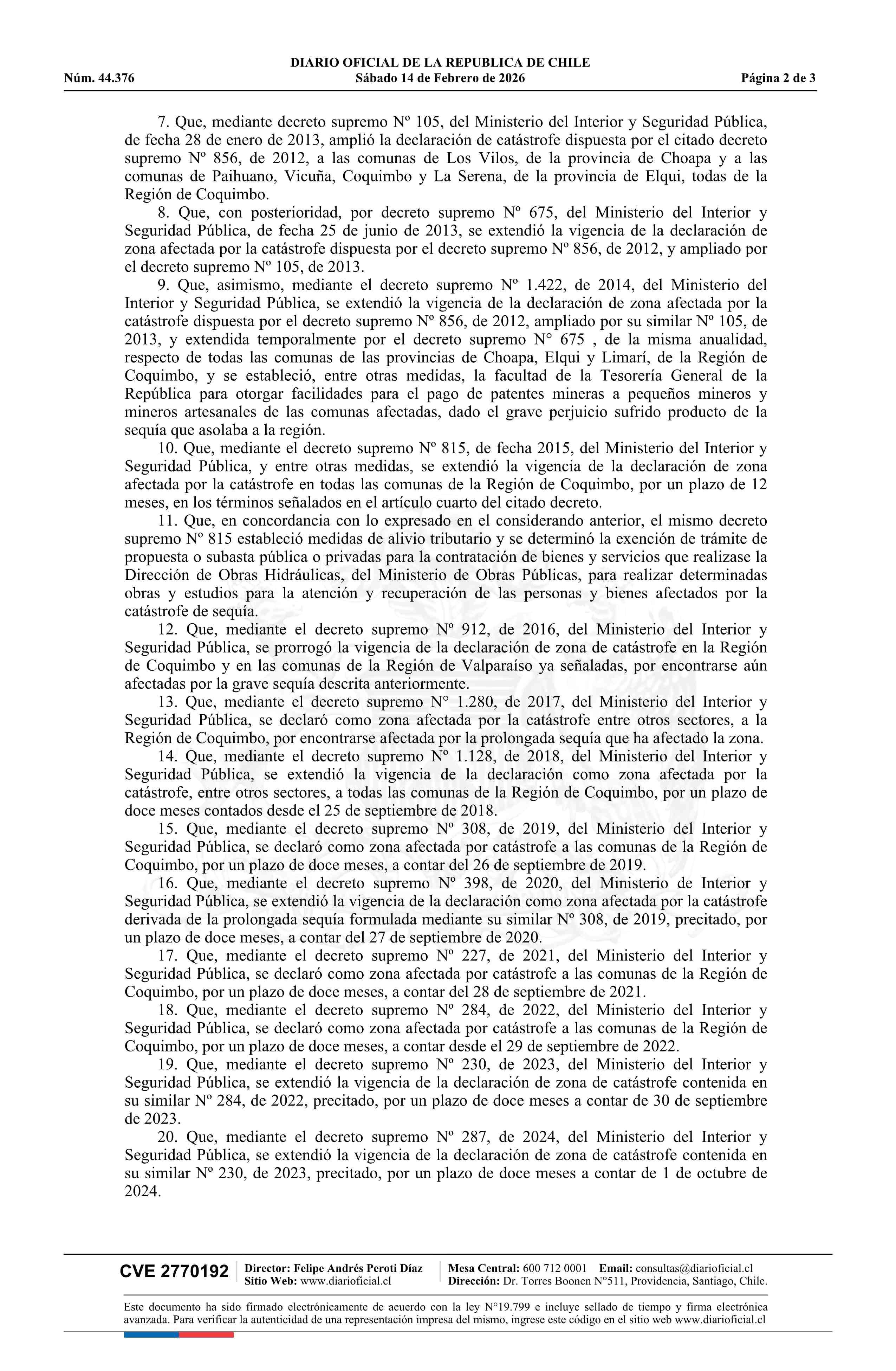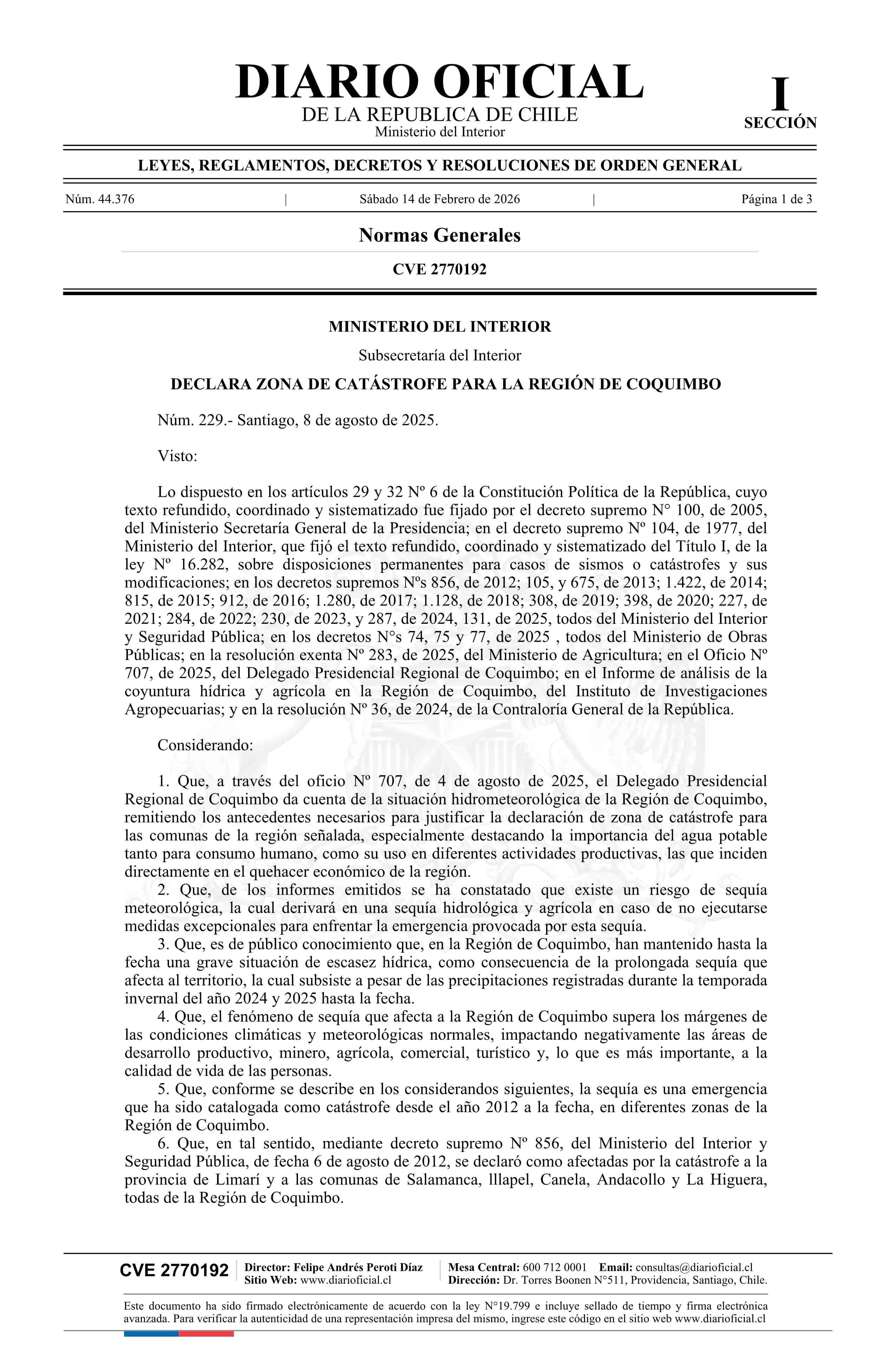 Título: Decreto número 229, de 2026.- Declara zona de catástofe para la Región de Coquimbo