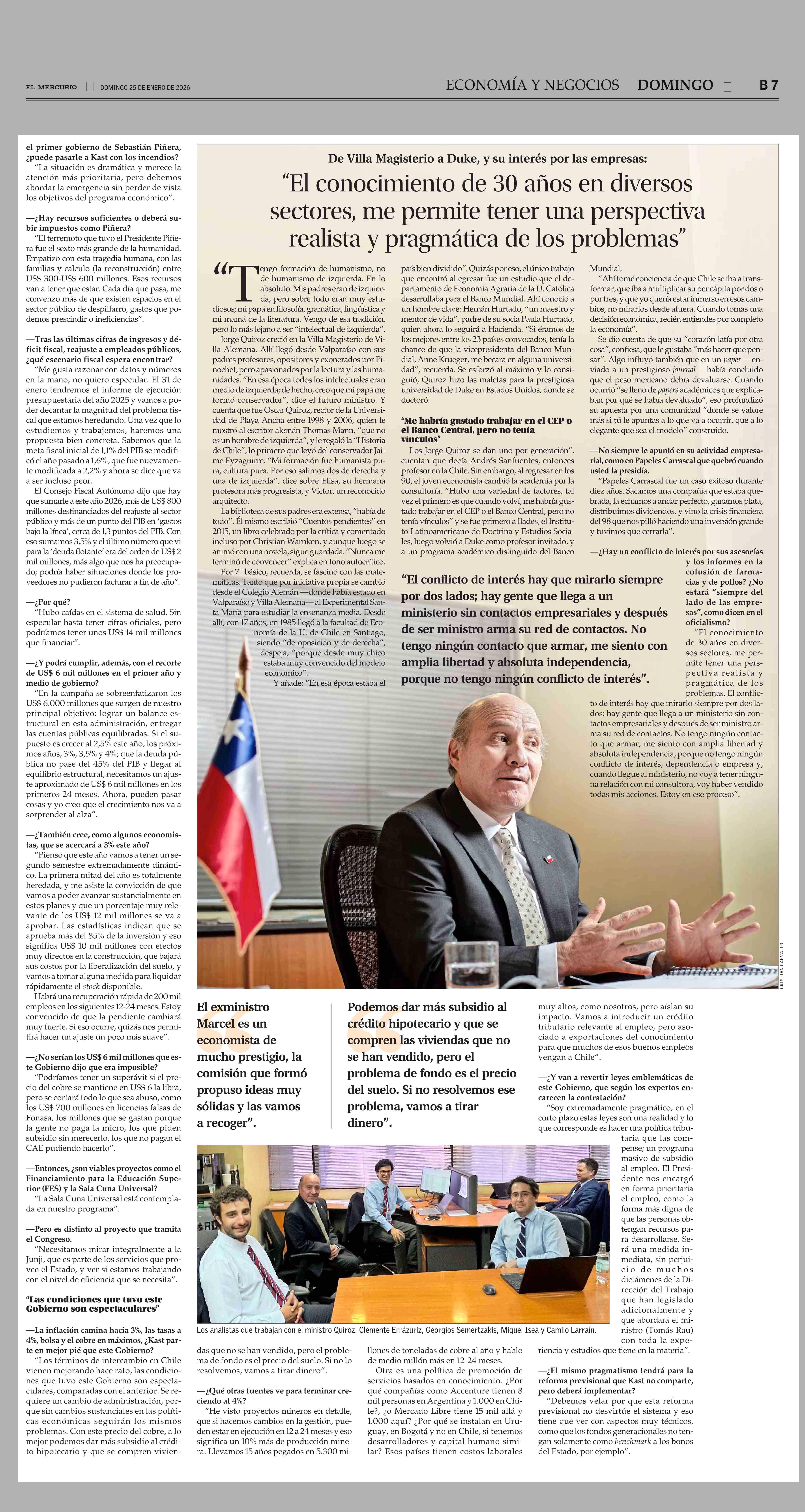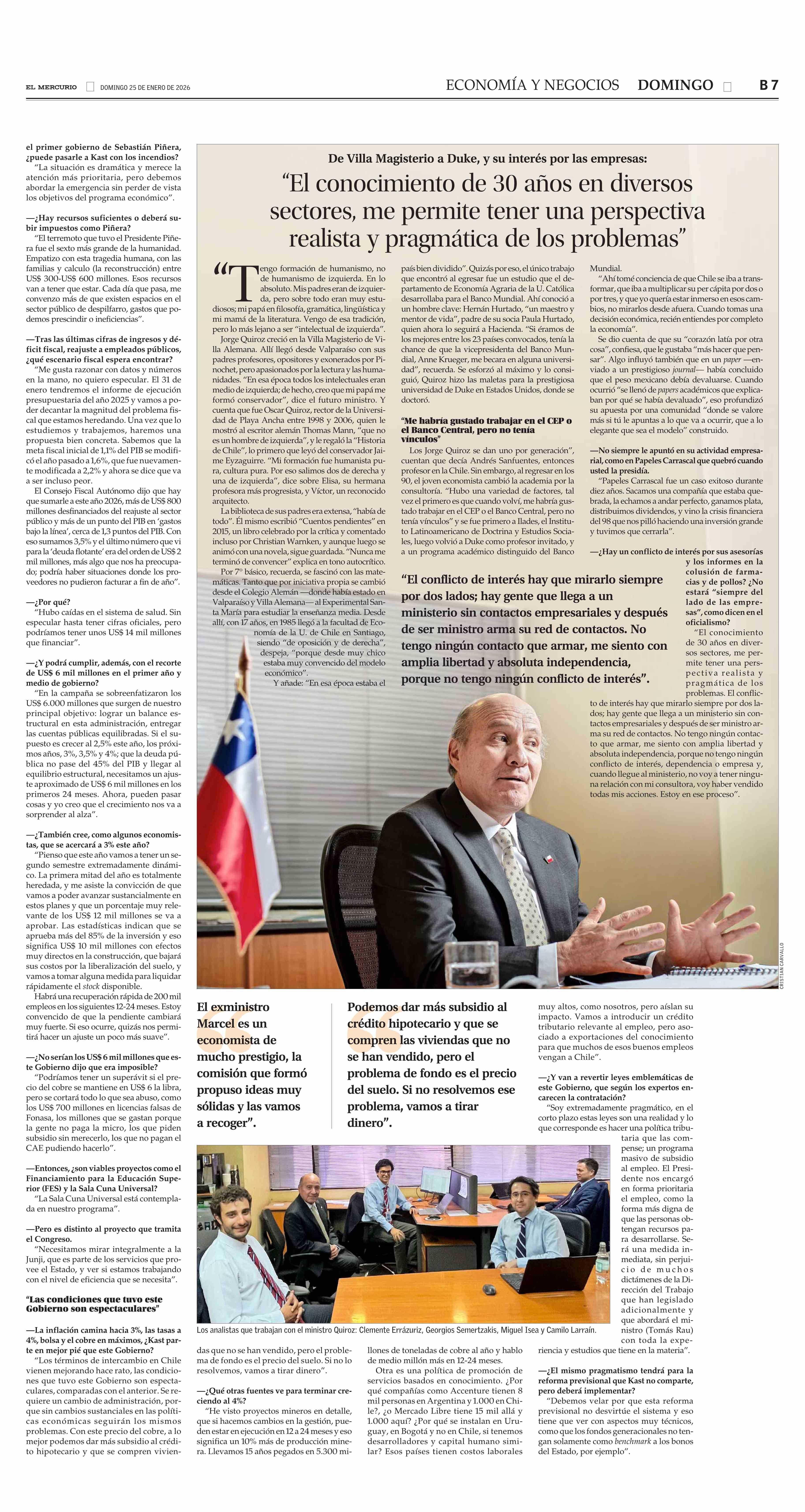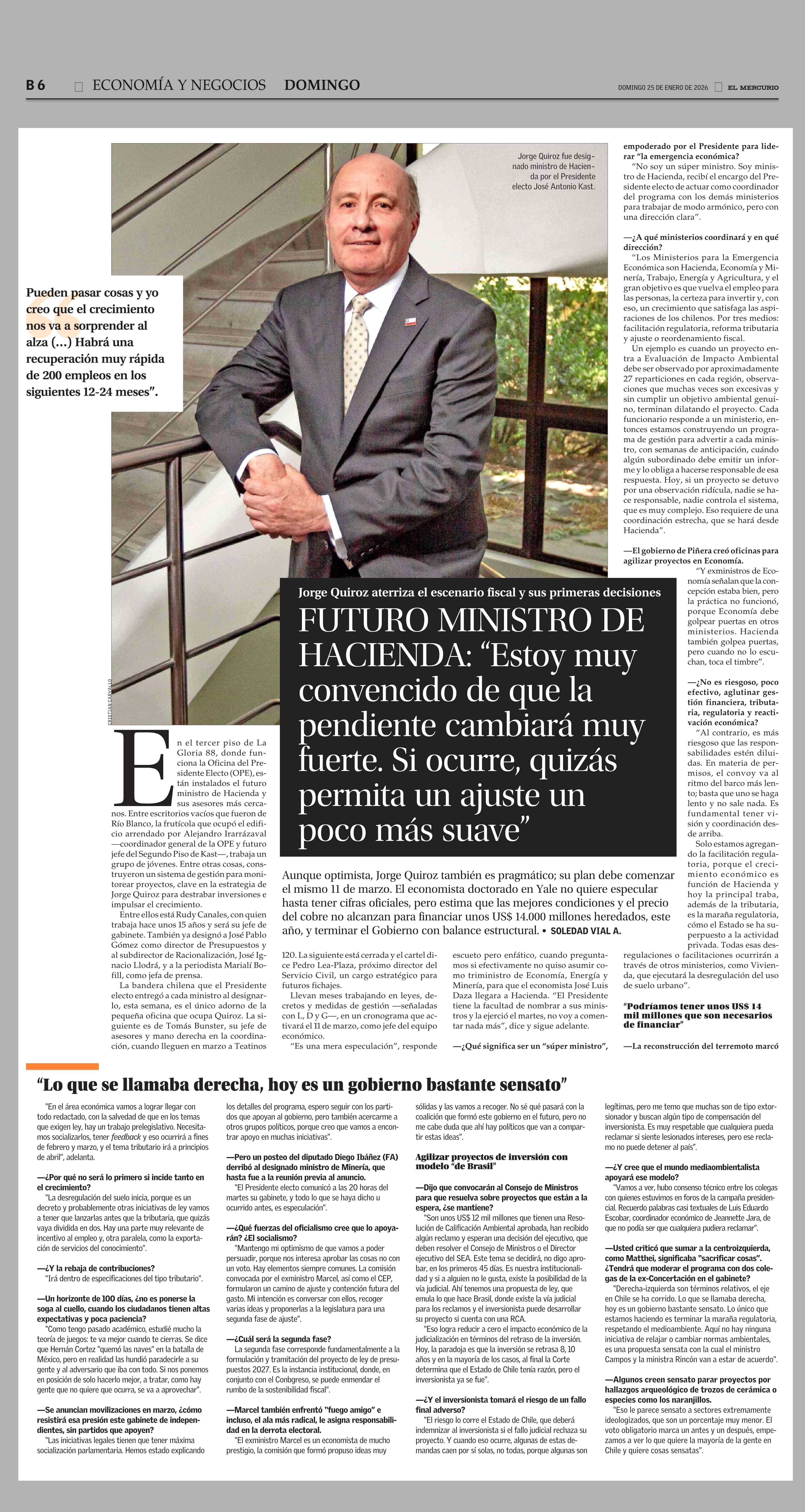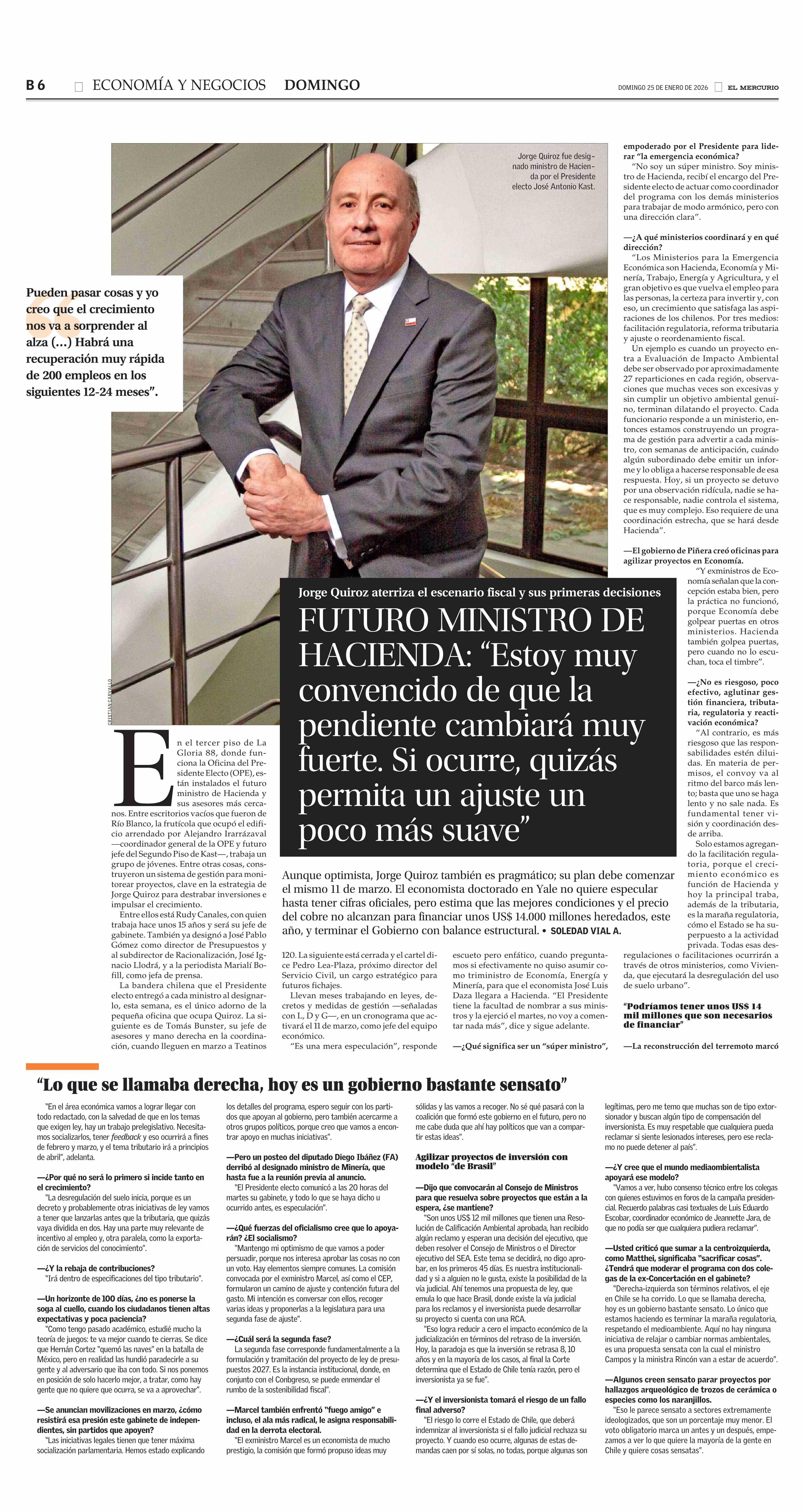 FUTURO MINISTRO DE HACIENDA: “Estoy muy convencido de que la pendiente cambiará muy fuerte. Si ocurre, quizás permita un ajuste un poco más suave” 25-01-2026 El Mercurio |