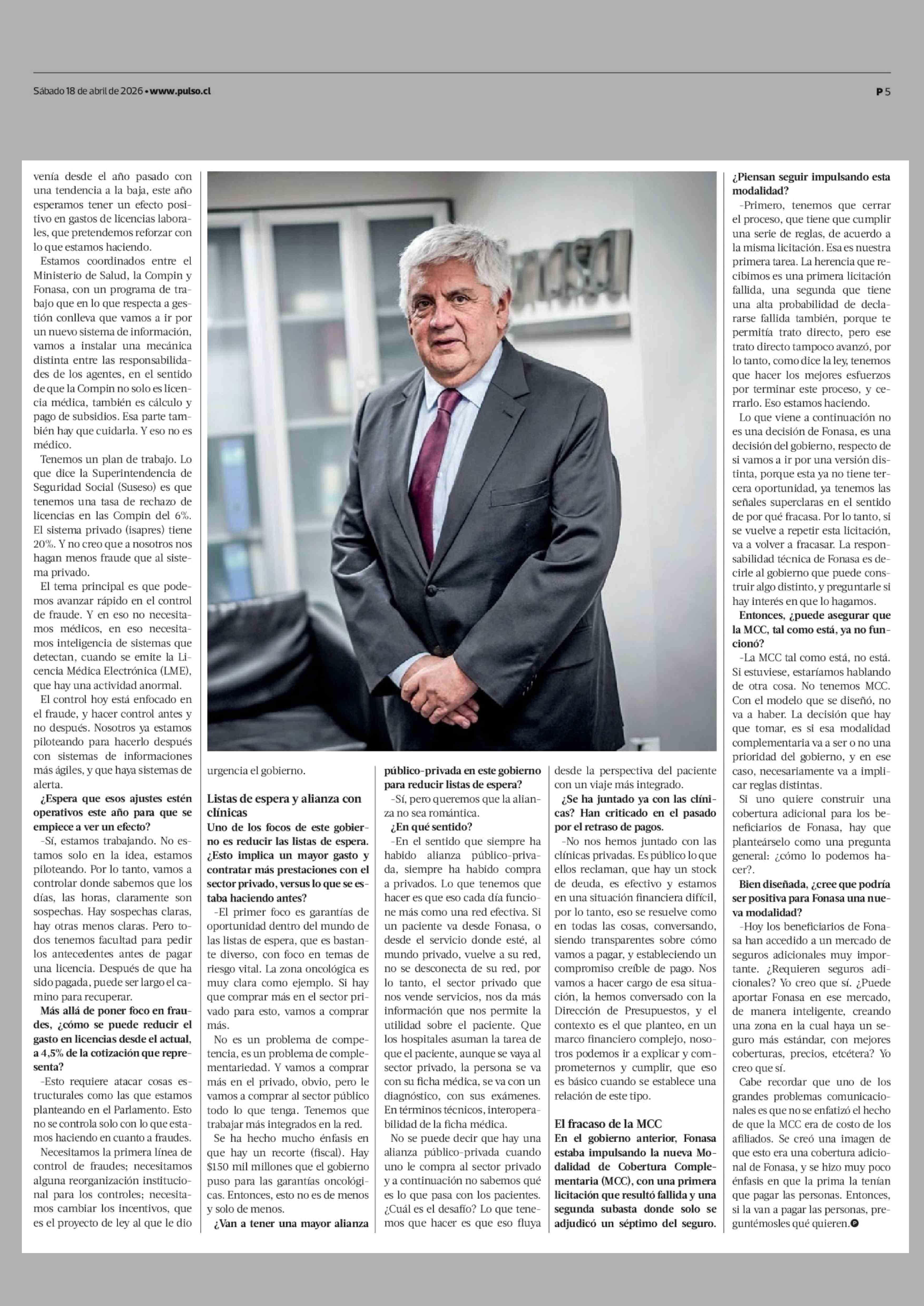 Título: César Oyarzo y foco de su gestión en Fonasa: "Hay que lograr un restablecimiento de los equilibrios financieros que están rotos"
