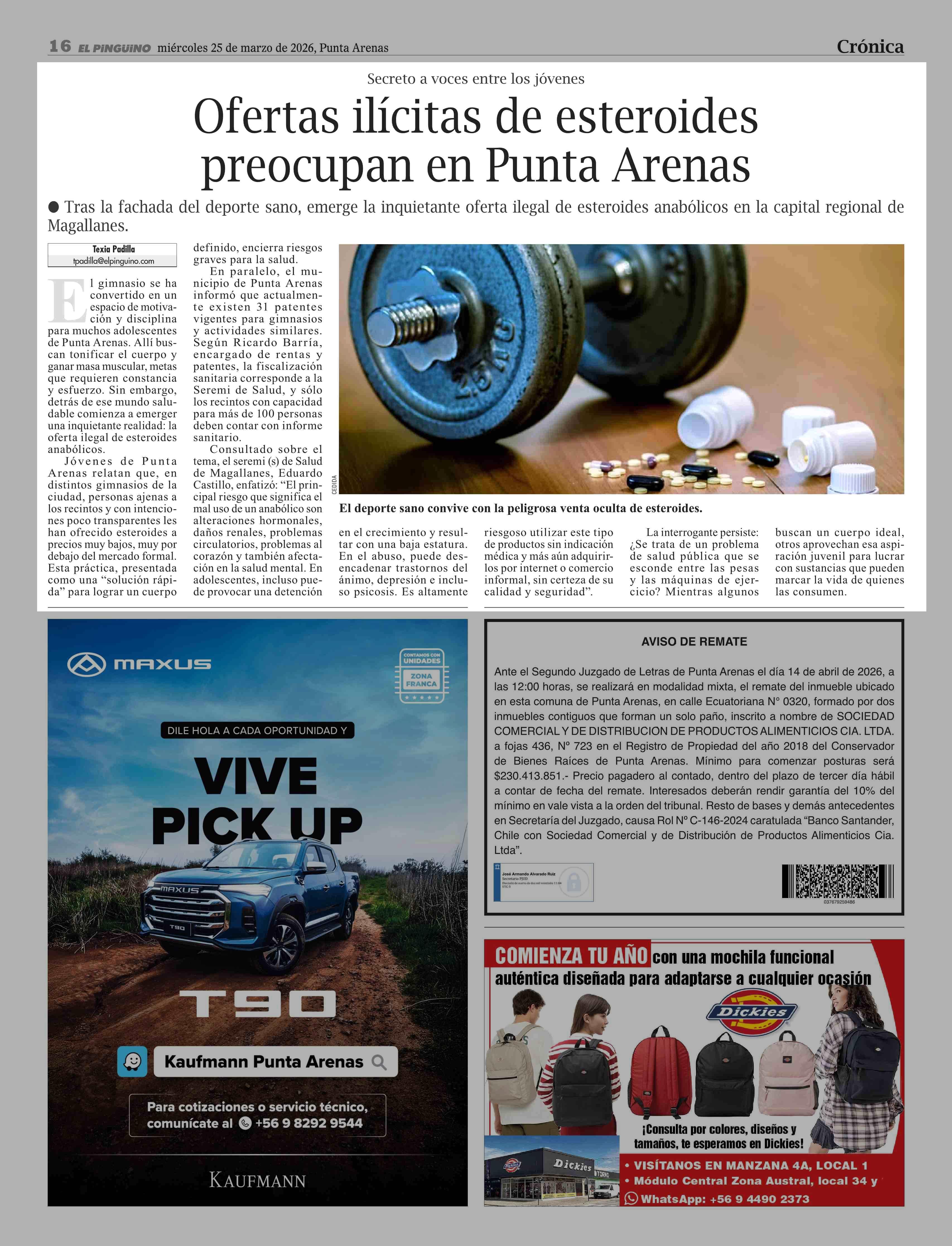 Ofertas ilícitas de esteroides preocupan en Punta Arenas 25-03-2026 El Pingüino |