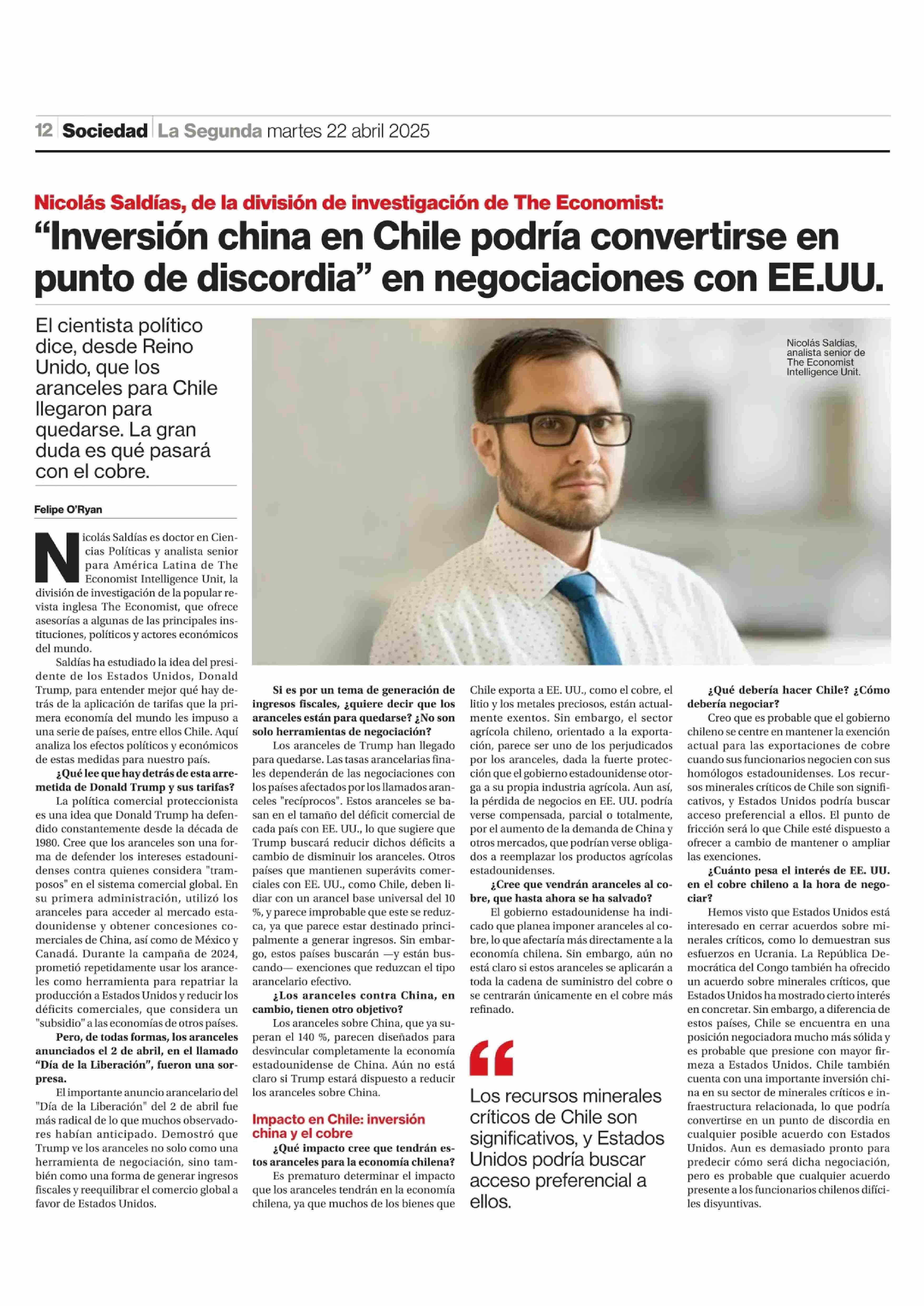 "Inversión china en Chile podría convertirse en punto de discordia" en negociaciones con EE.UU. 22-04-2025 La Segunda |