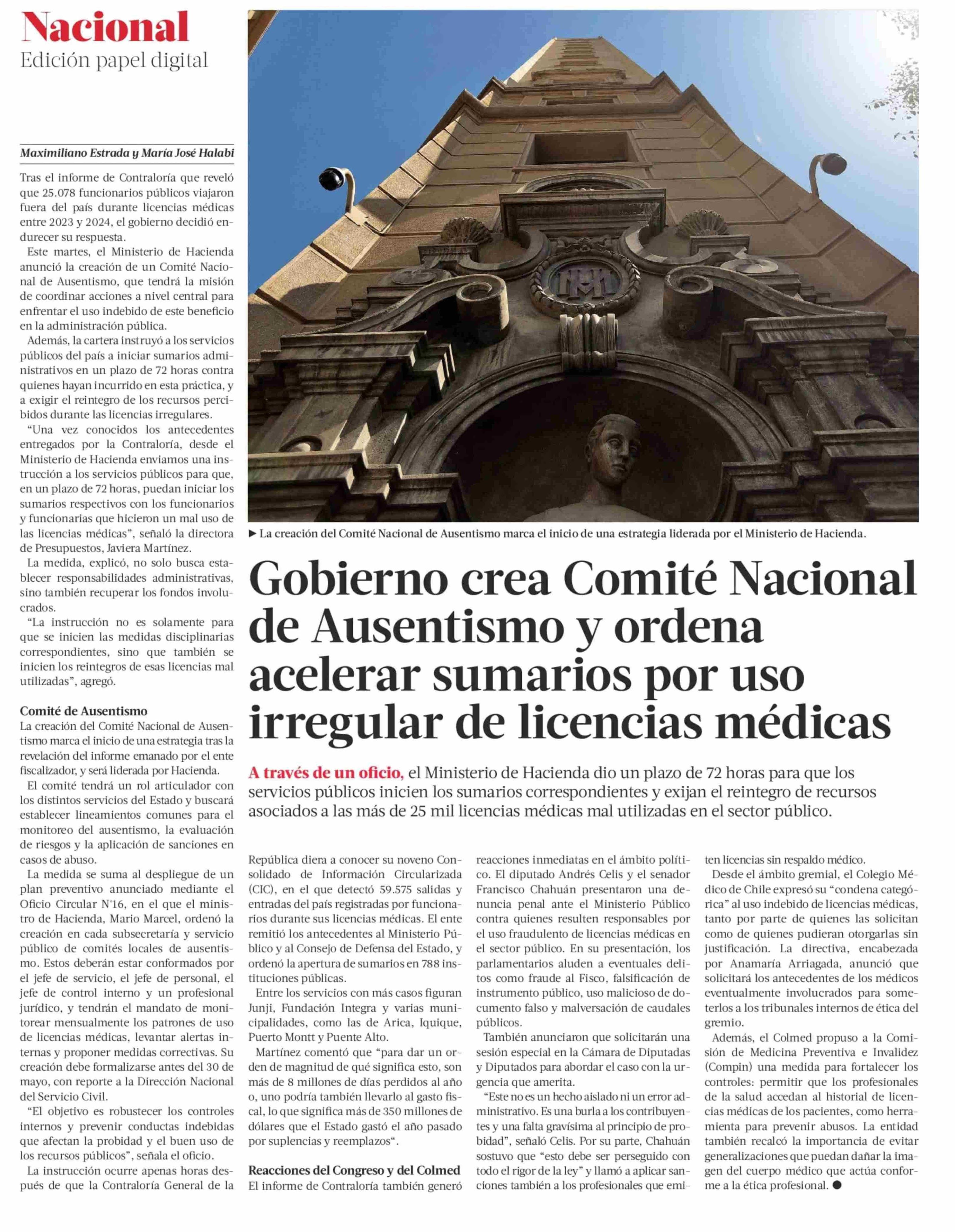 Gobierno crea Comité Nacional de Ausentismo y ordena acelerar sumarios por uso irregular de licencias médicas 22-05-2025 La Tercera |