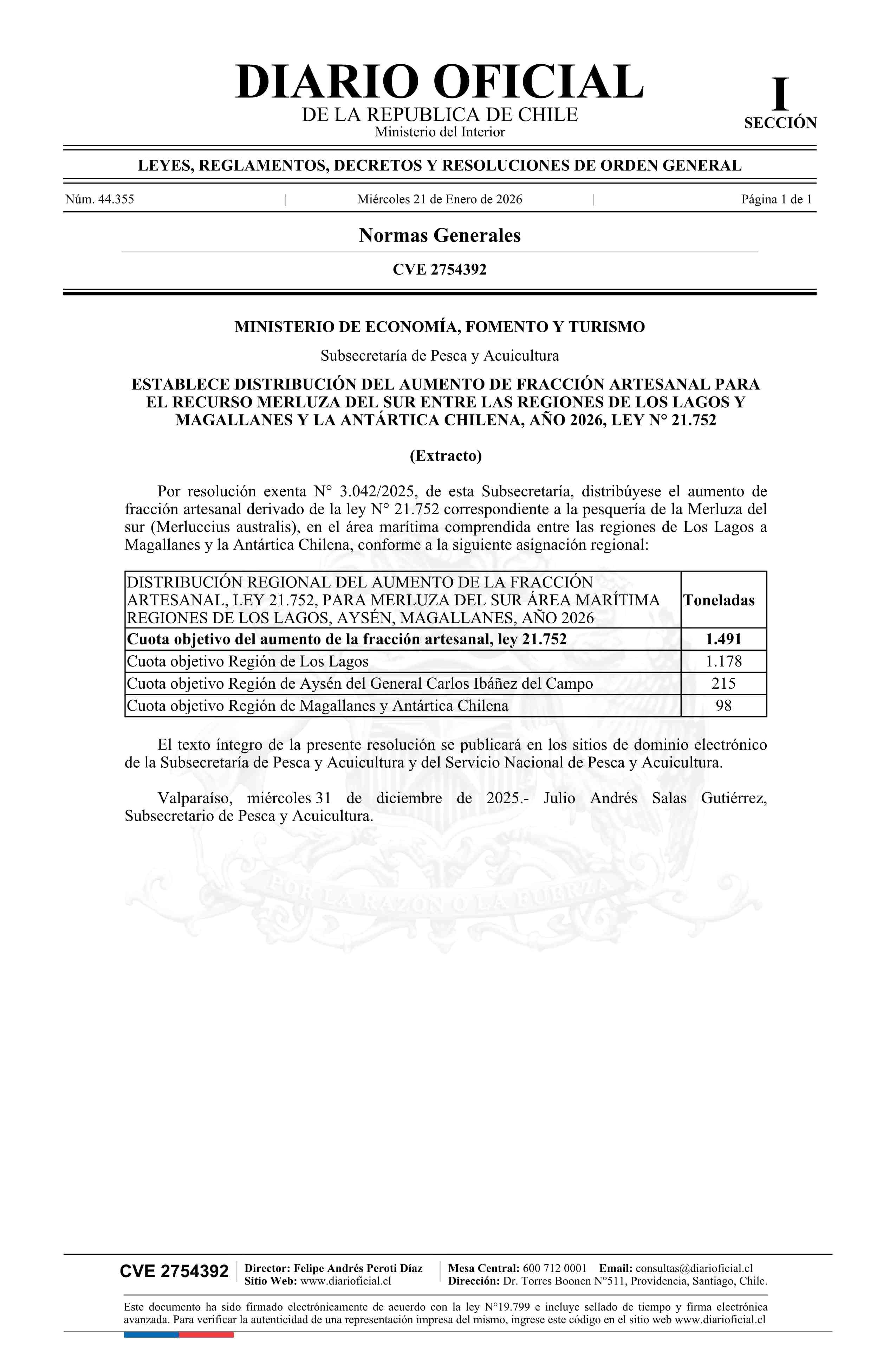 | Título: | Extracto de resolución exenta número 3.042, de 2025.- Establece distribución del aumento de fracción artesanal para el recurso Merluza del sur entre las regiones de Los Lagos y Magallanes y la Antártica Chilena, año 2026, ley N° 21.752 |