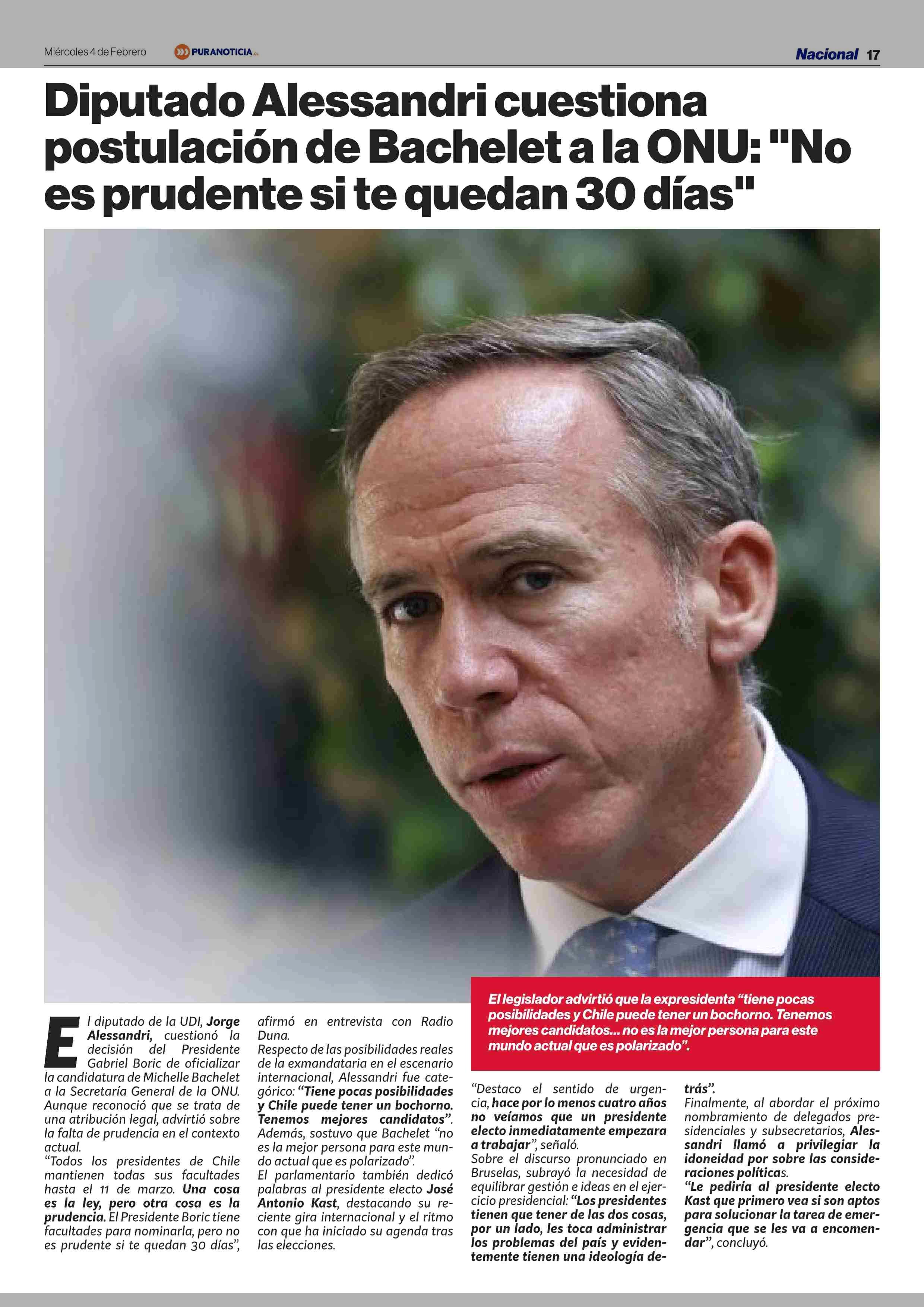 Título: Diputado Alessandri cuestiona de Bachelet a la ONU: “No es prudente si te quedan 30 días”