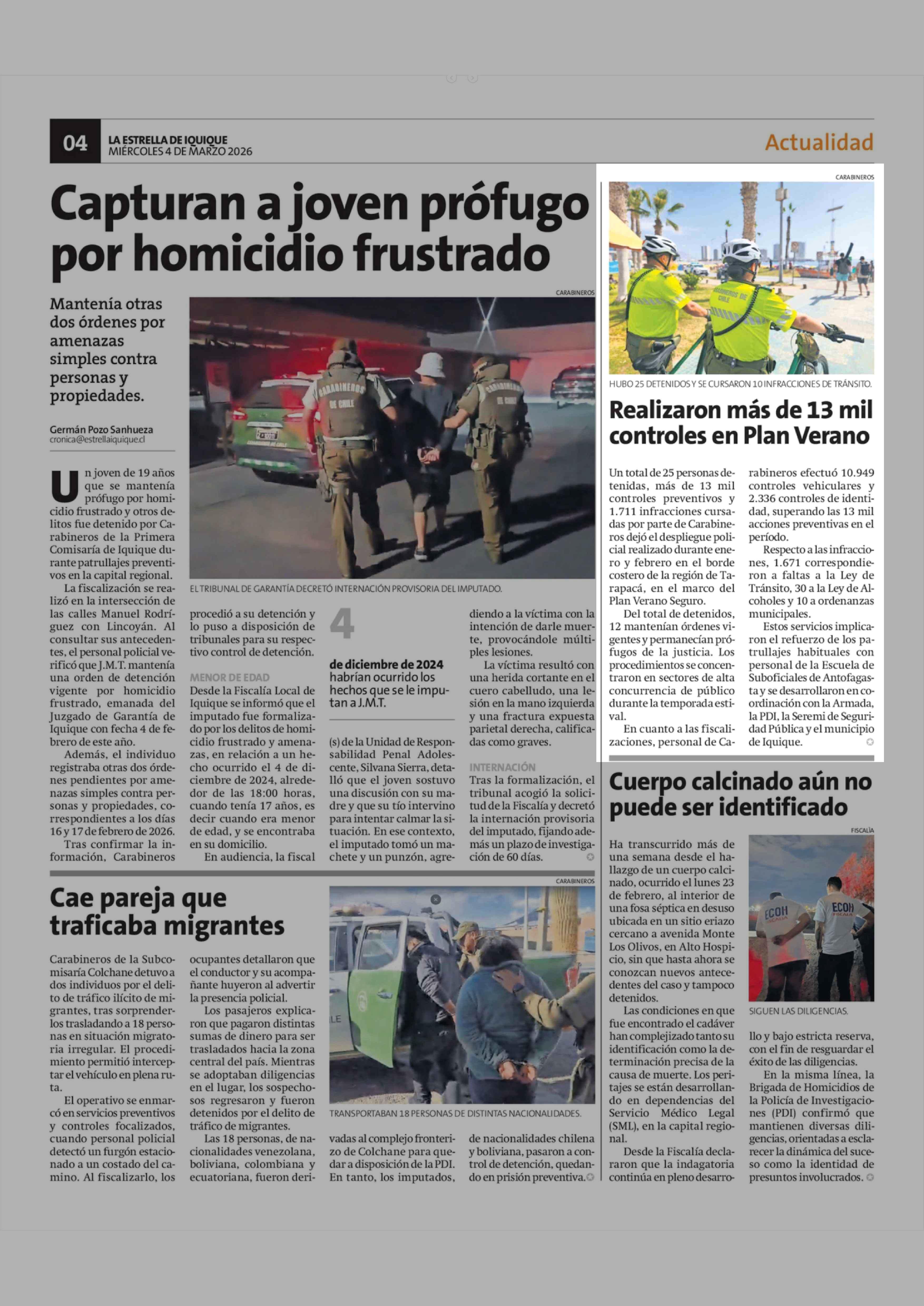 Realizaron más de 13 mil controles en Plan Verano 04-03-2026 La Estrella de Iquique |