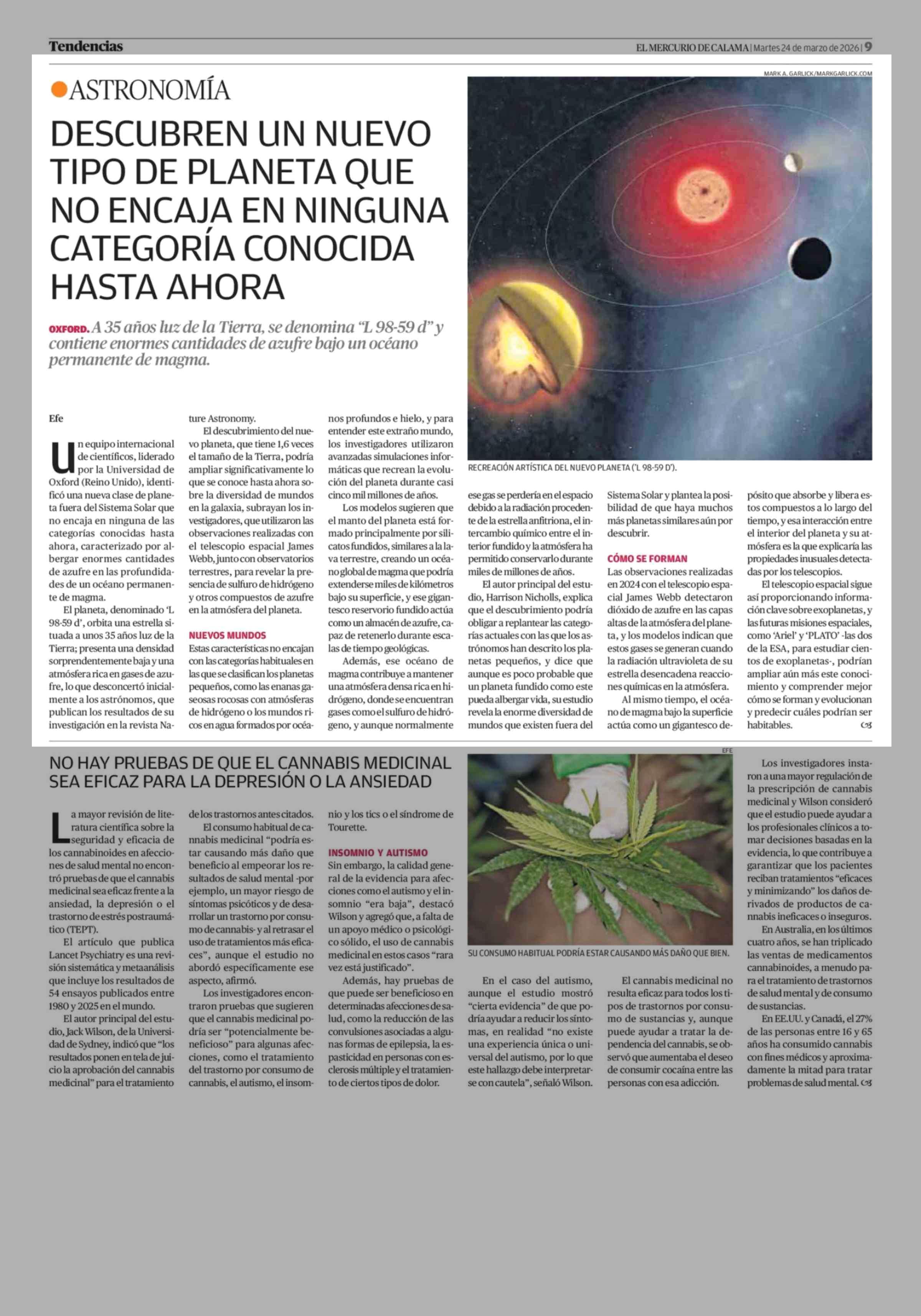 DESCUBREN UN NUEVO TIPO DE PLANETA QUE NO ENCAJA EN NINGUNA CATEGORÍA CONOCIDA HASTA AHORA 24-03-2026 El Mercurio de Calama |
