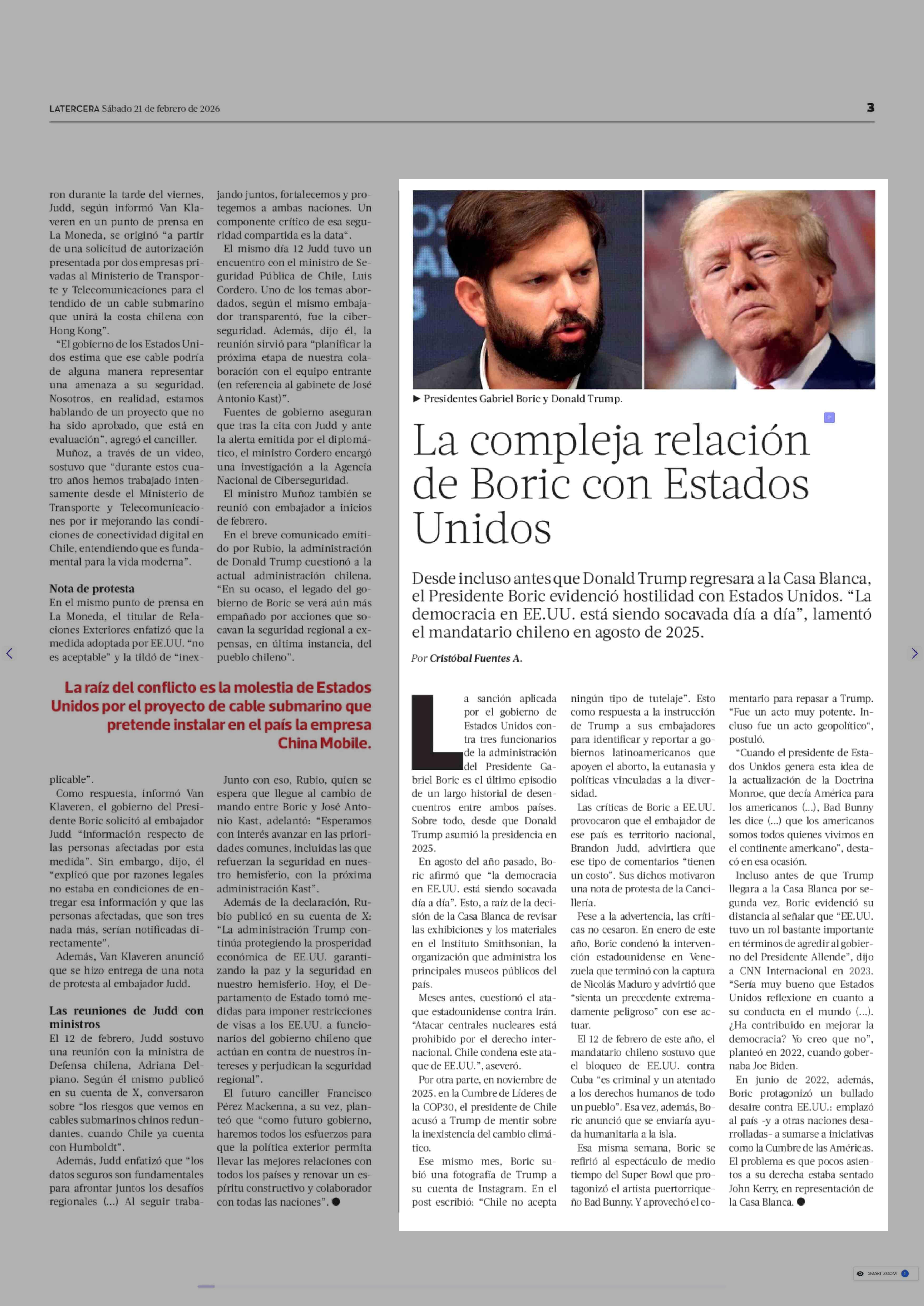 La compleja relación de Boric con Estados Unidos 21-02-2026 La Tercera |