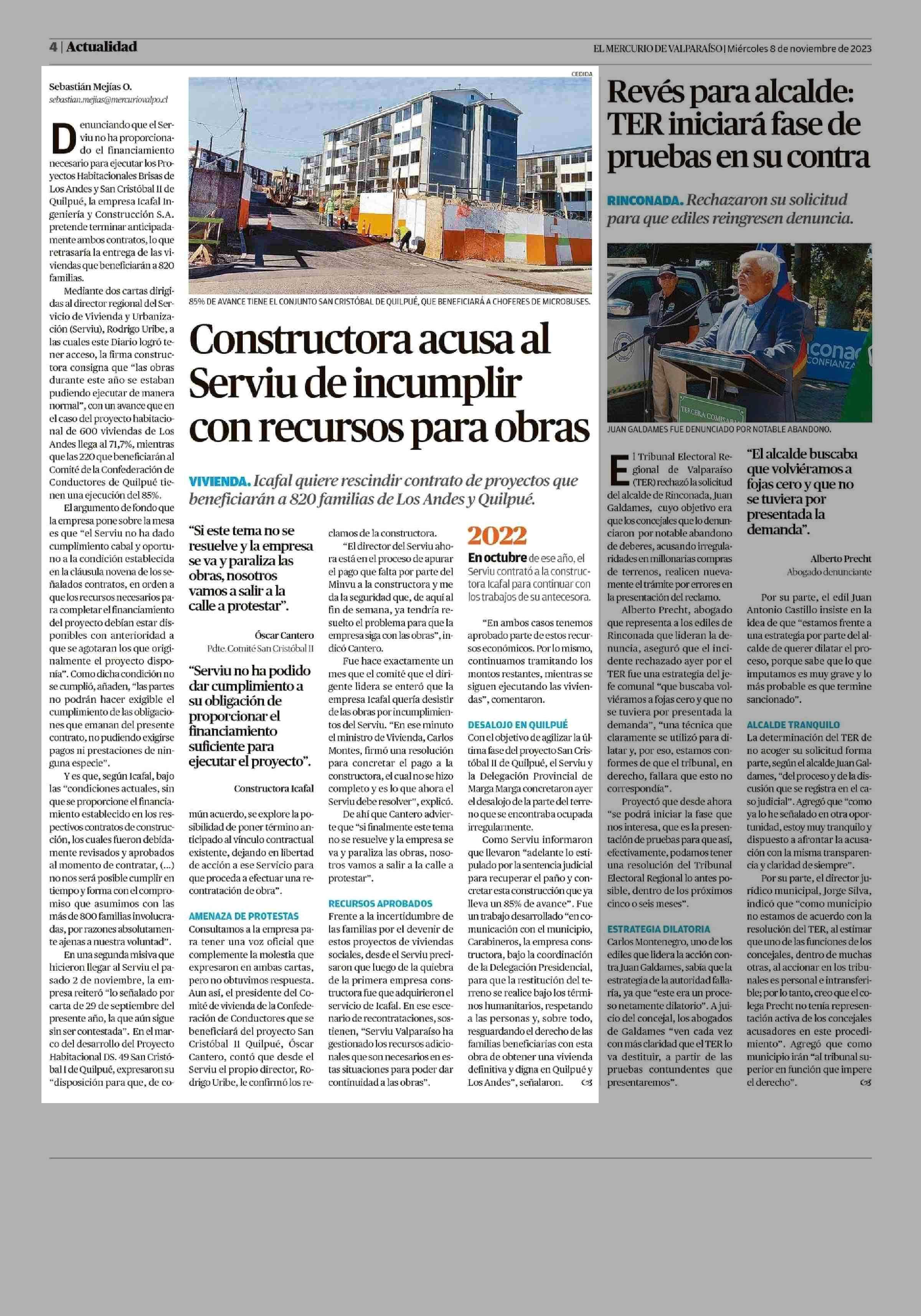 Constructora acusa al Serviu de incumplir con recursos para obras 08-11-2023 El Mercurio de Valparaíso |