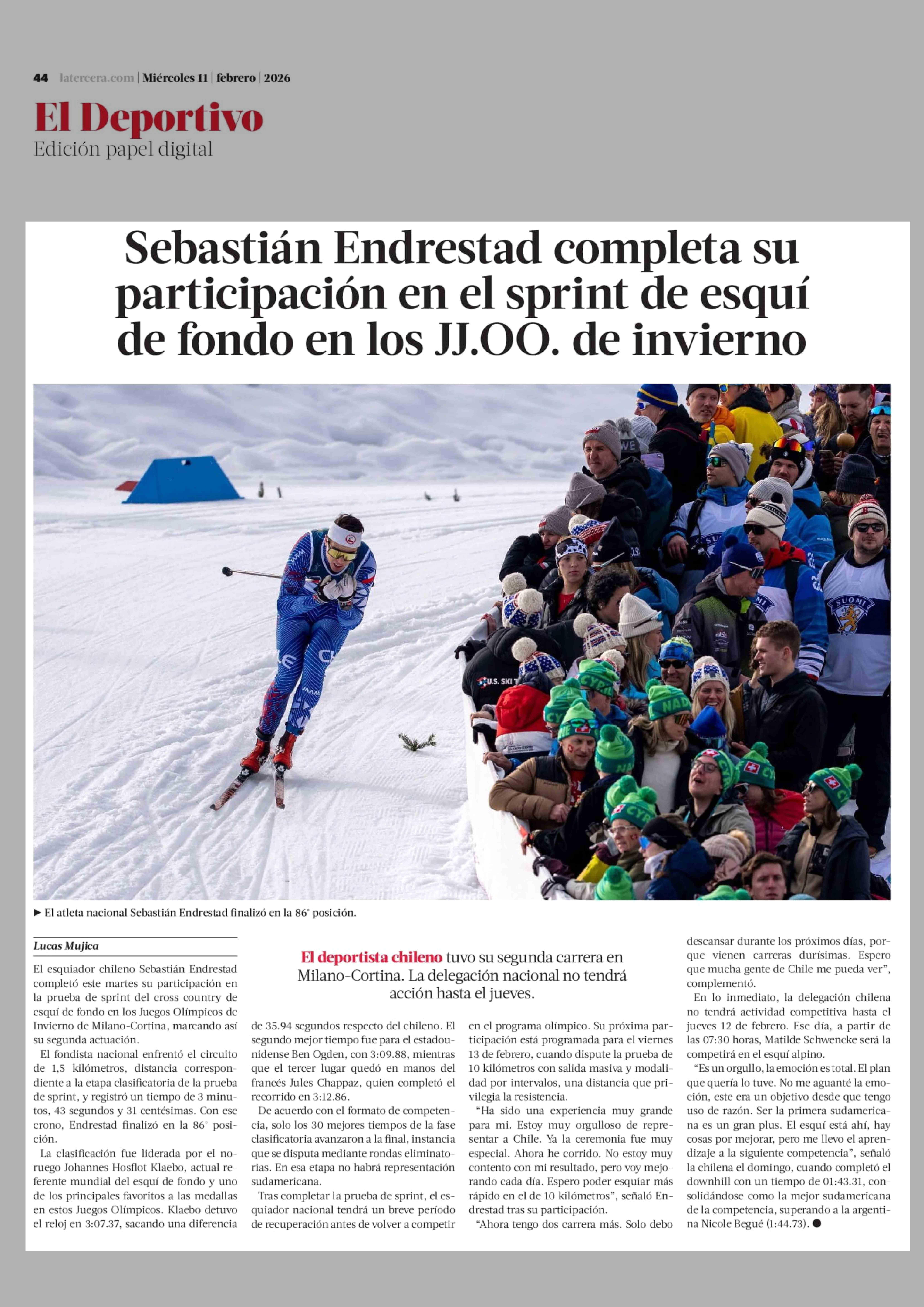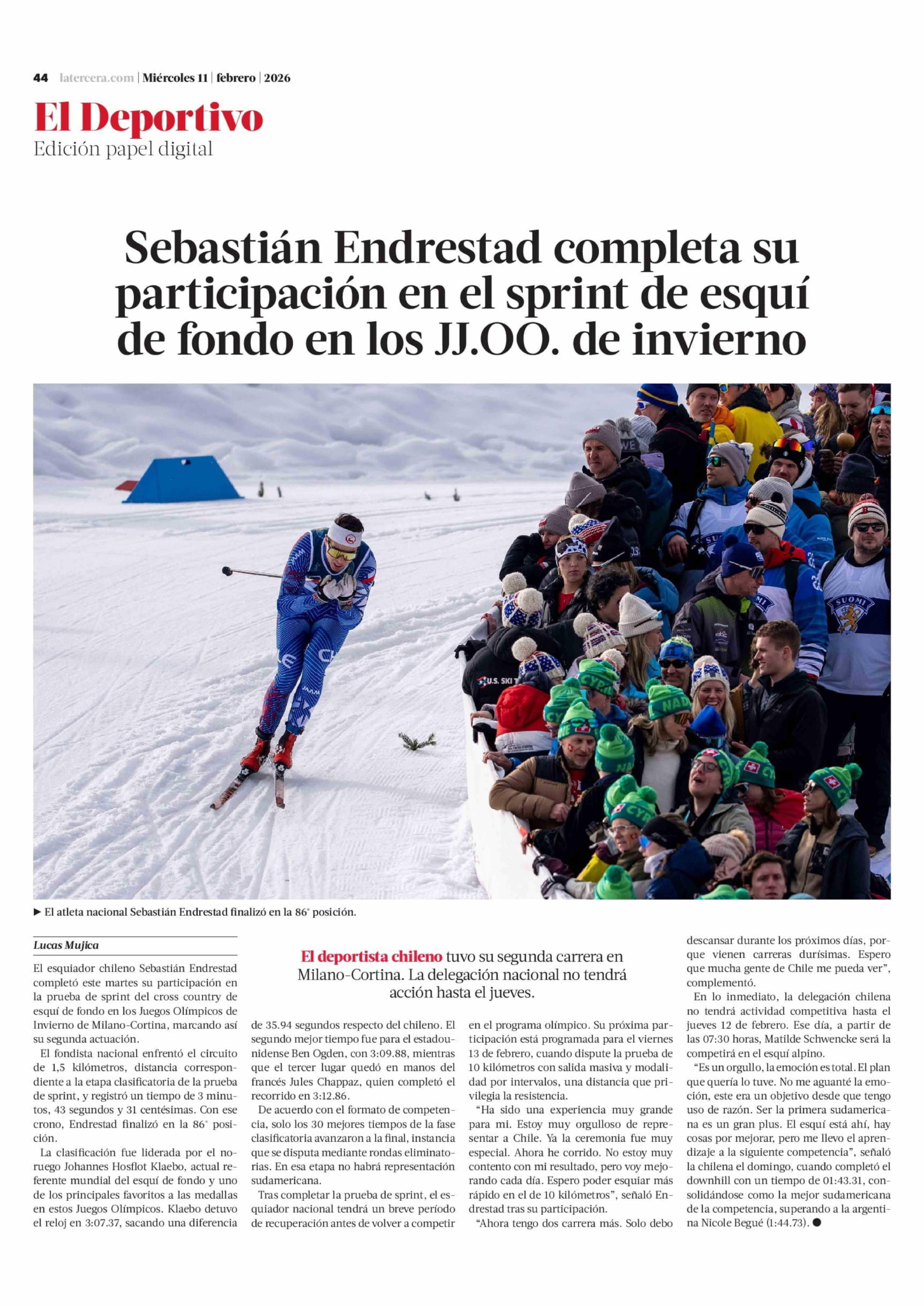 Sebastián Endrestad completa su participación en el sprint de esquí de fondo en los JJ.OO. de invierno 11-02-2026 La Tercera |
