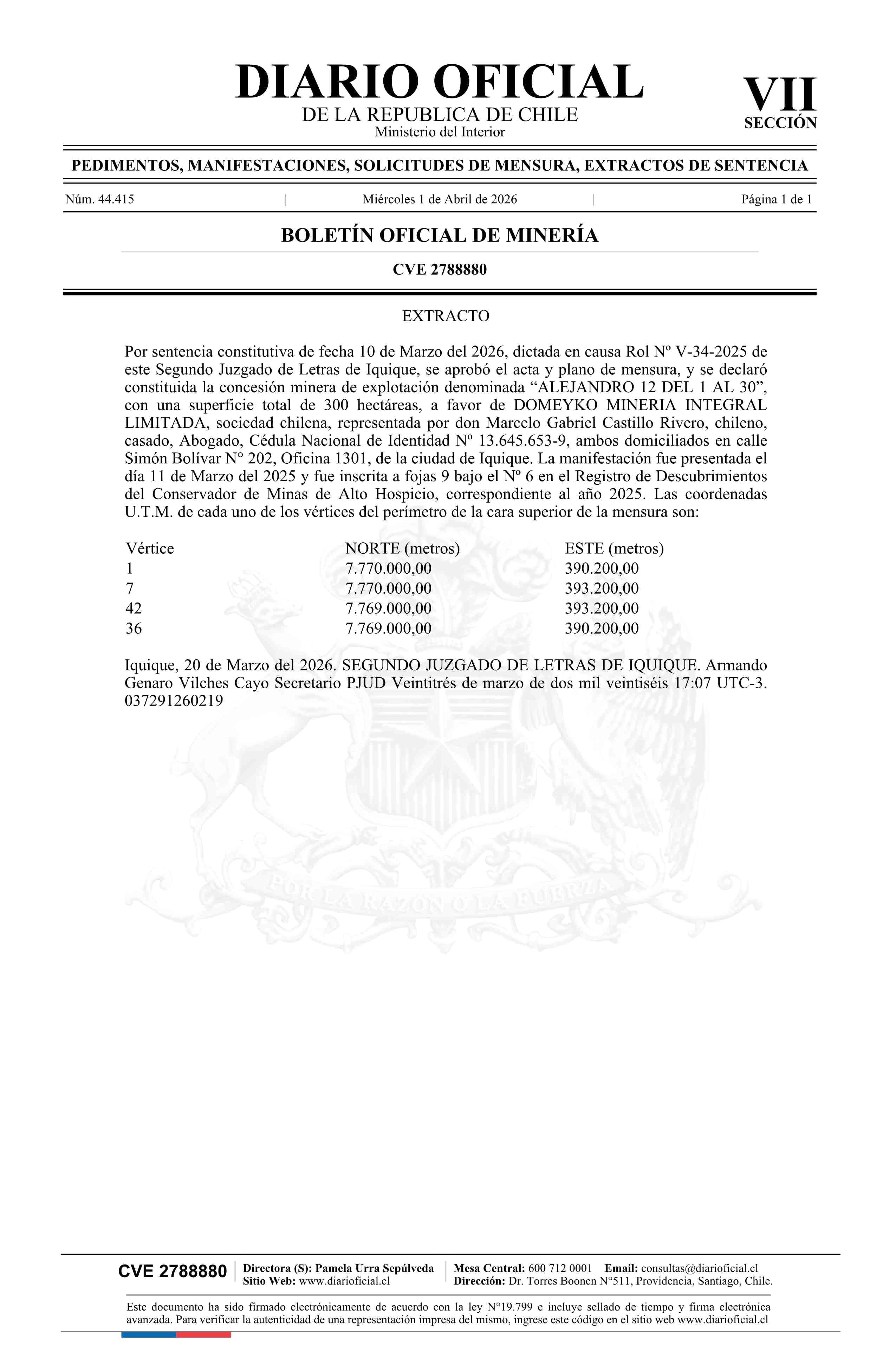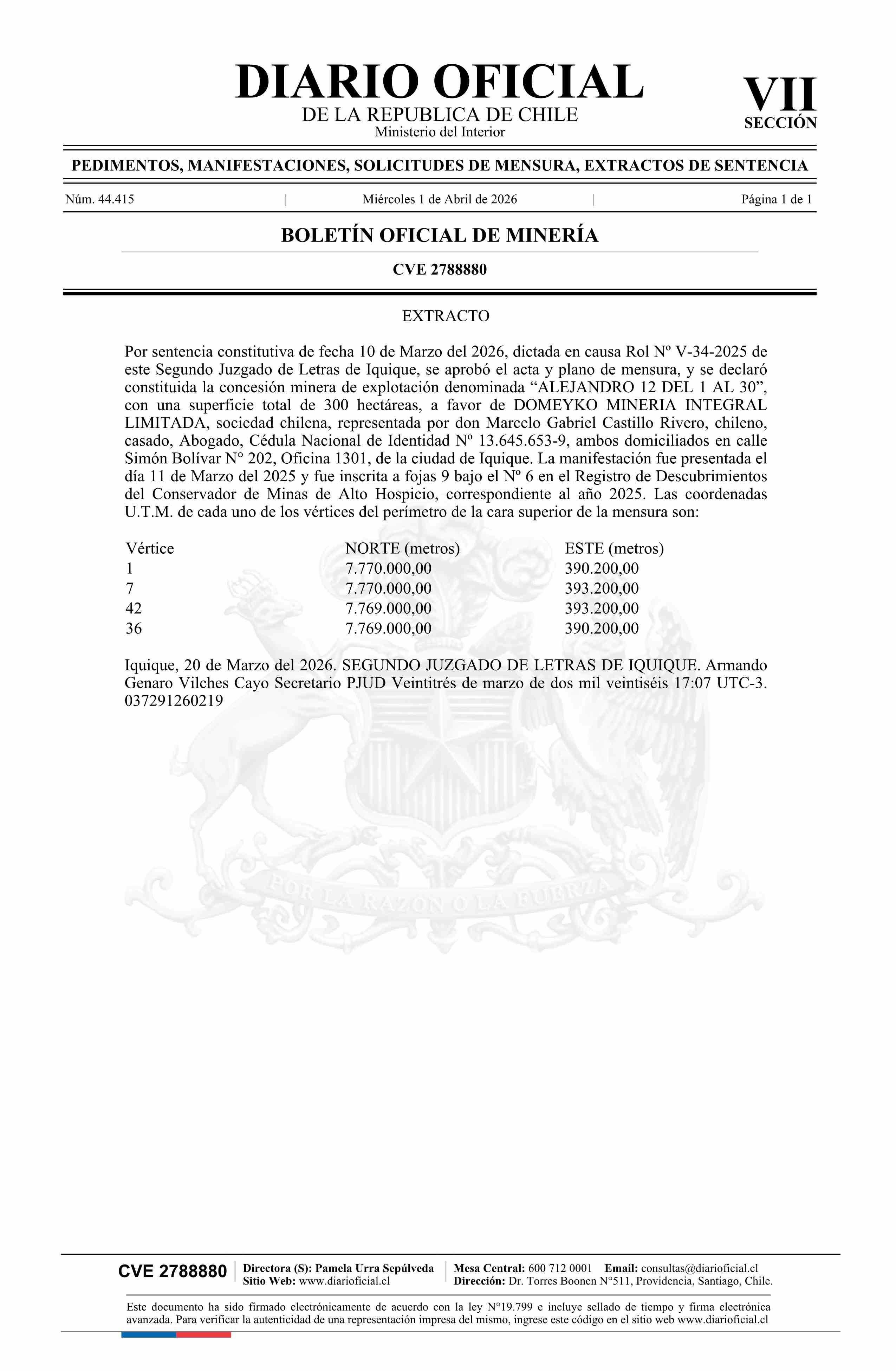 ALEJANDRO 12 DEL 1 AL 30 / Domeyko Minería Integral Limitada 01-04-2026 DIARIO OFICIAL CHILE - BOLETÍN OFICIAL DE MINERÍA |