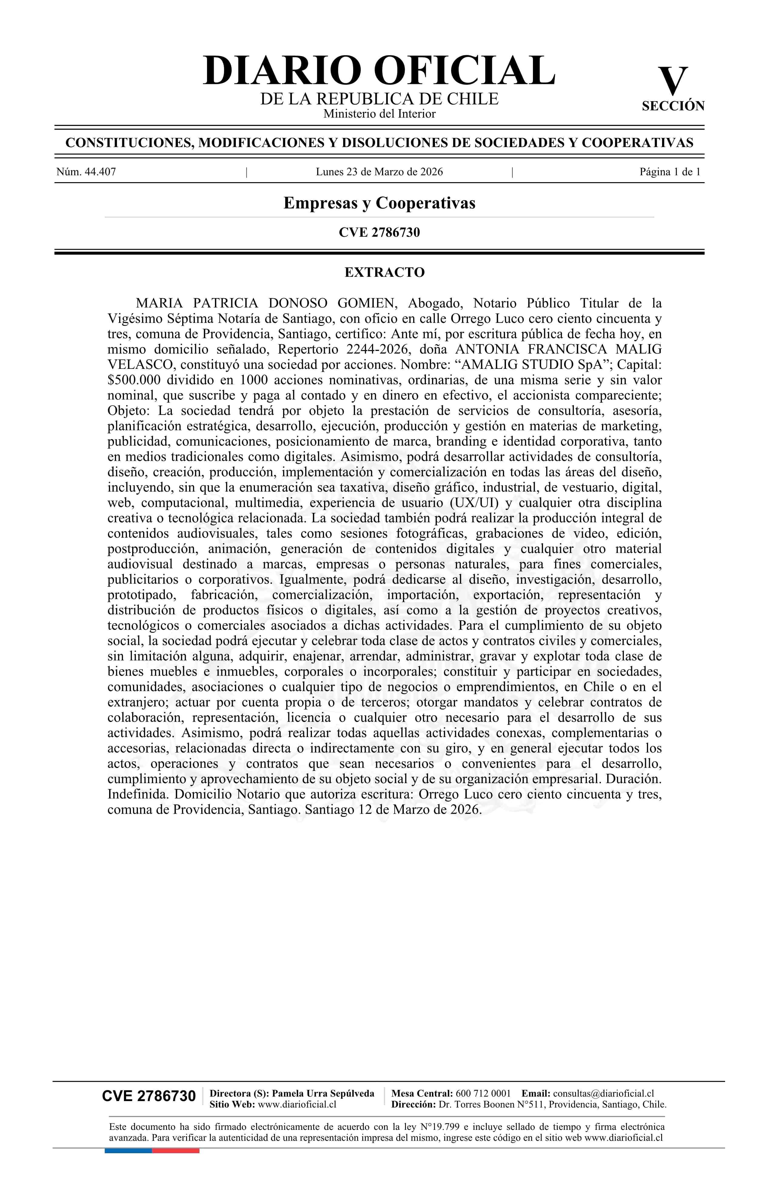 Amalig Studio SpA 23-03-2026 Diario Oficial Edición Electrónica |