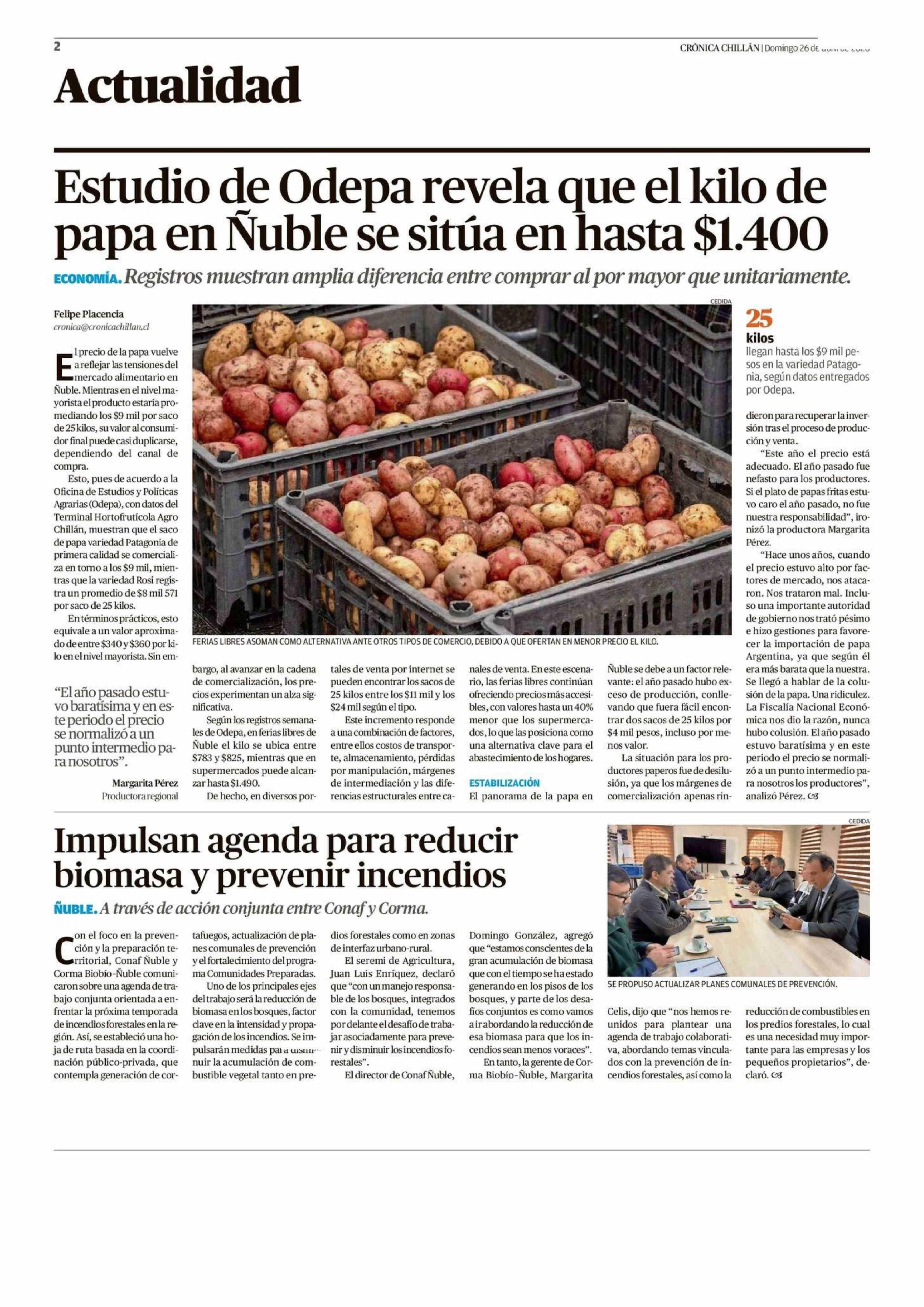 Estudio de Odepa revela que el kilo de papa en Nuble se sitúa en hasta $1.400 26-04-2026 Crónica de Chillán |