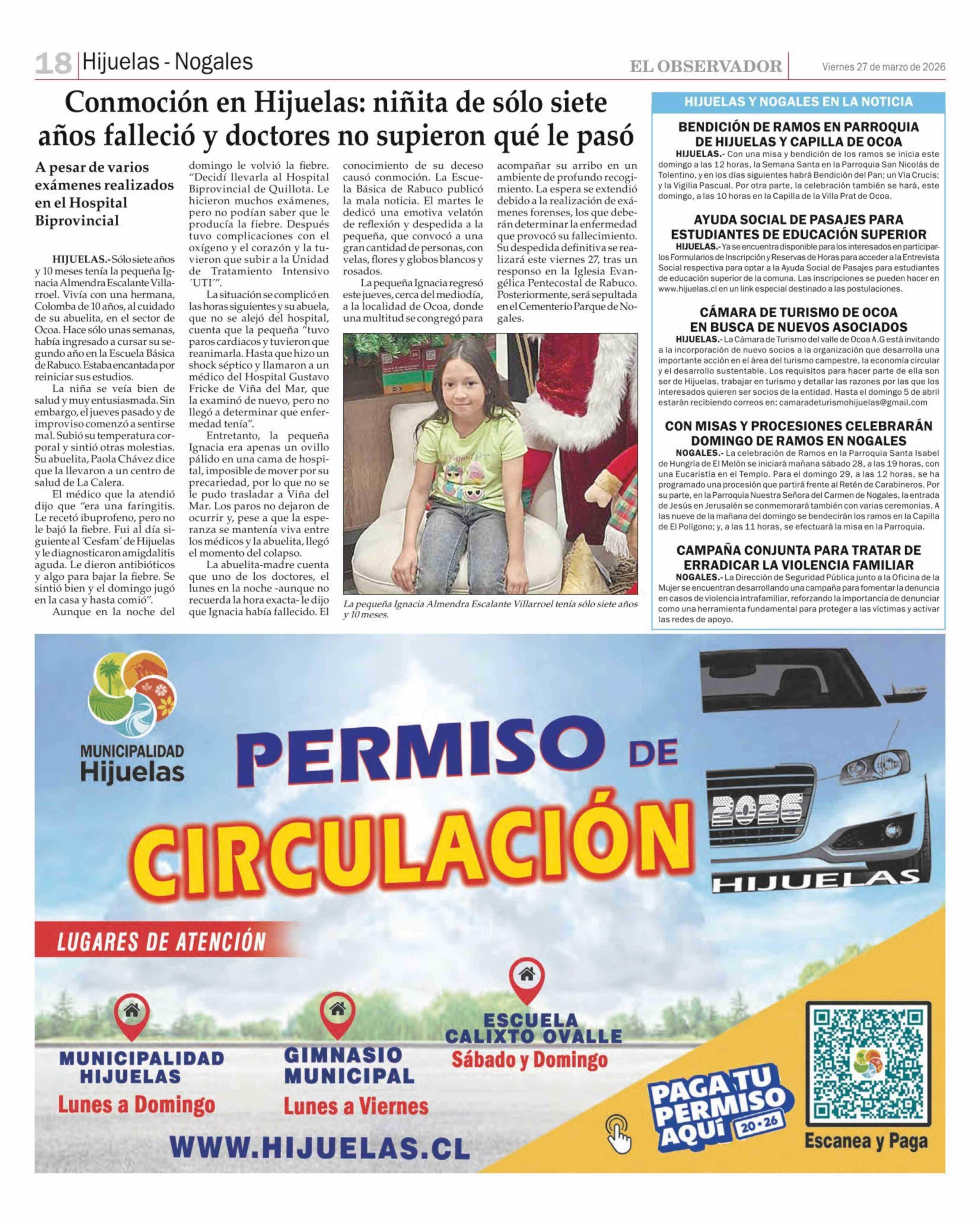 Conmoción en Hijuelas: niñita de sólo siete años falleció y doctores no supieron qué le pasó 27-03-2026 El Observador |