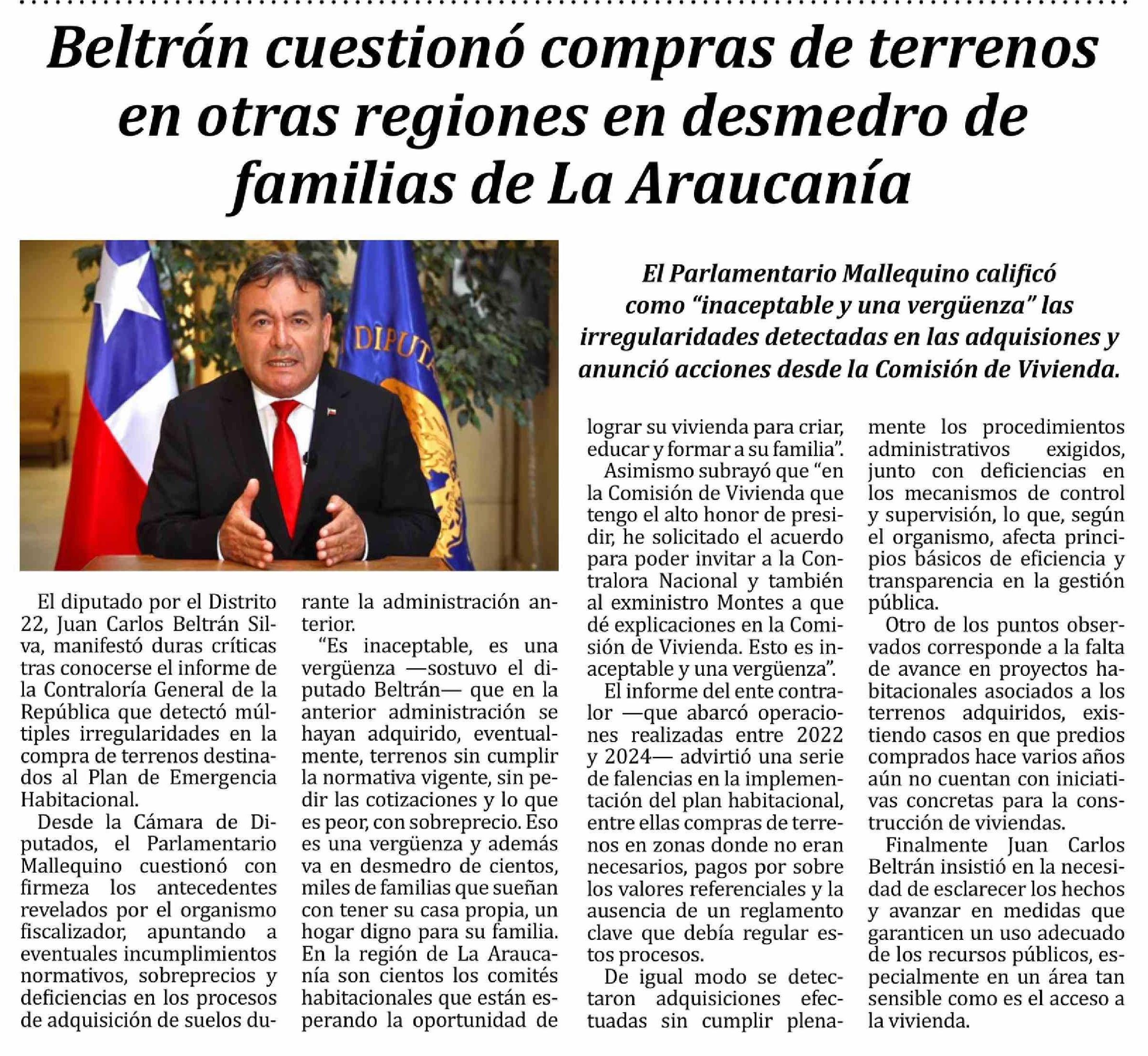 | Título: | Beltrán cuestionó compras de terrenos en otras regiones en desmedro de familias de La Araucania |