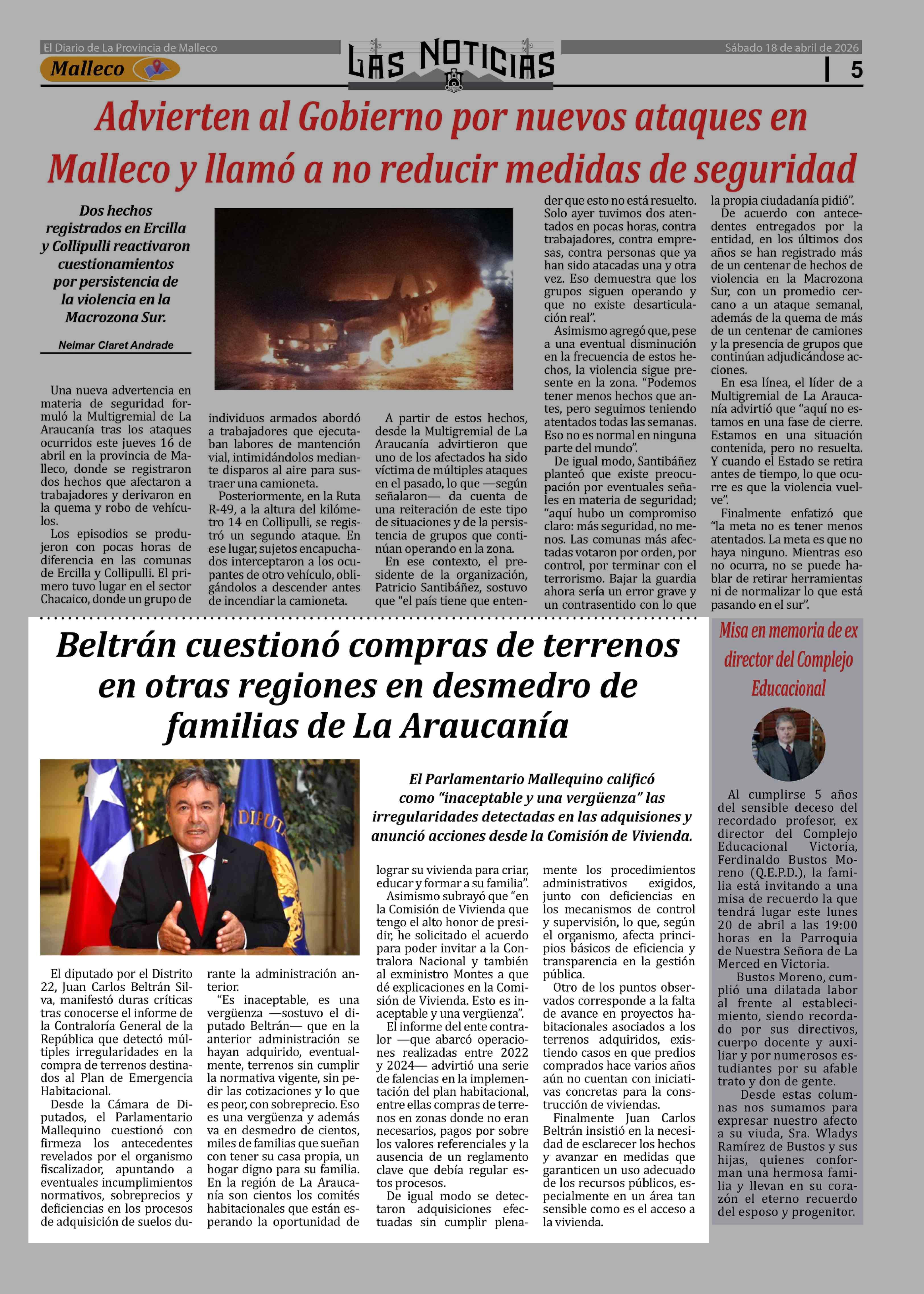 Beltrán cuestionó compras de terrenos en otras regiones en desmedro de familias de La Araucania 18-04-2026 Las Noticias |