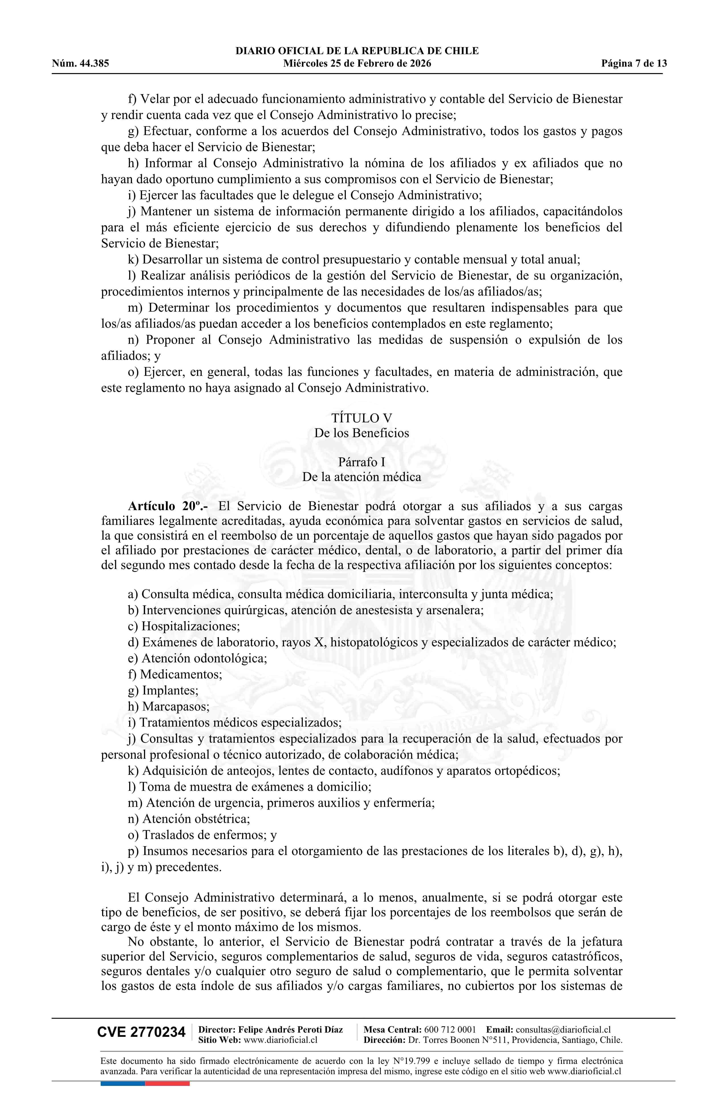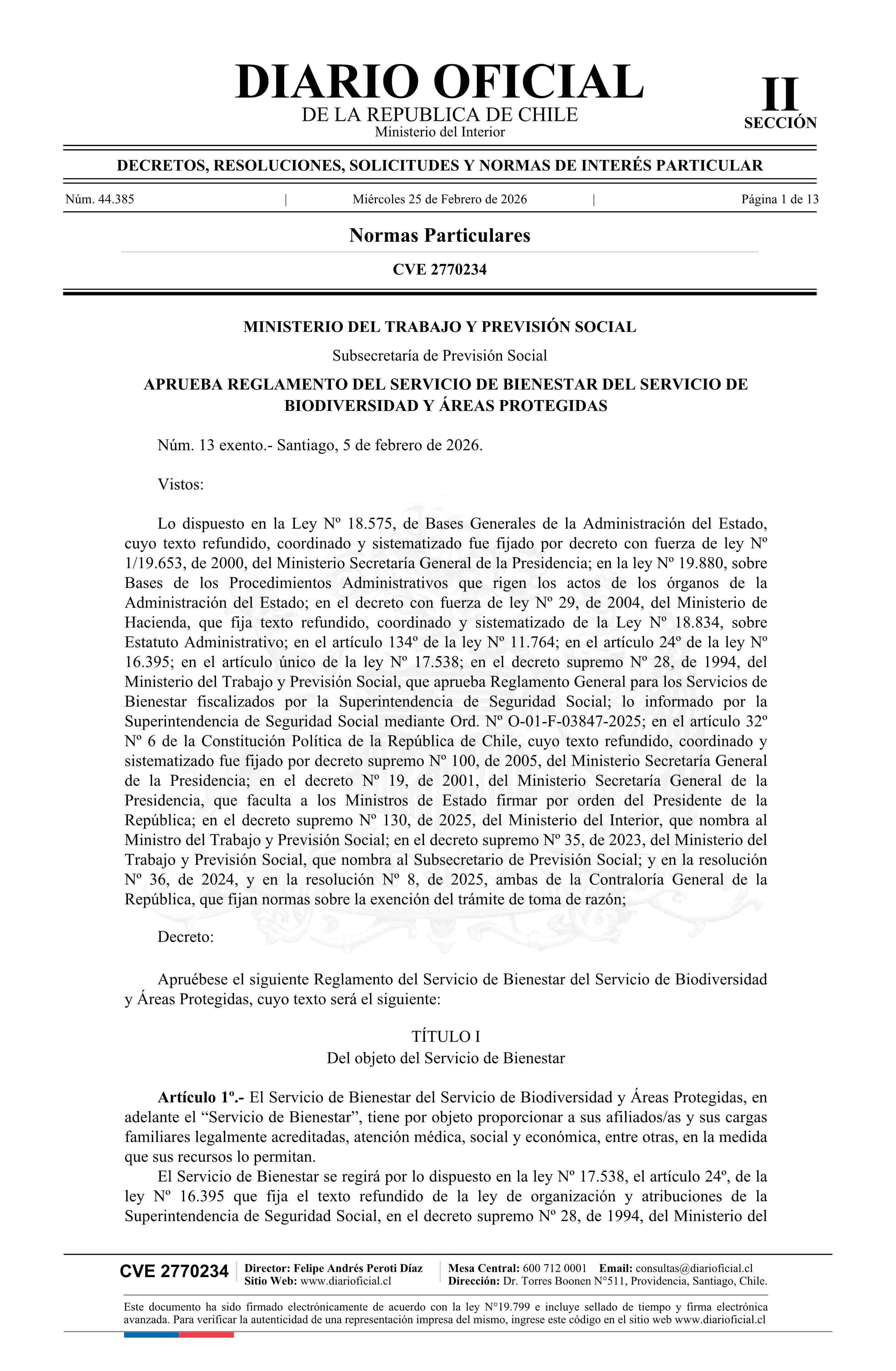 Título: Decreto exento número 13, de 2026.- Aprueba Reglamento del Servicio de Bienestar del Servicio de Biodiversidad y Áreas Protegidas