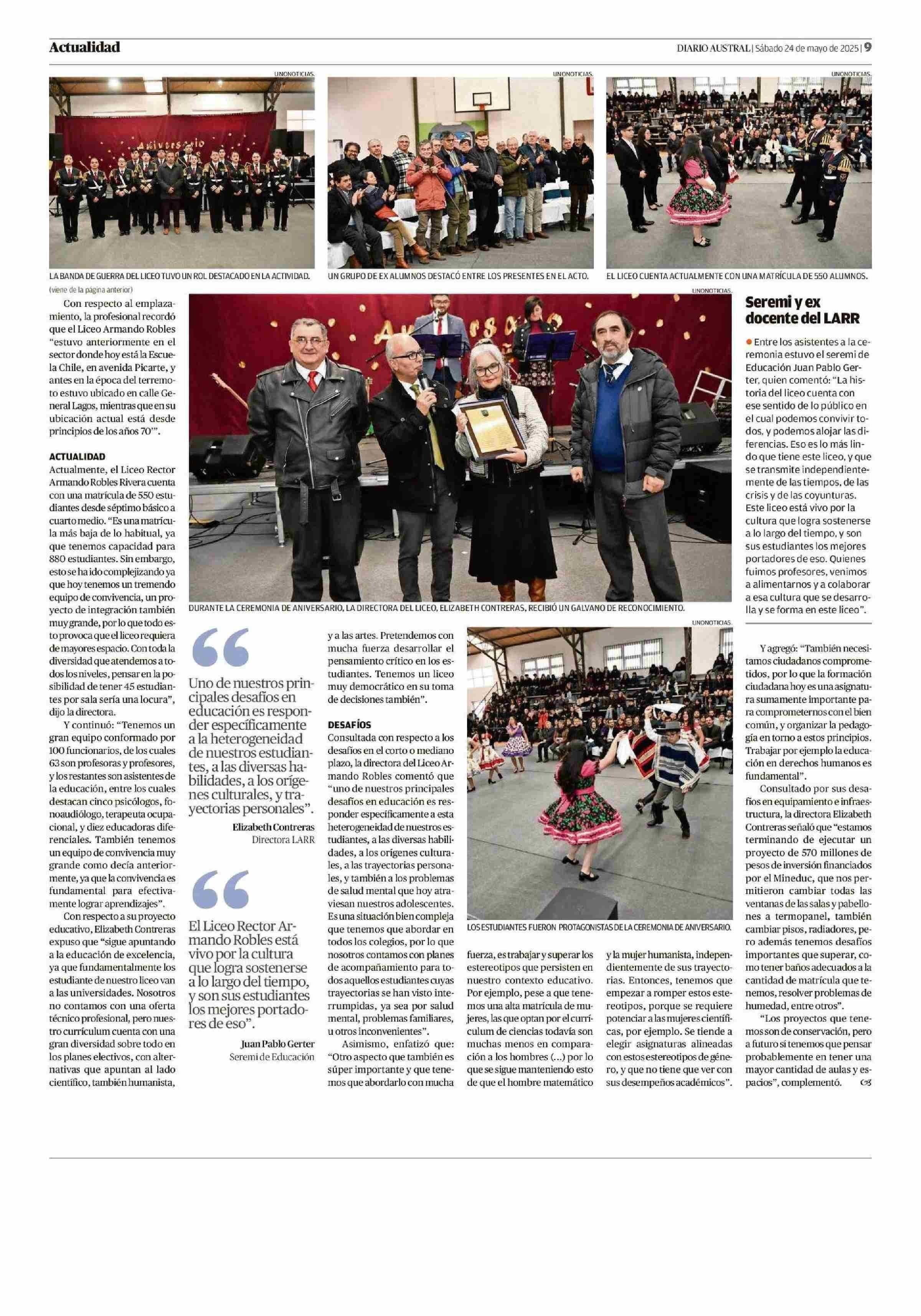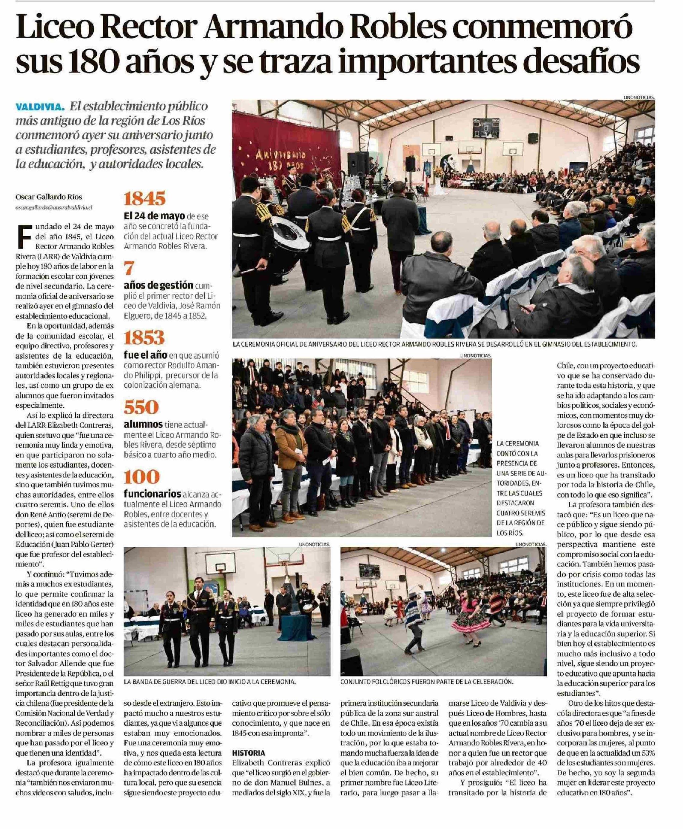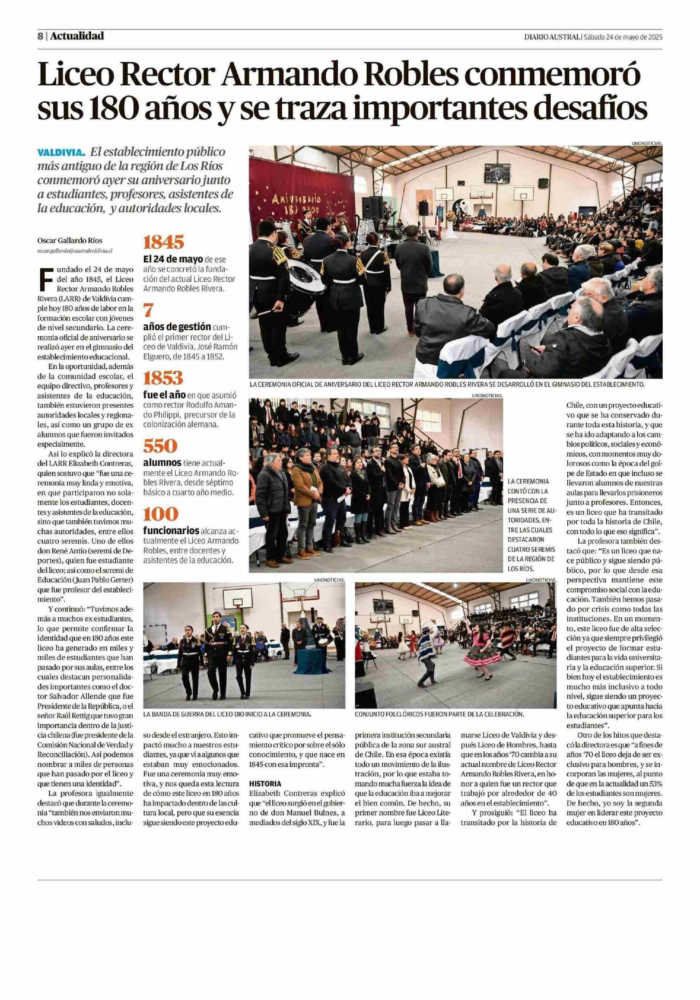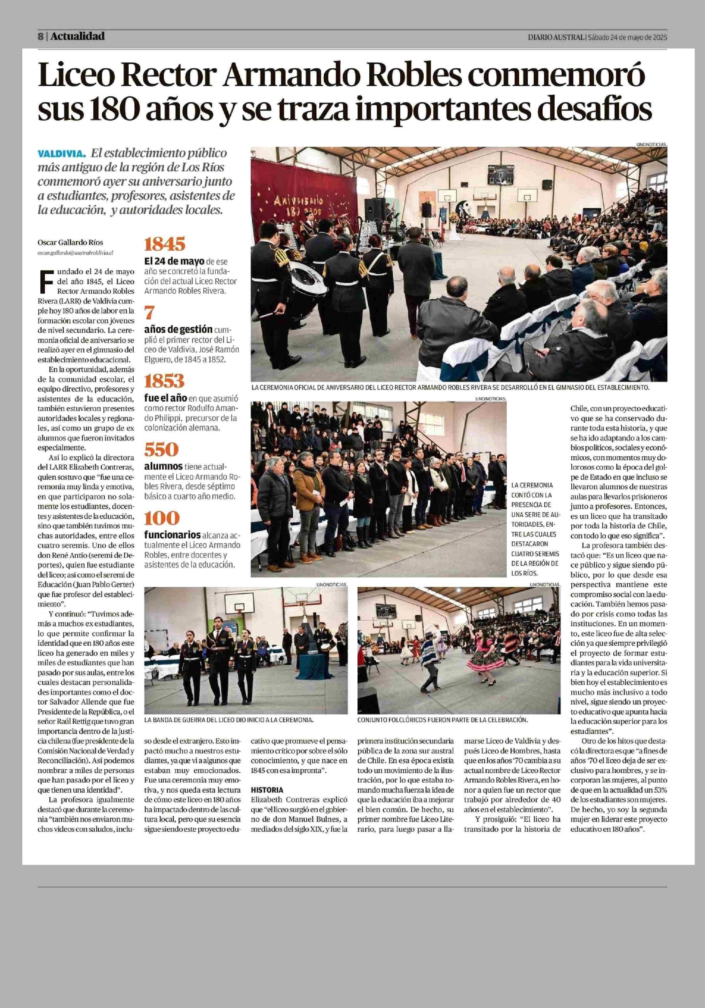 Liceo Rector Armando Robles conmemoró sus 180 años y se traza importantes desafíos 24-05-2025 Diario Austral Región de Los Ríos |