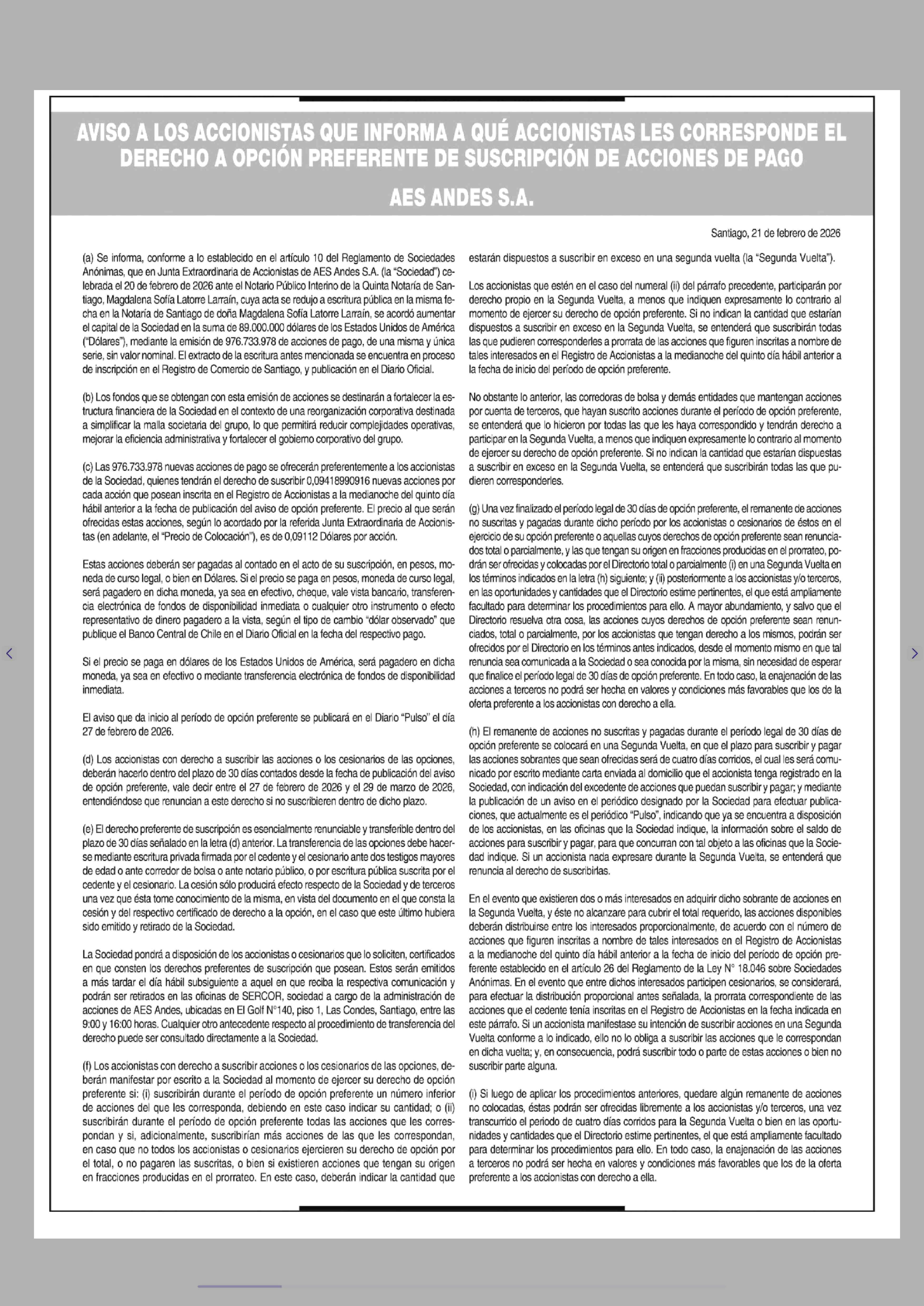 Extractos: AVISO A LOS ACCIONISTAS QUE INFORMA A QUÉ ACCIONISTAS LES CORRESPONDE EL DERECHO A OPCIÓN PREFERENTE DE SUSCRIPCIÓN DE ACCIONES DE PAGO 21-02-2026 La Tercera |