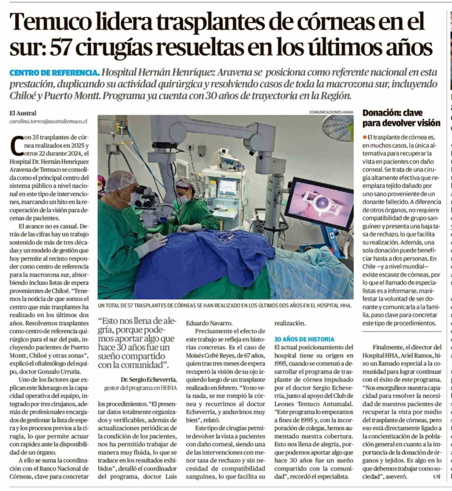 Temuco lidera trasplantes de córneas en el sur: 57 cirugías resueltas en los últimos años 13-04-2026 El Austral de la Araucanía |