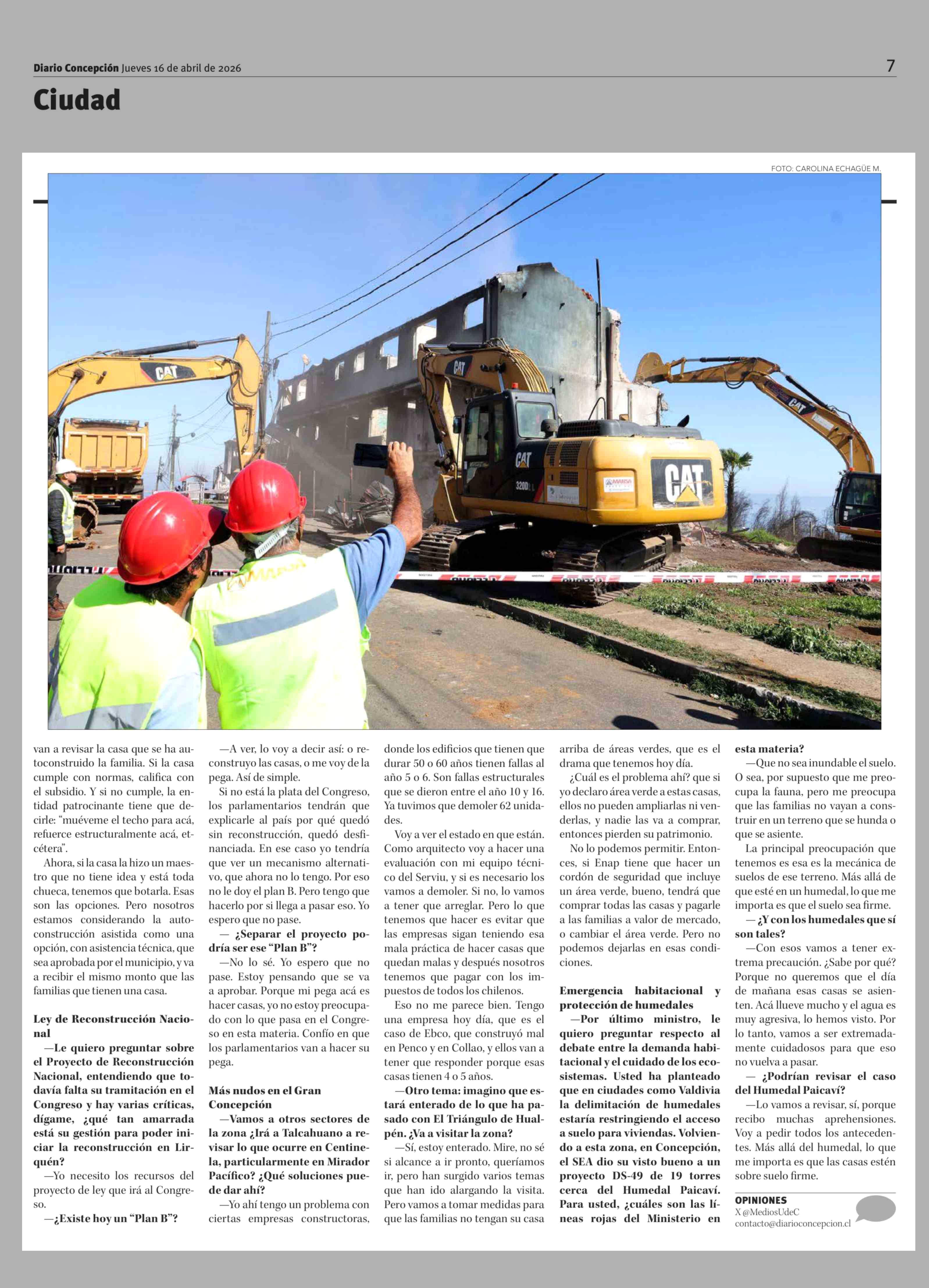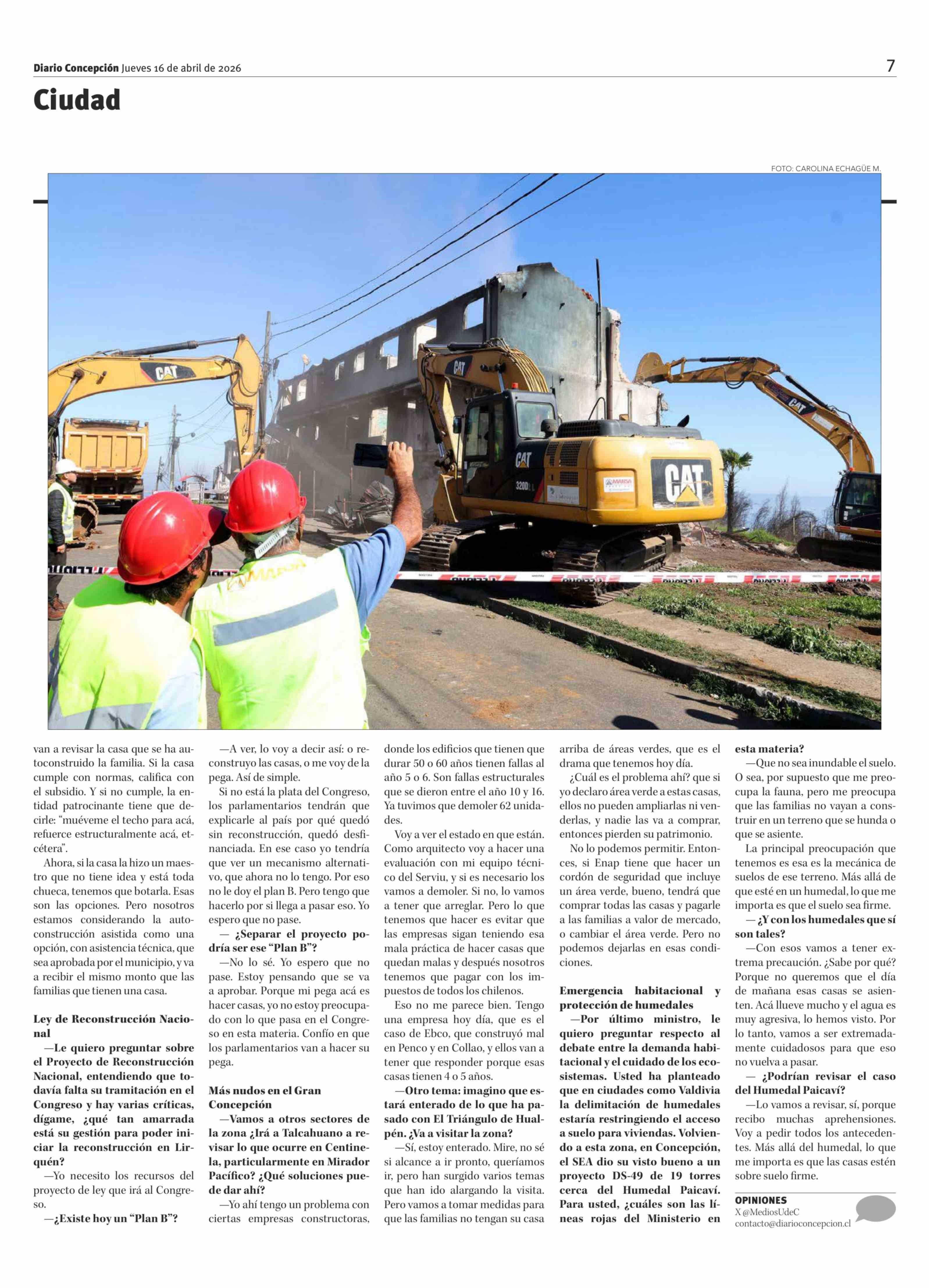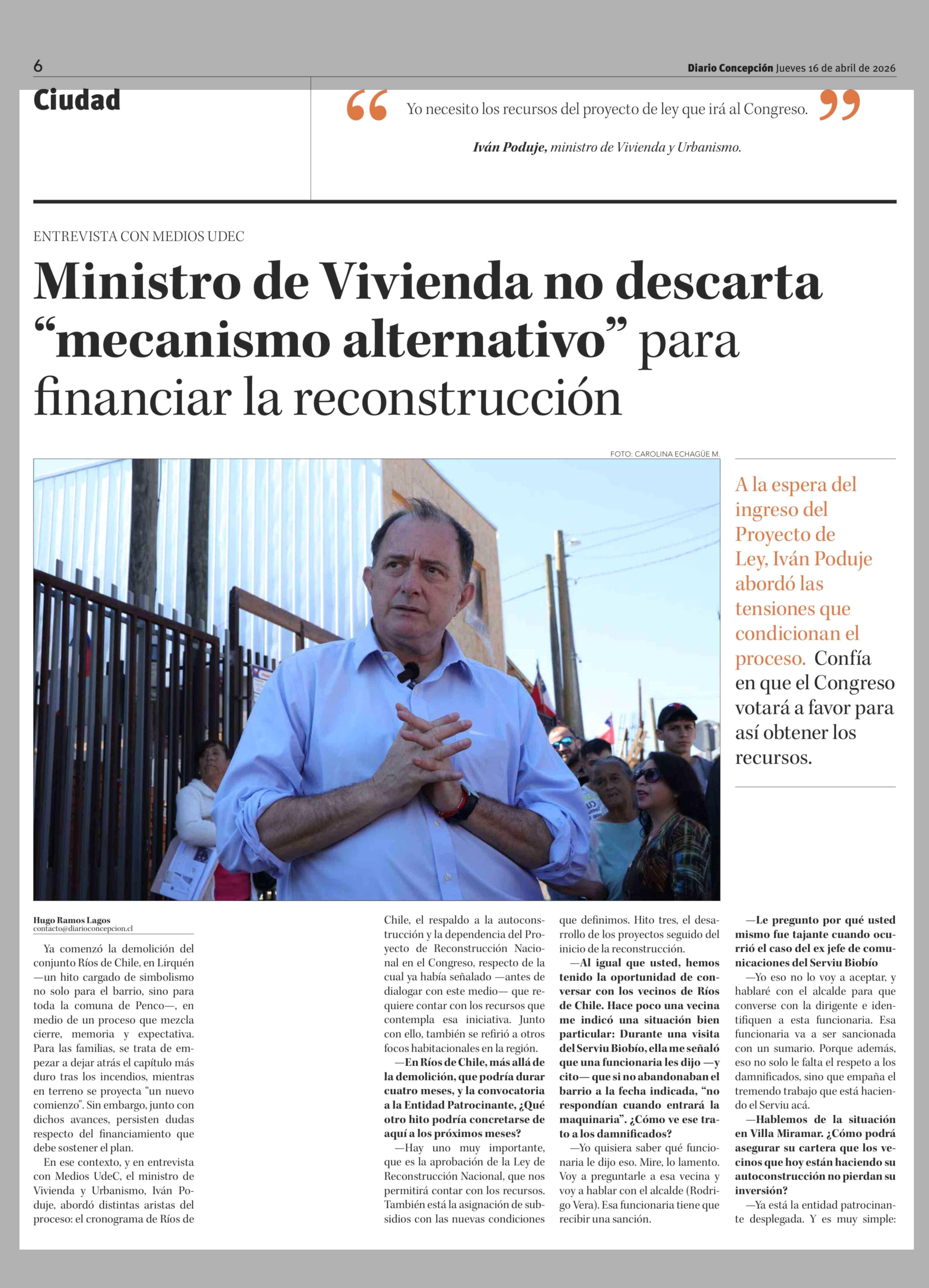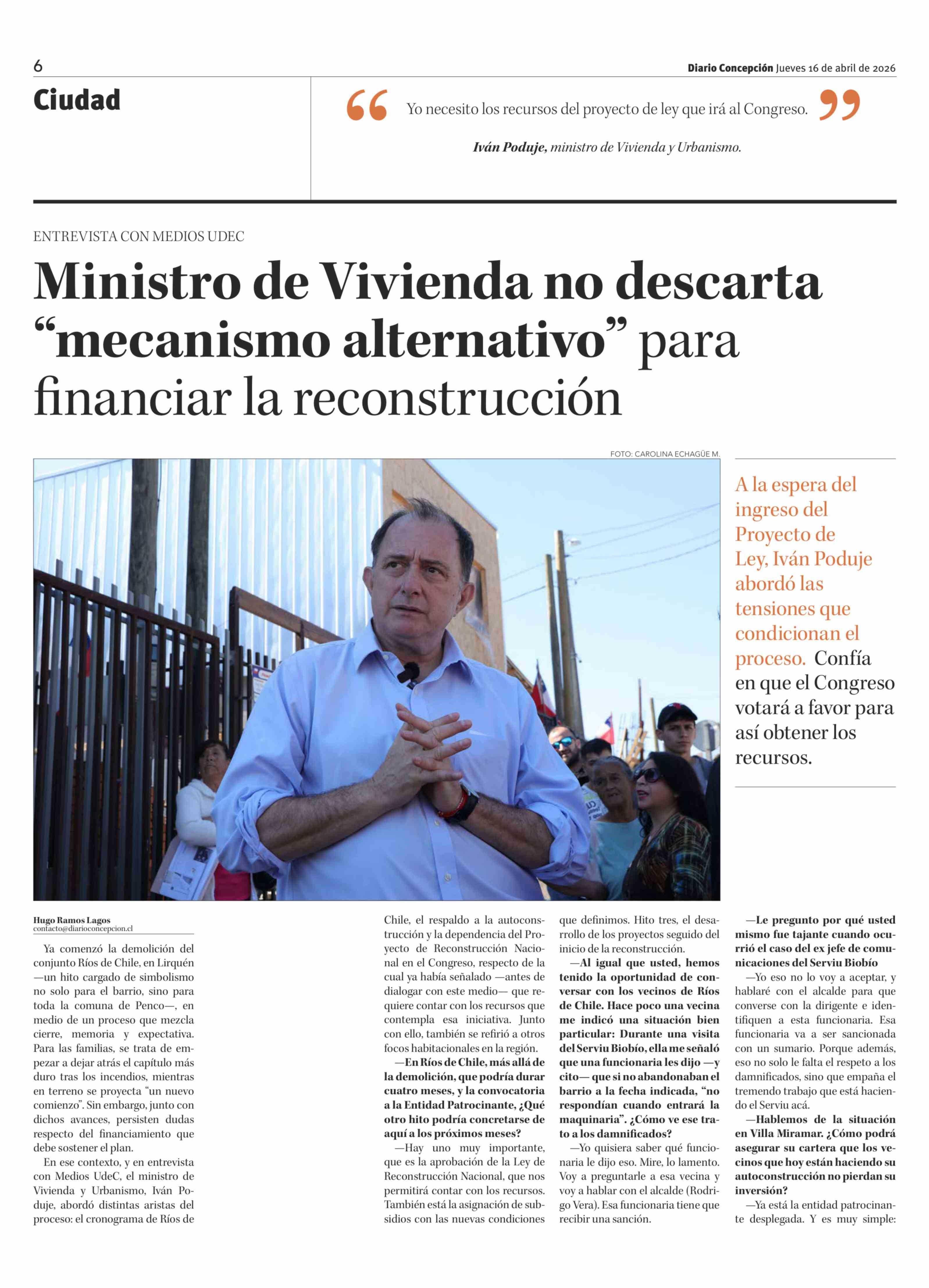 Ministro de Vivienda no descarta mecanismo alternativo" para financiar la reconstrucción 16-04-2026 Diario Concepción |