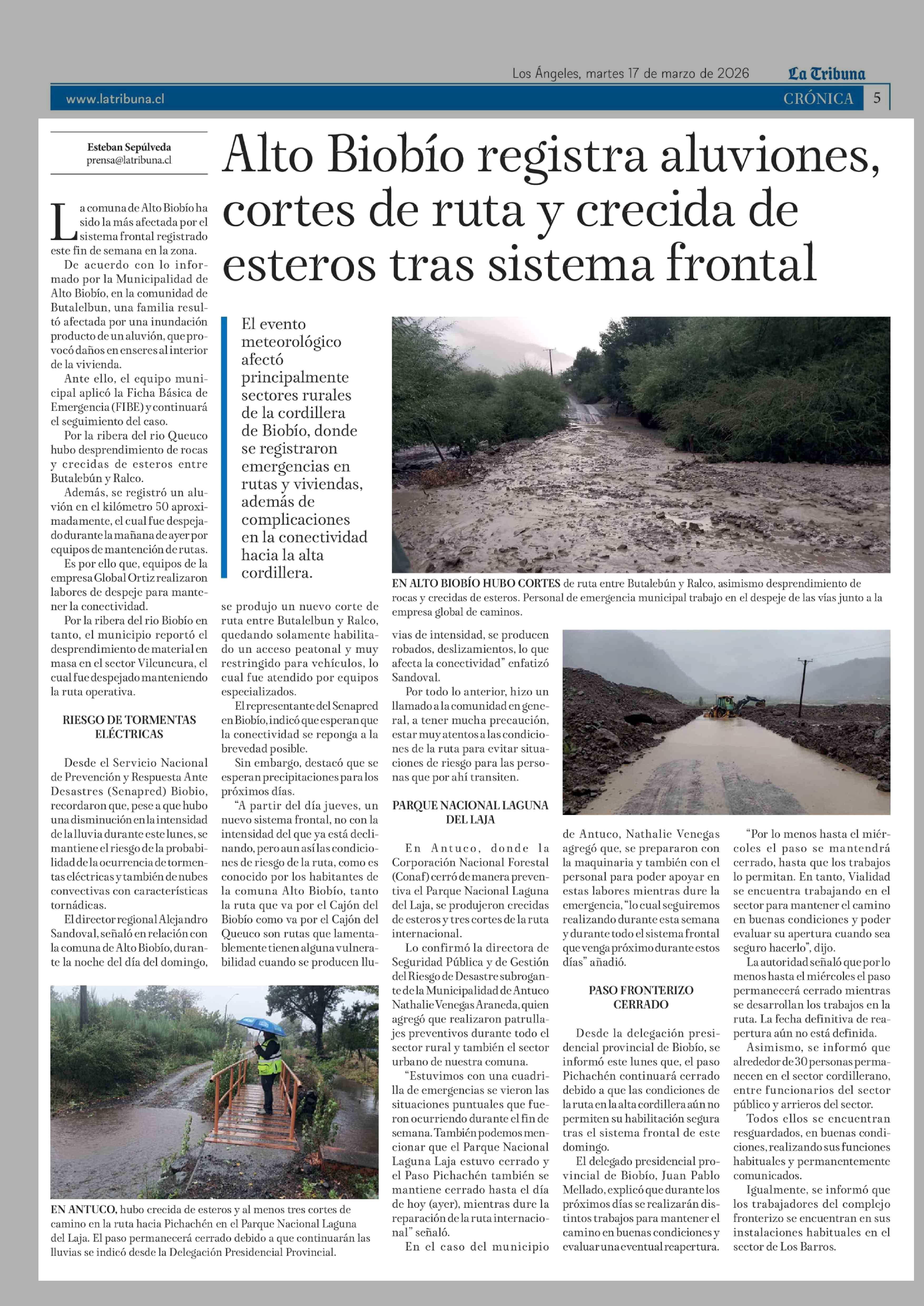 Alto Biobío registra aluviones, cortes de ruta y crecida de esteros tras sistema frontal 17-03-2026 La Tribuna |