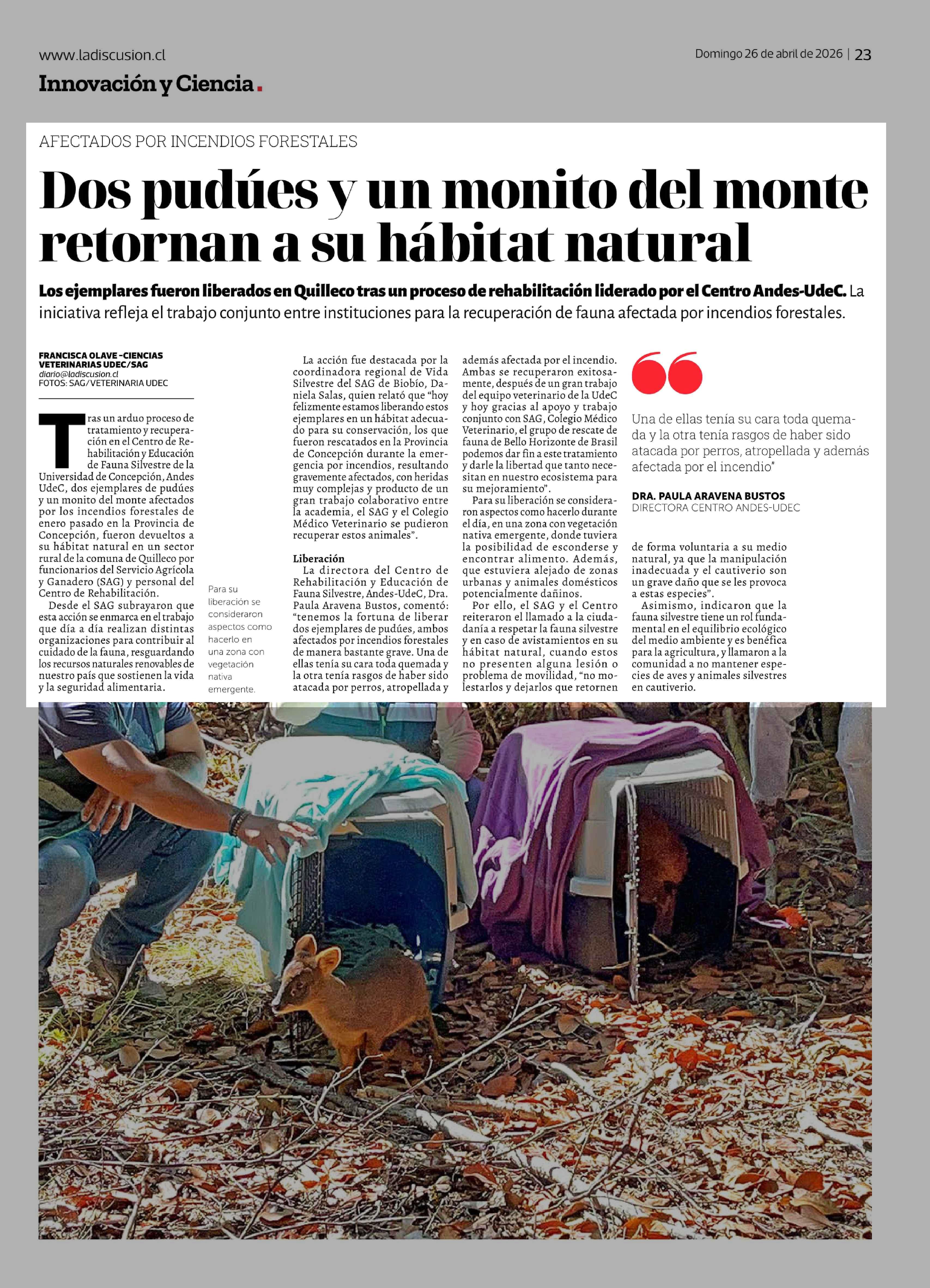Título: Dos pudúes y un monito del monte retornan a su hábitat natural
