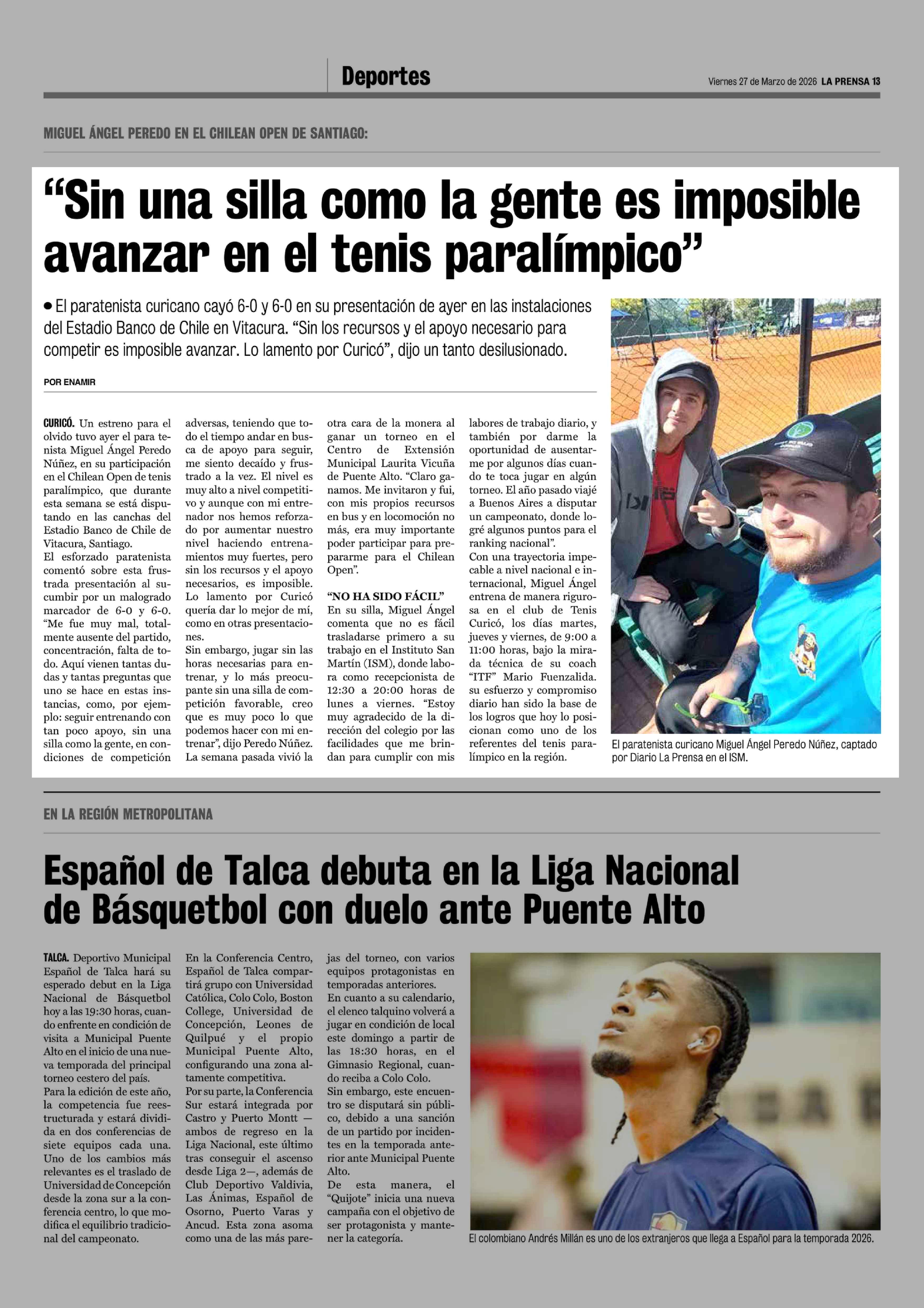"Sin una silla como la gente es imposible avanzar en el tenis paralímpico" 27-03-2026 La Prensa de Curicó |