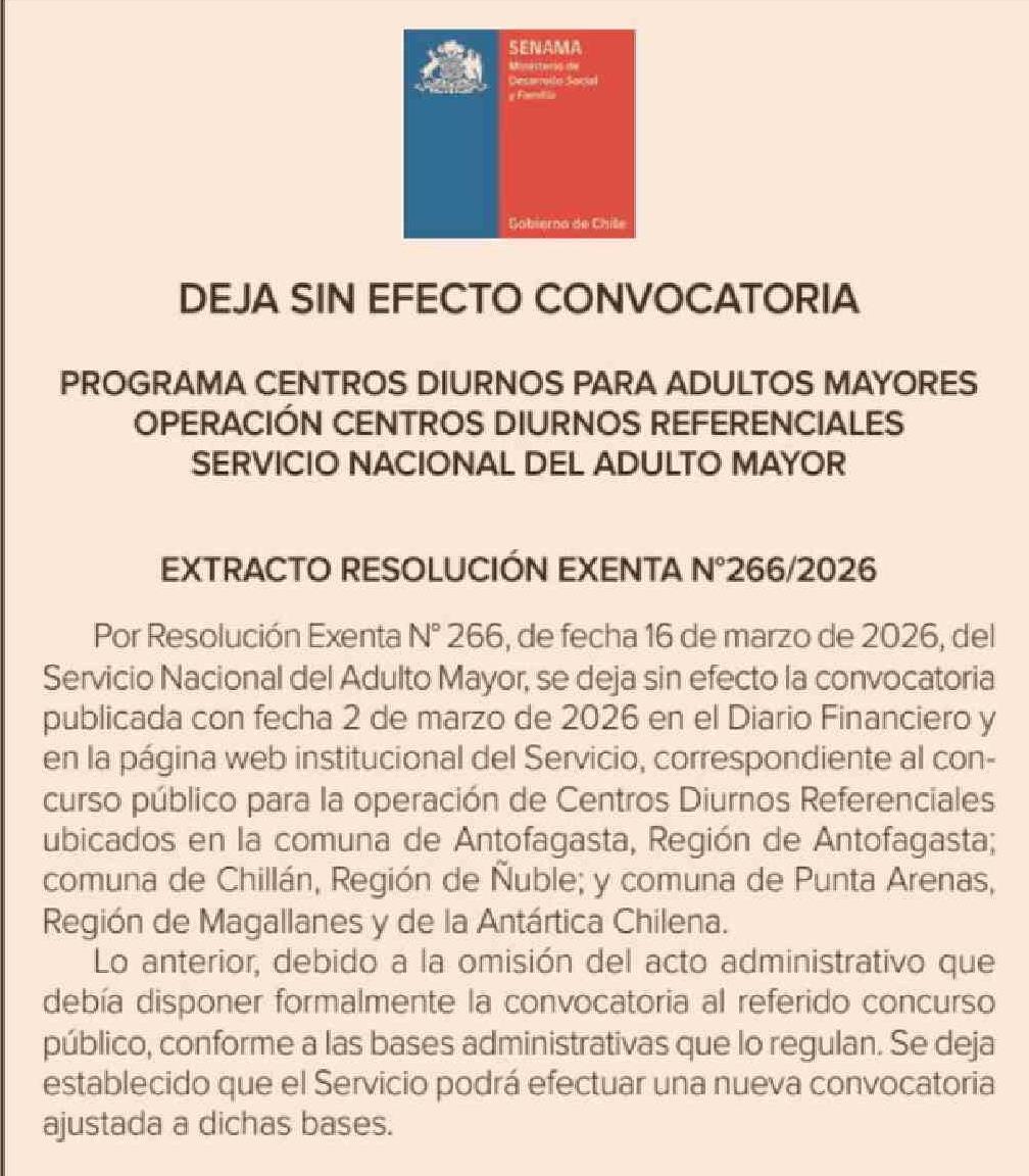 Extractos: SENAMA Ministerio de Desarrollo Social 17-03-2026 Diario Financiero |