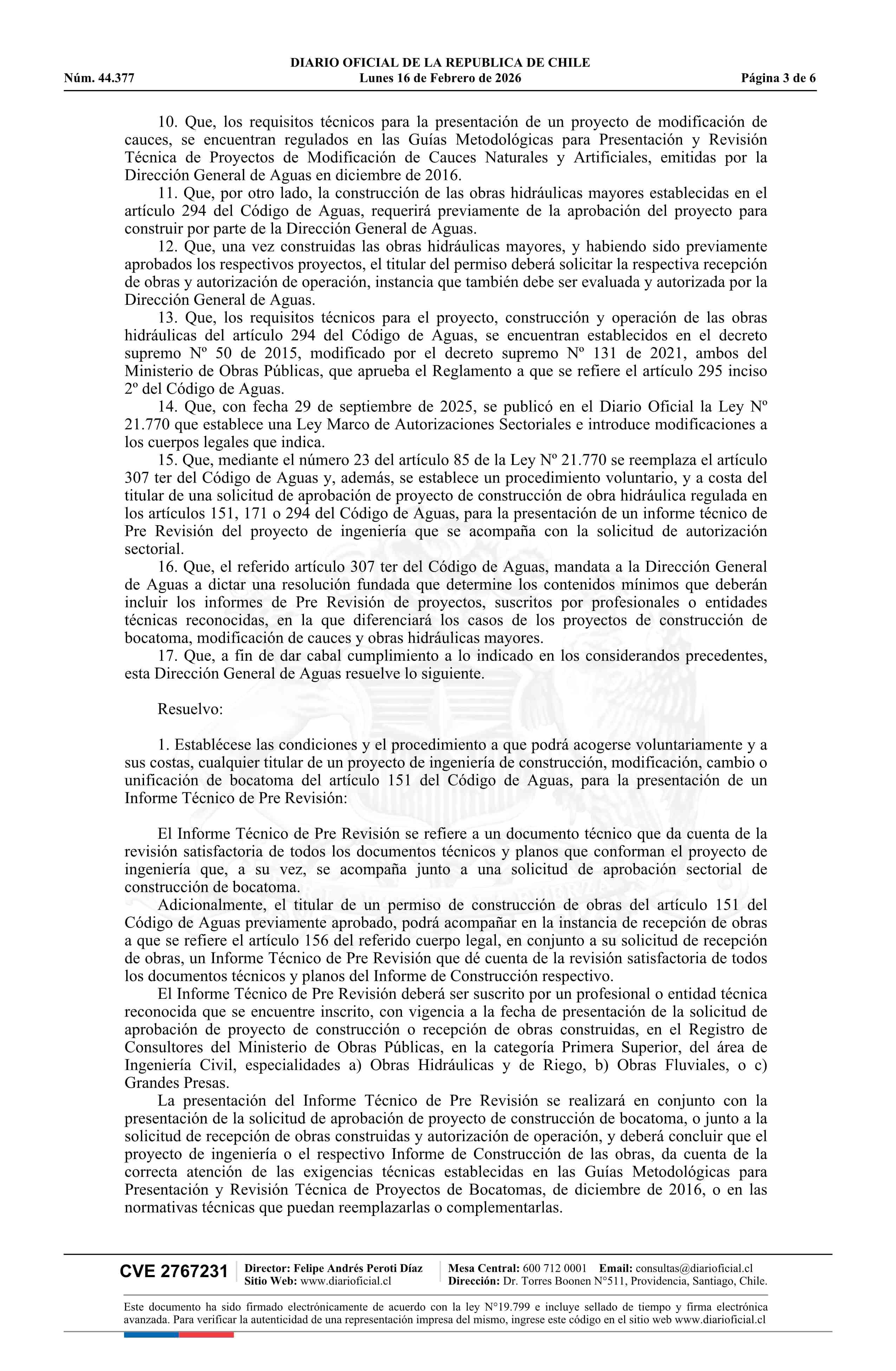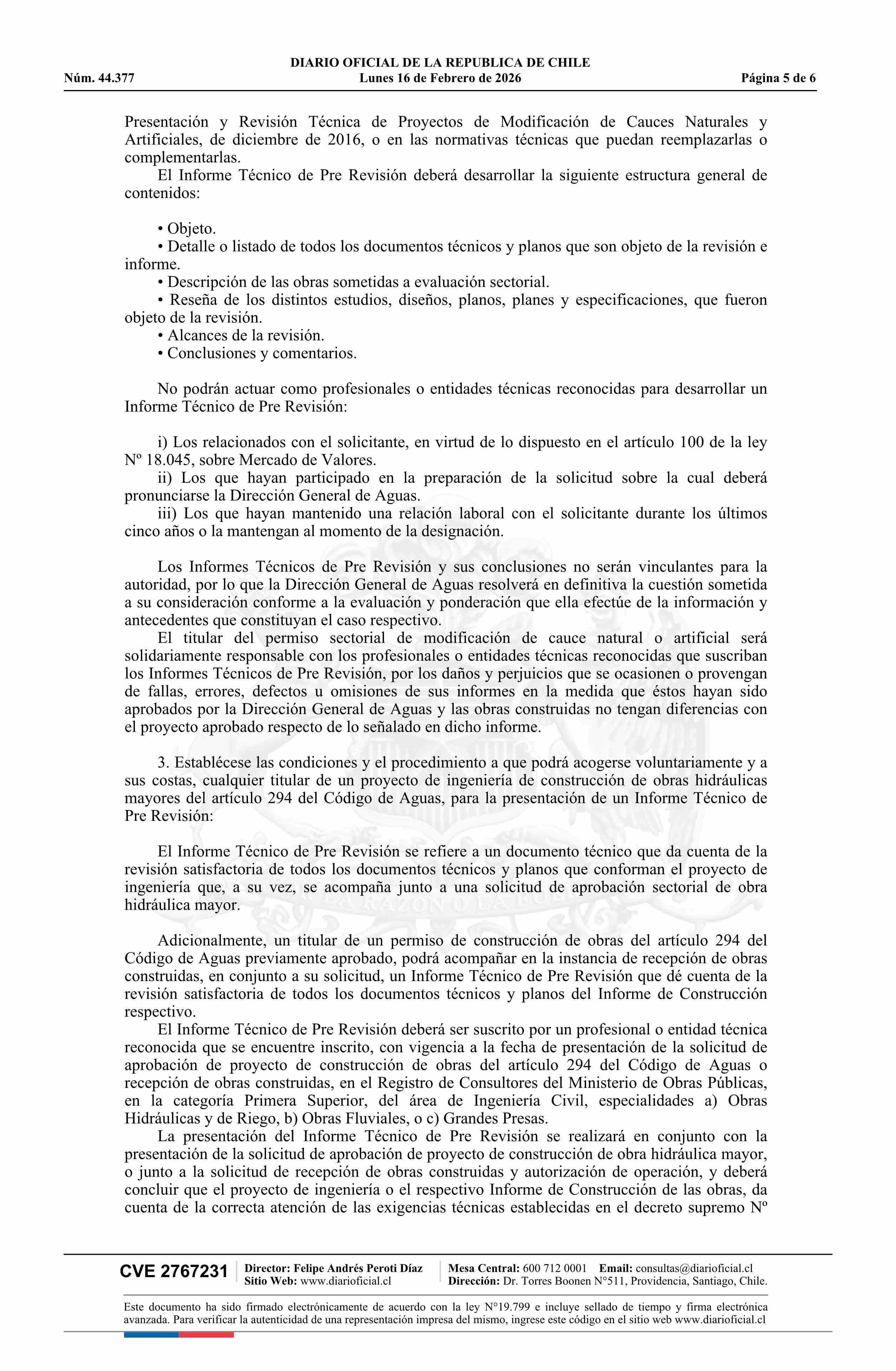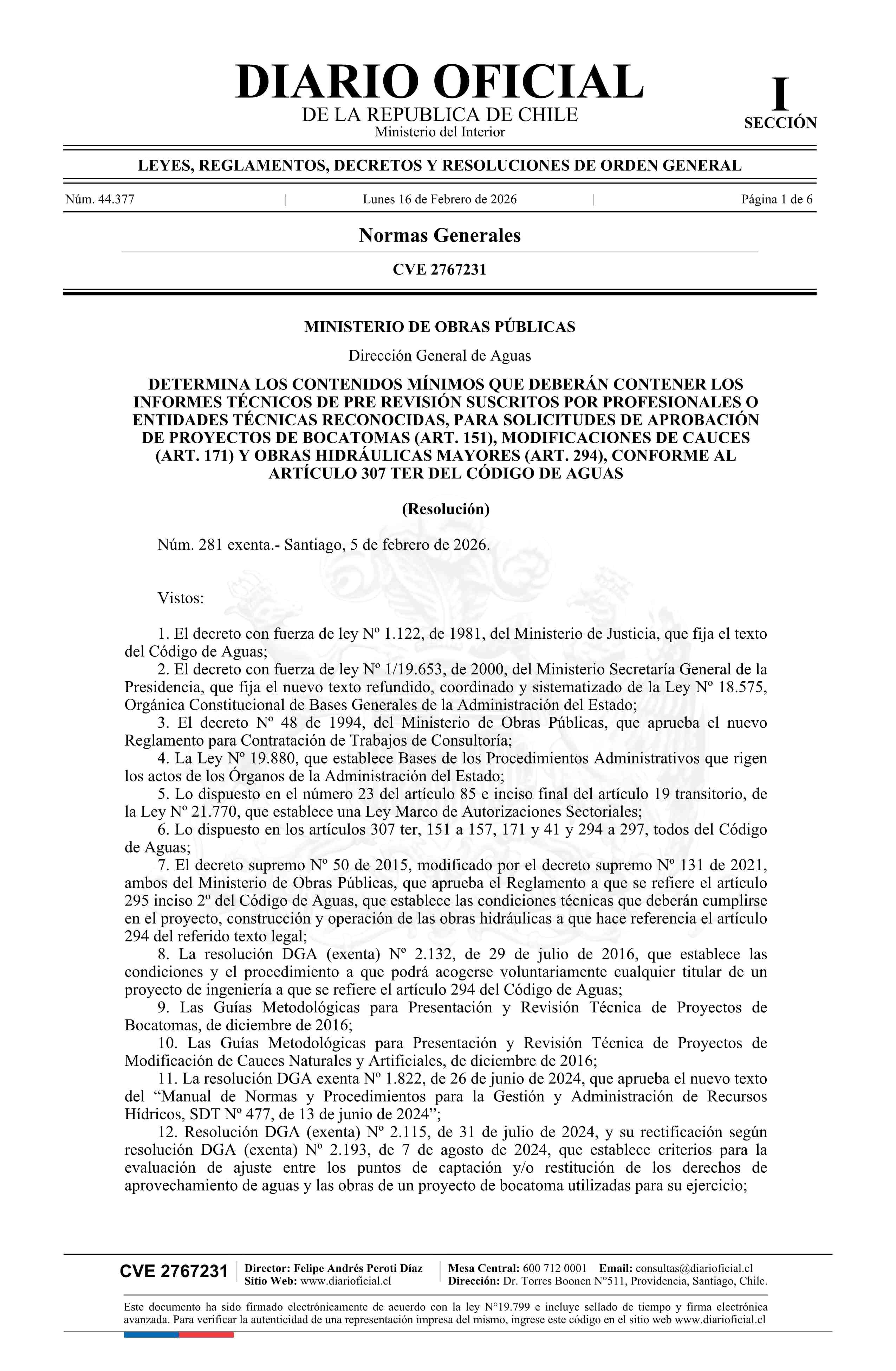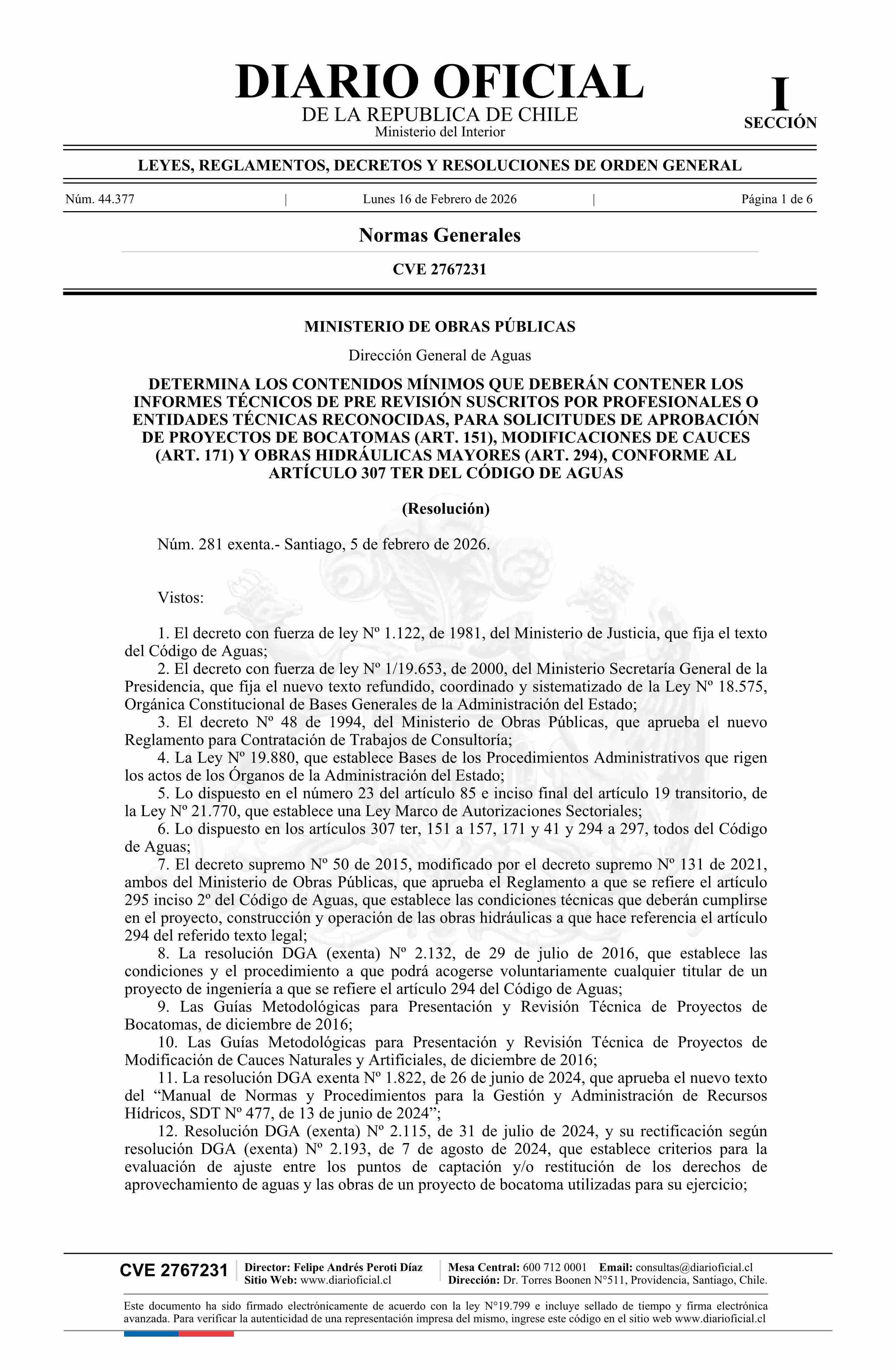 | Título: | Resolución exenta número 281, de 2026.- Determina los contenidos mínimos que deberán contener los Informes Técnicos de Pre Revisión suscritos por profesionales o entidades técnicas reconocidas, para solicitudes de aprobación de proyectos de bocatomas (Art. 151), modificaciones de cauces (Art. 171) y |