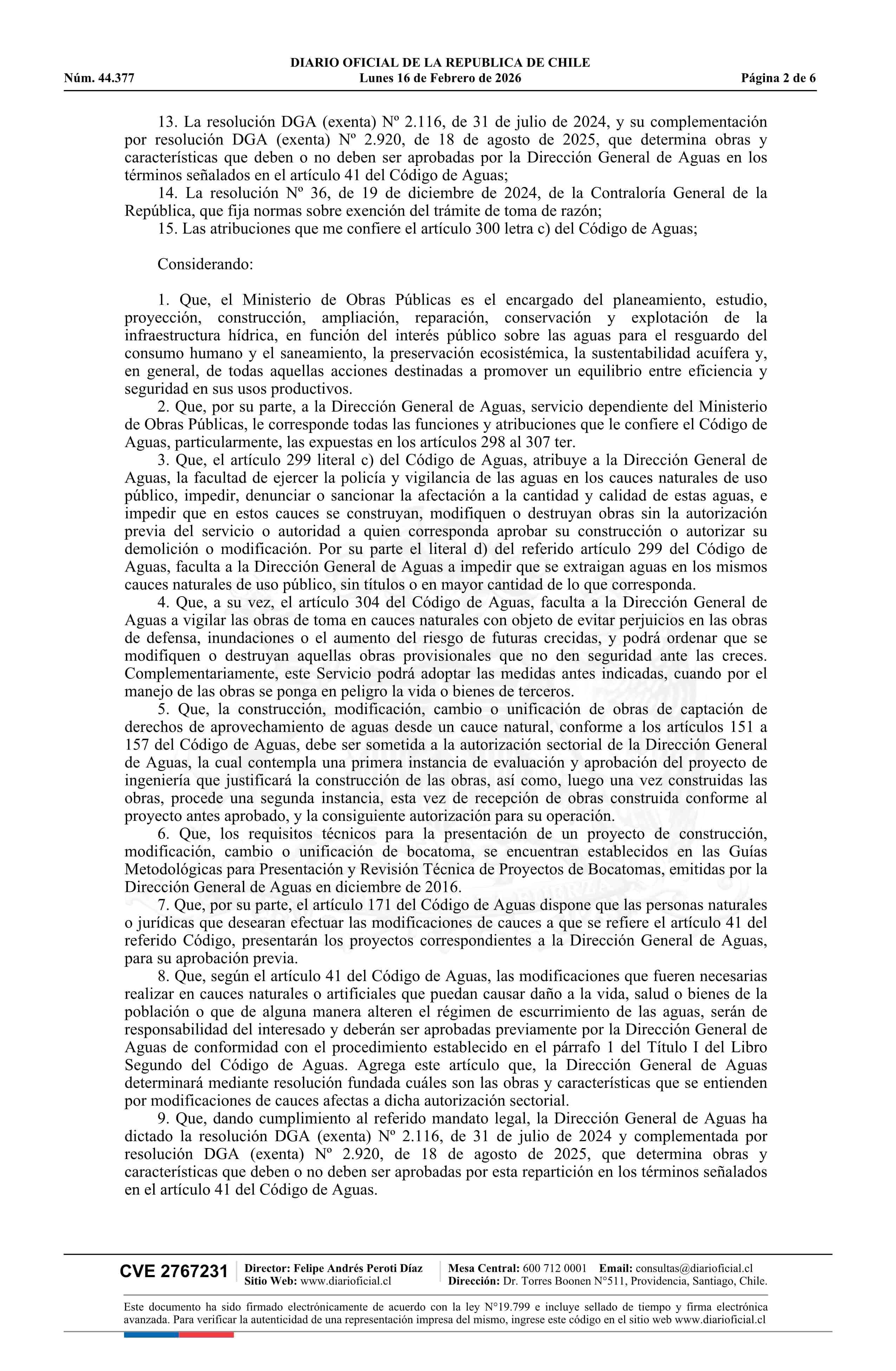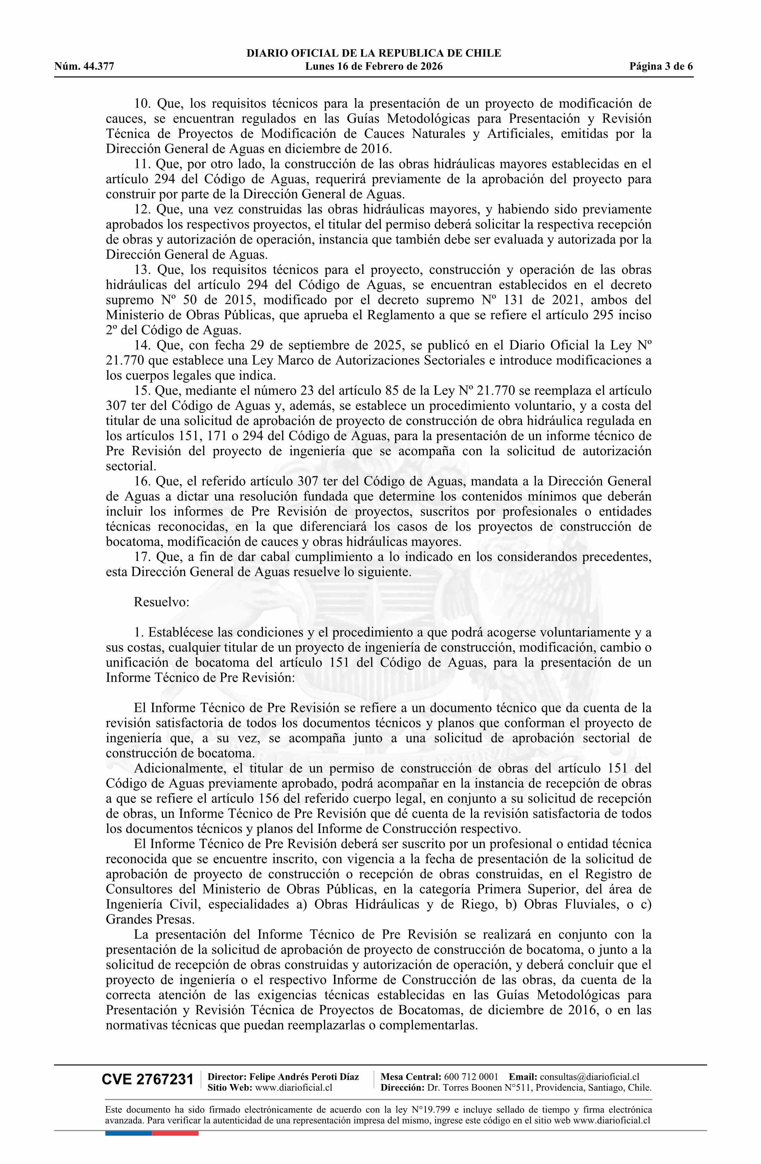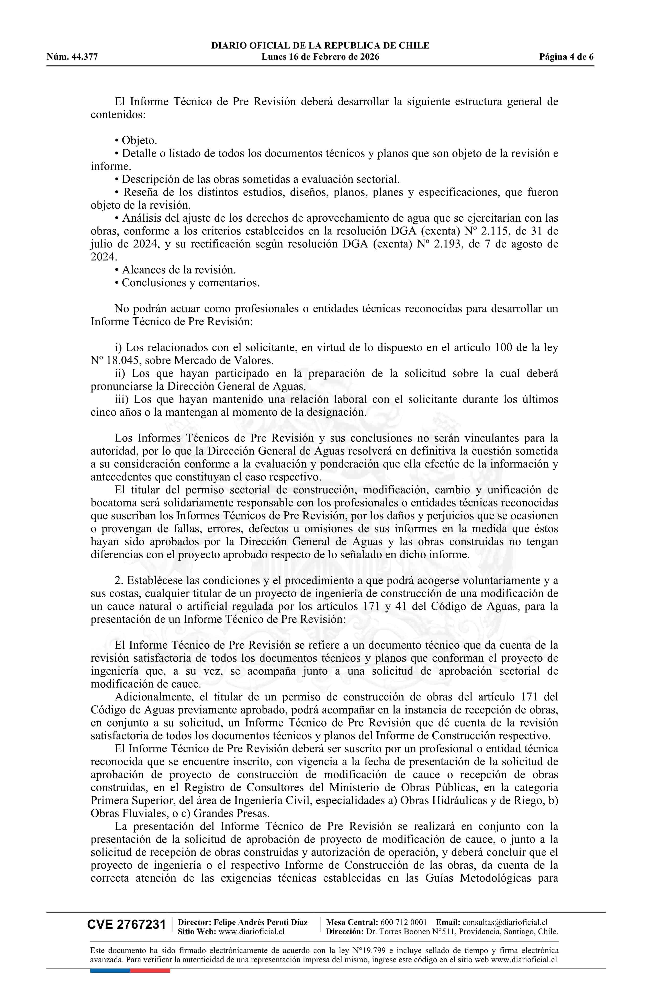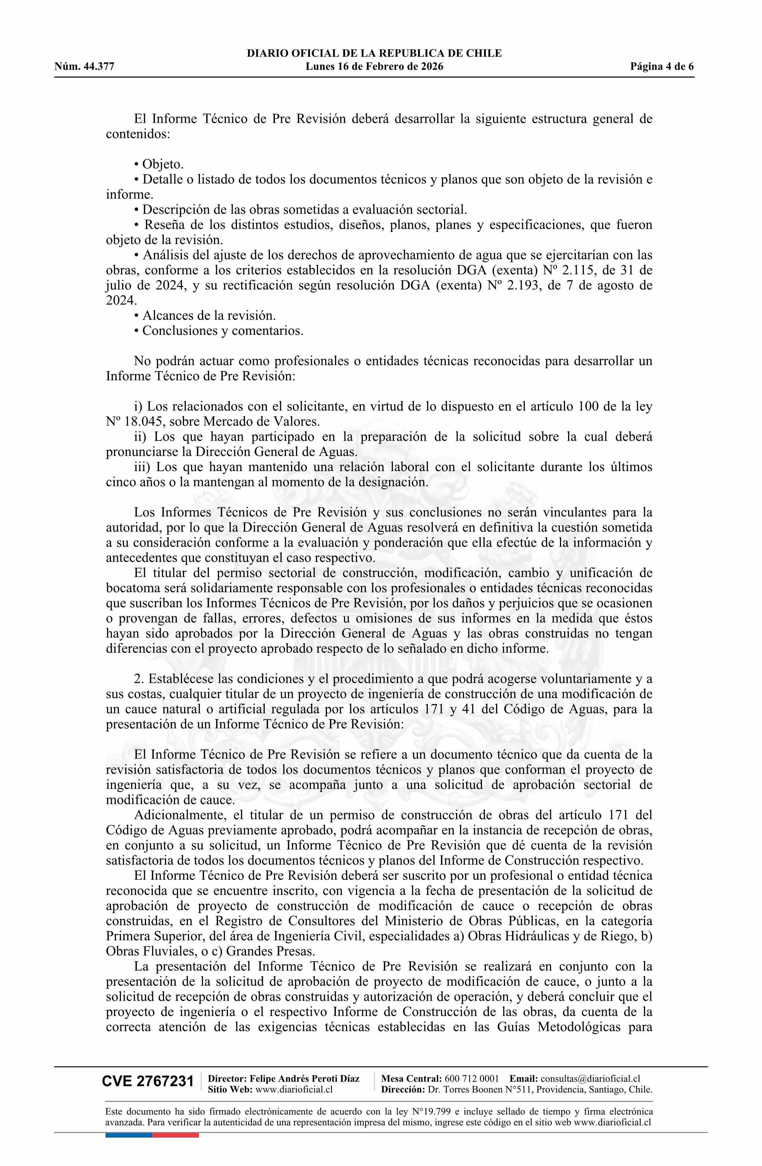 | Título: | Resolución exenta número 281, de 2026.- Determina los contenidos mínimos que deberán contener los Informes Técnicos de Pre Revisión suscritos por profesionales o entidades técnicas reconocidas, para solicitudes de aprobación de proyectos de bocatomas (Art. 151), modificaciones de cauces (Art. 171) y |