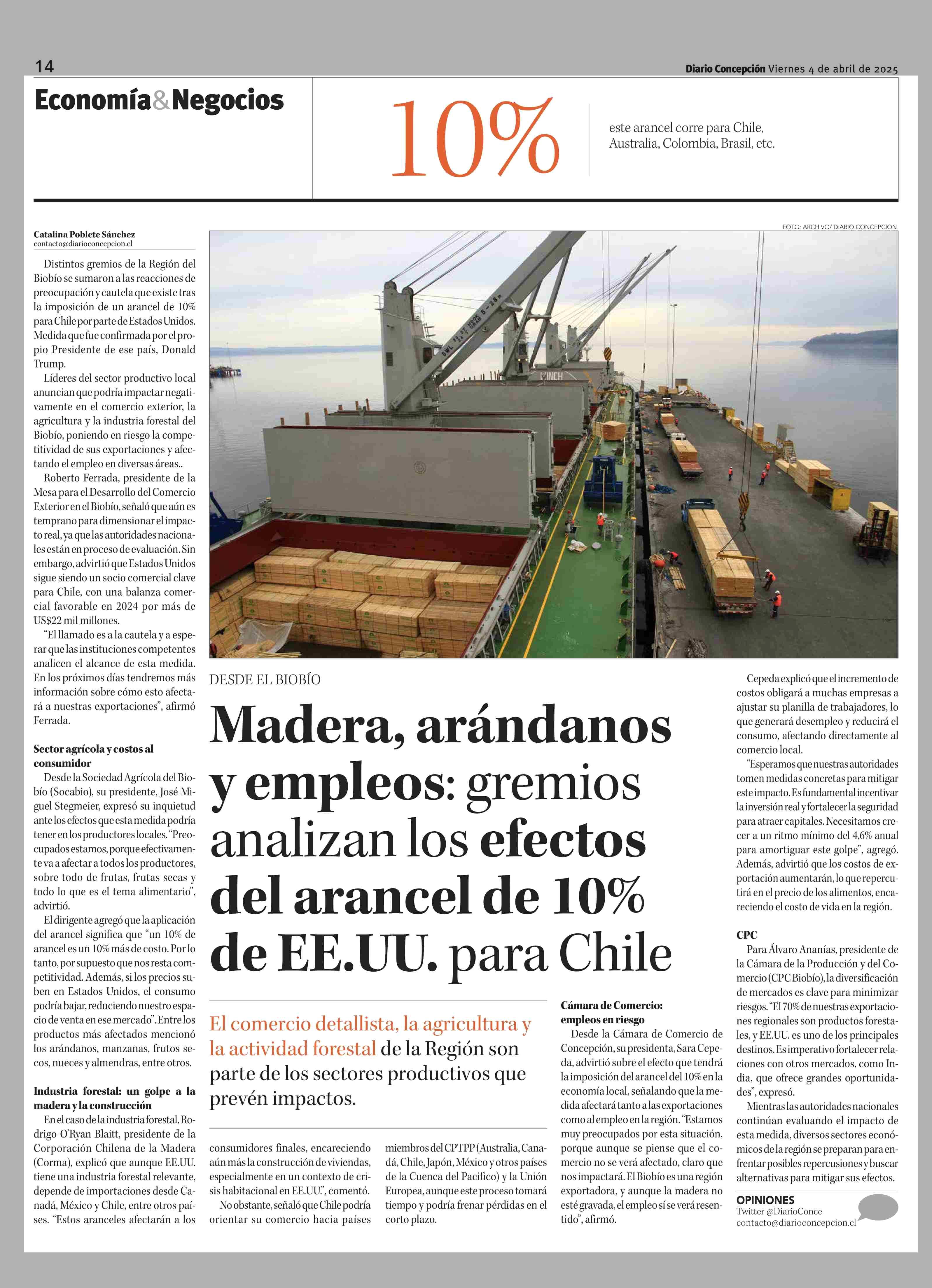 Título: Madera, arándanos y empleos: gremios analizan los efectos del arancel de 10% de EE.UU. para Chile