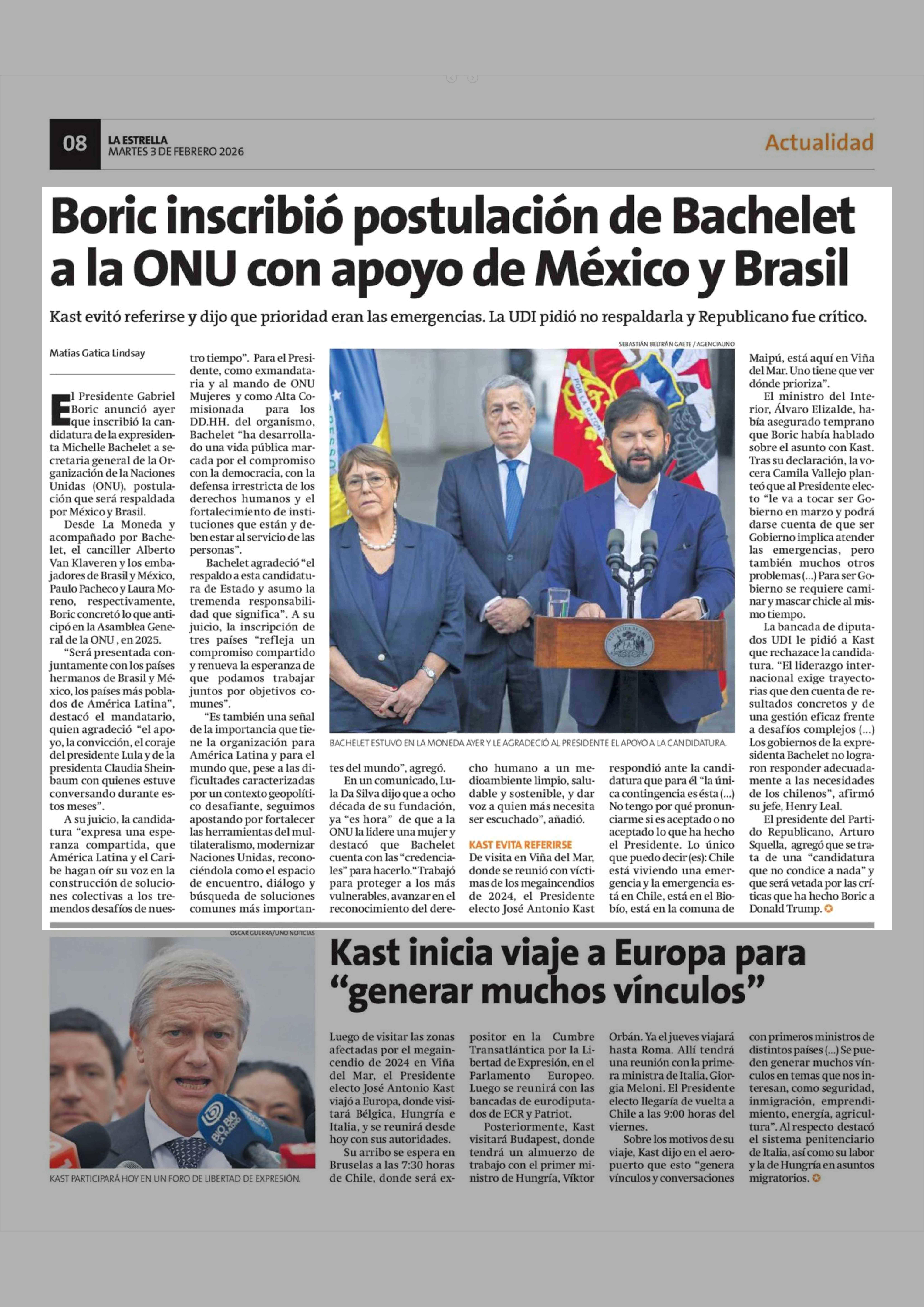 Título: Boric inscribió postulación de Bachelet a la ONU con apoyo de México y Brasil