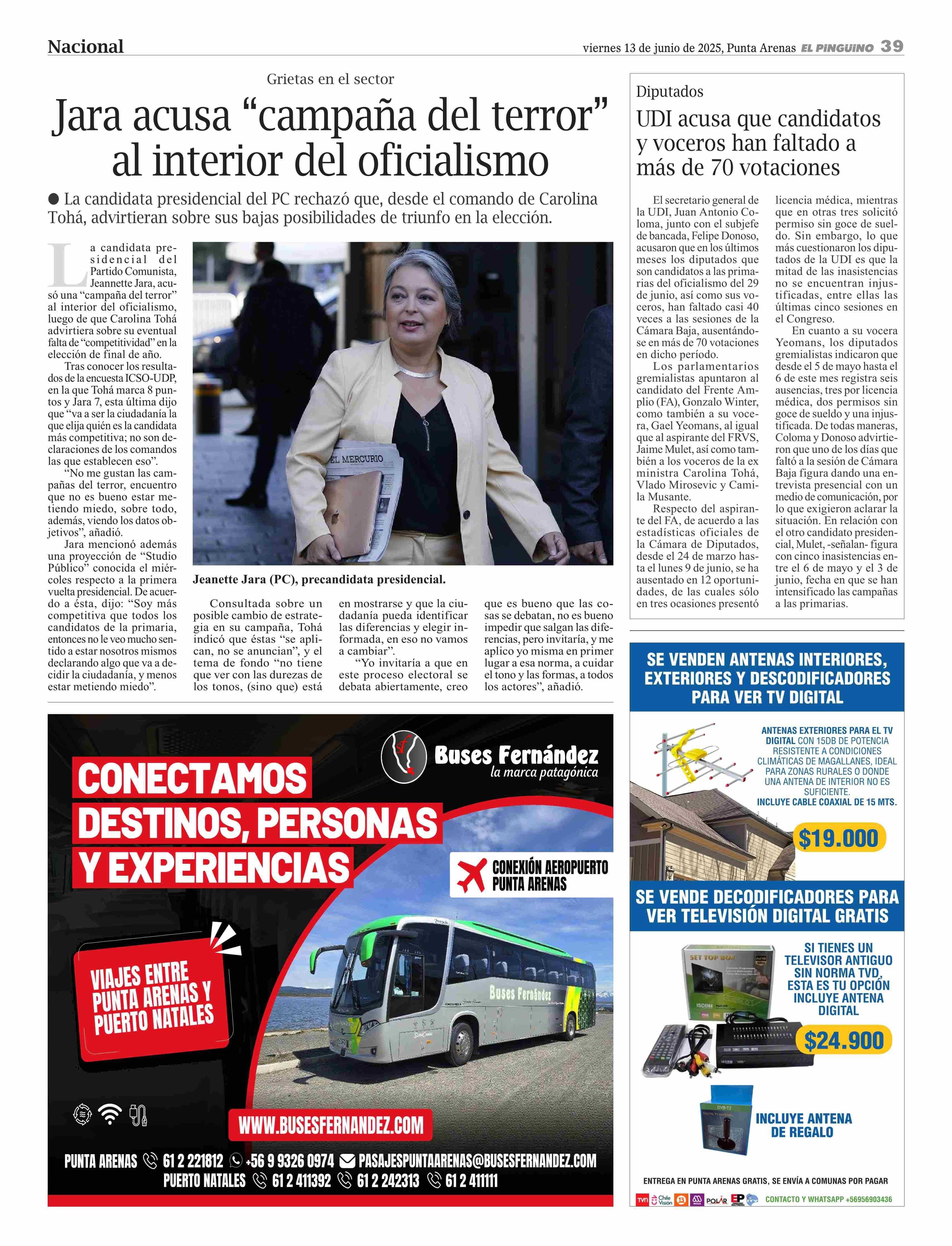 Jara acusa “campaña del terror” al interior del oficialismo 13-06-2025 El Pingüino |