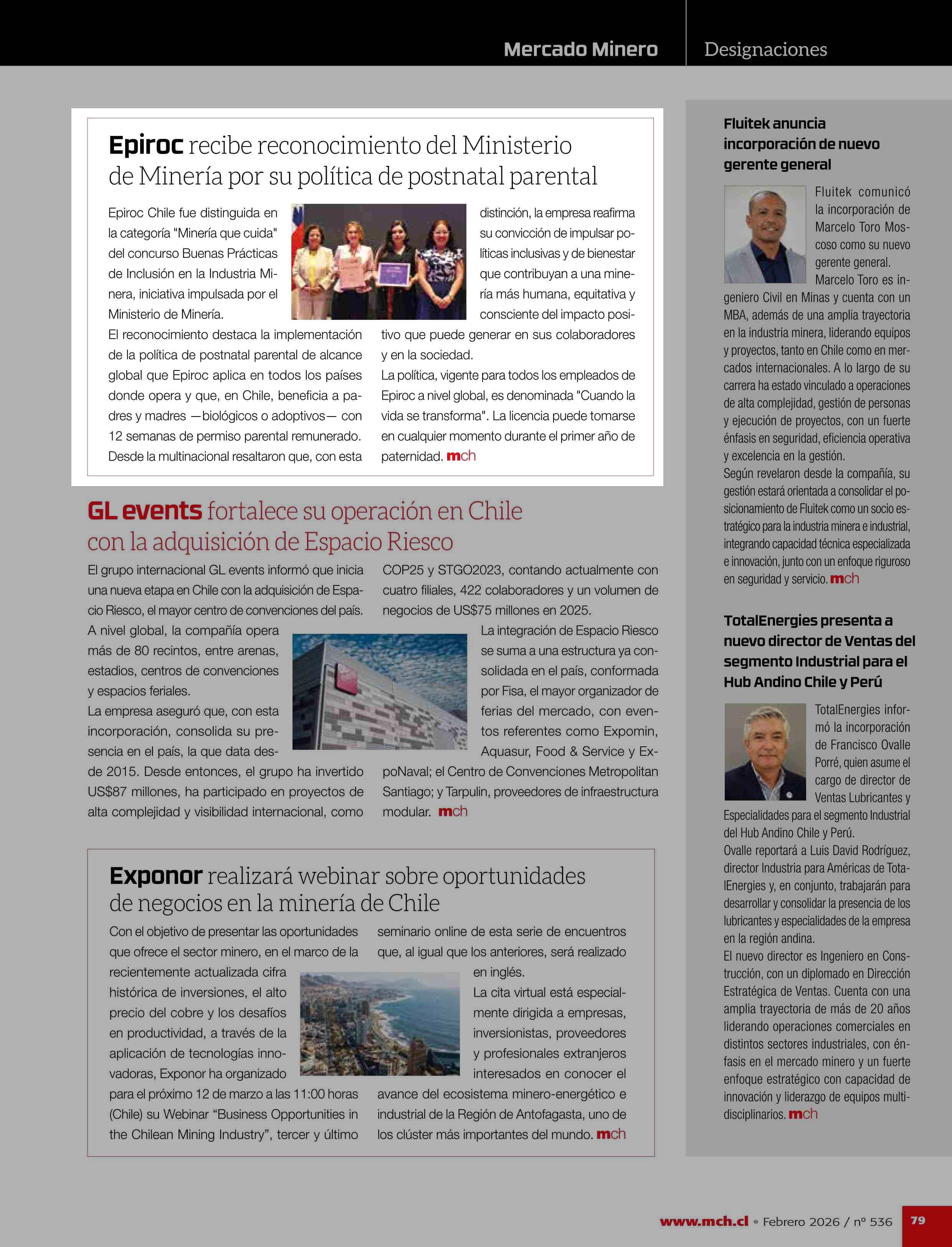 Epiroc recibe reconocimiento del Ministerio de Minería por su política de postnatal parental 19-02-2026 Revista Minería Chilena |