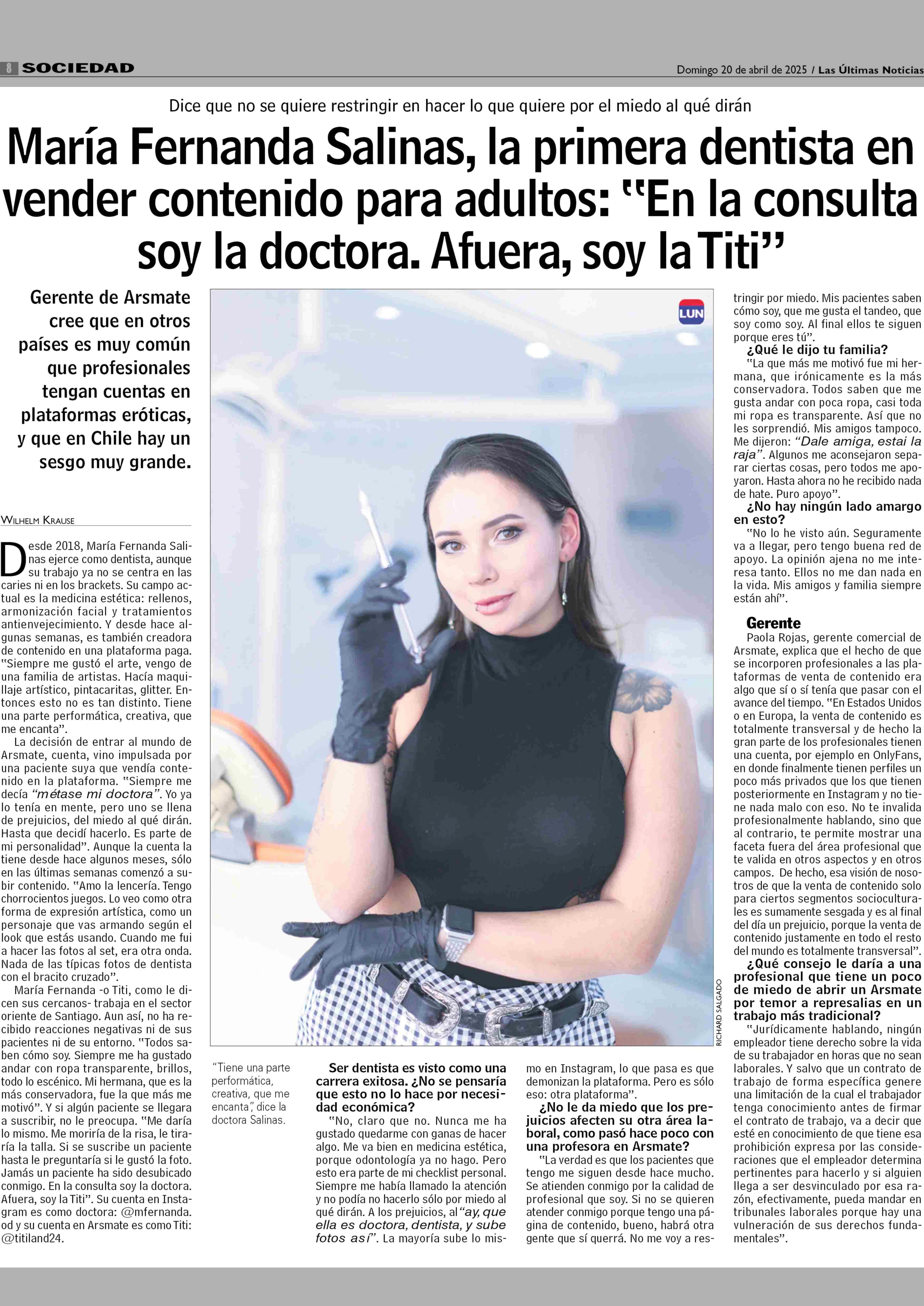 María Fernanda Salinas, la primera dentista en vender contenido para adultos: “En la consulta soy la doctora. Afuera, soy la Titi” 20-04-2025 Las Últimas Noticias |