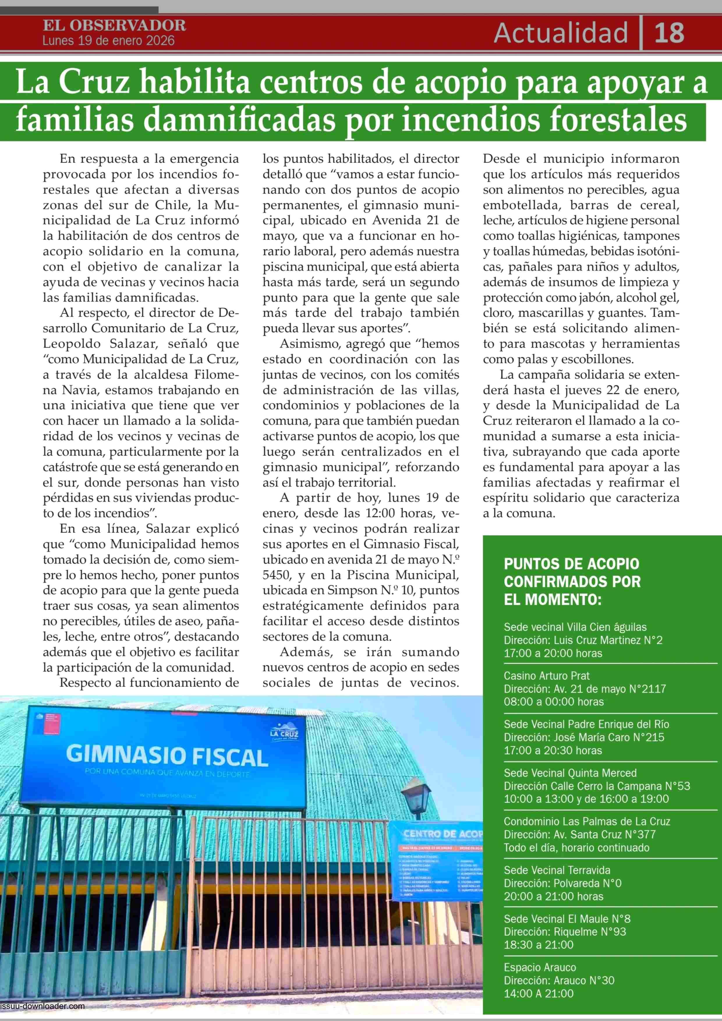 La Cruz habilita centros de acopio para apoyar a familias damnificadas por incendios forestales 19-01-2026 El Observador Vespertino |
