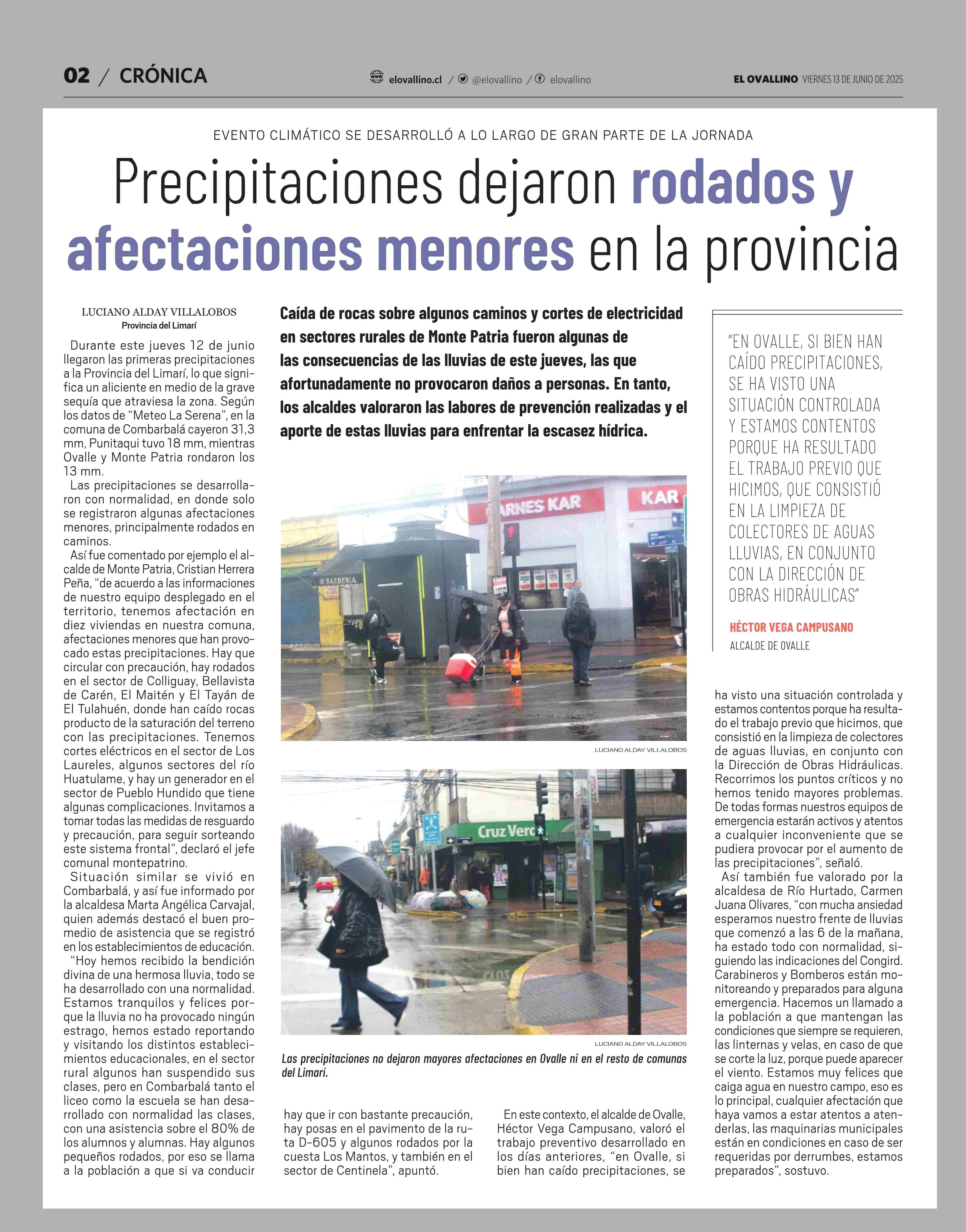Precipitaciones dejaron rodados y afectaciones menores en la provincia 13-06-2025 El Ovallino |