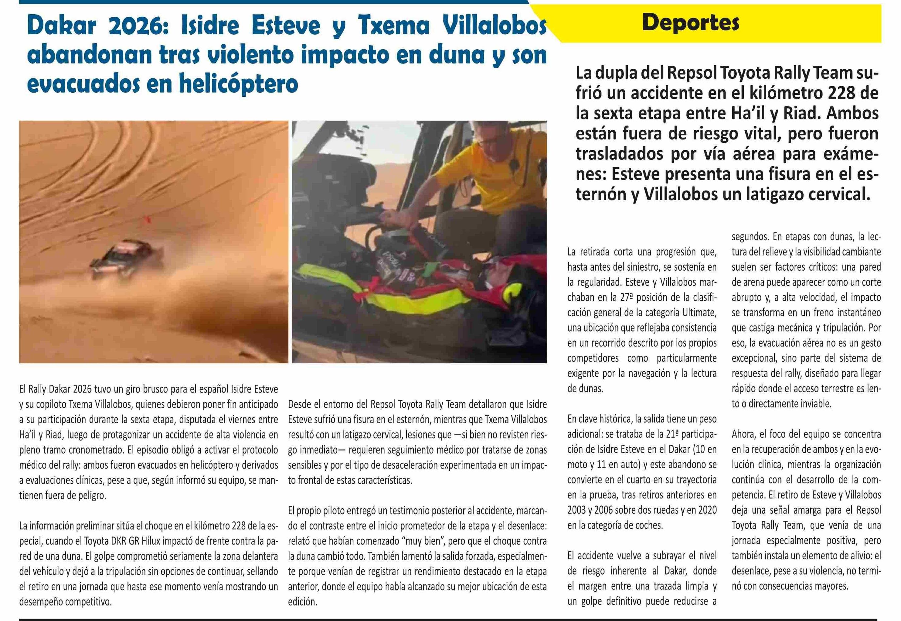 | Título: | El Rally Dakar 2026 tuvo un giro brusco para el español Isidre Esteve y su copiloto Txema Villalobos, quienes debieron poner fin anticipado Desde el entorno del Repsol Toyota Rally Team detallaron que Isidre a su participación durante la sexta etapa, disputada el viernes entre Esteve sufrió una fisu |