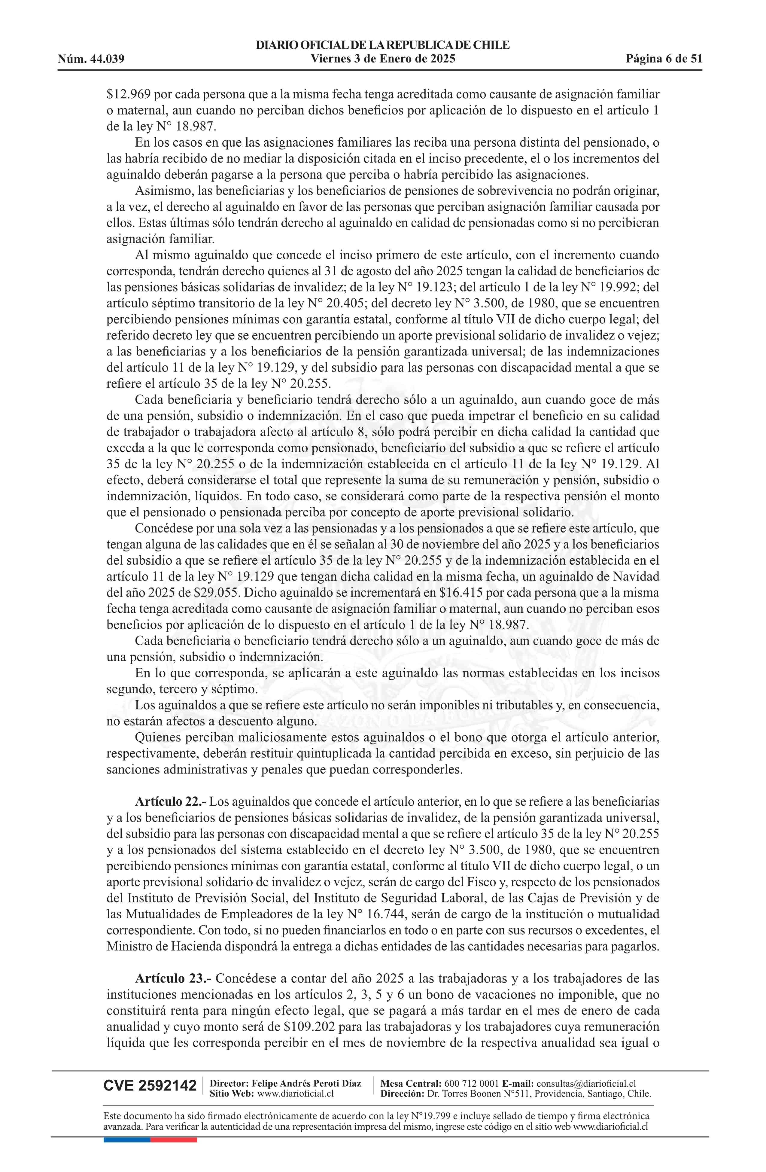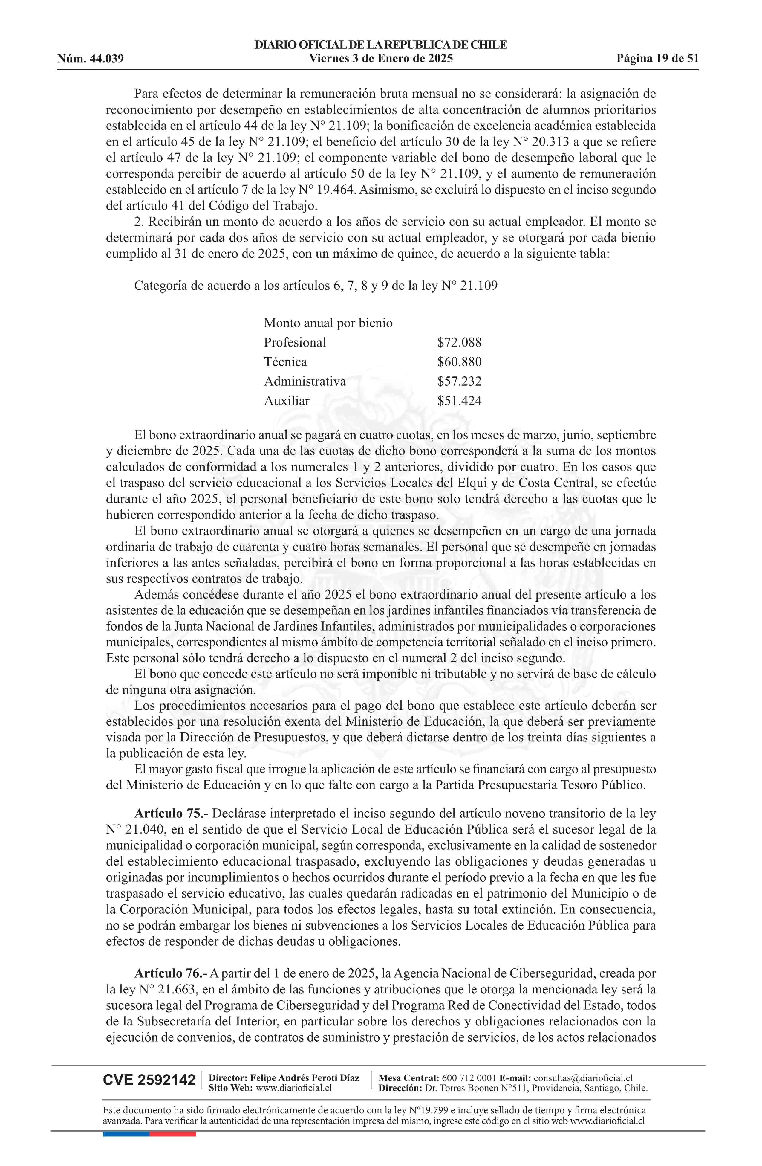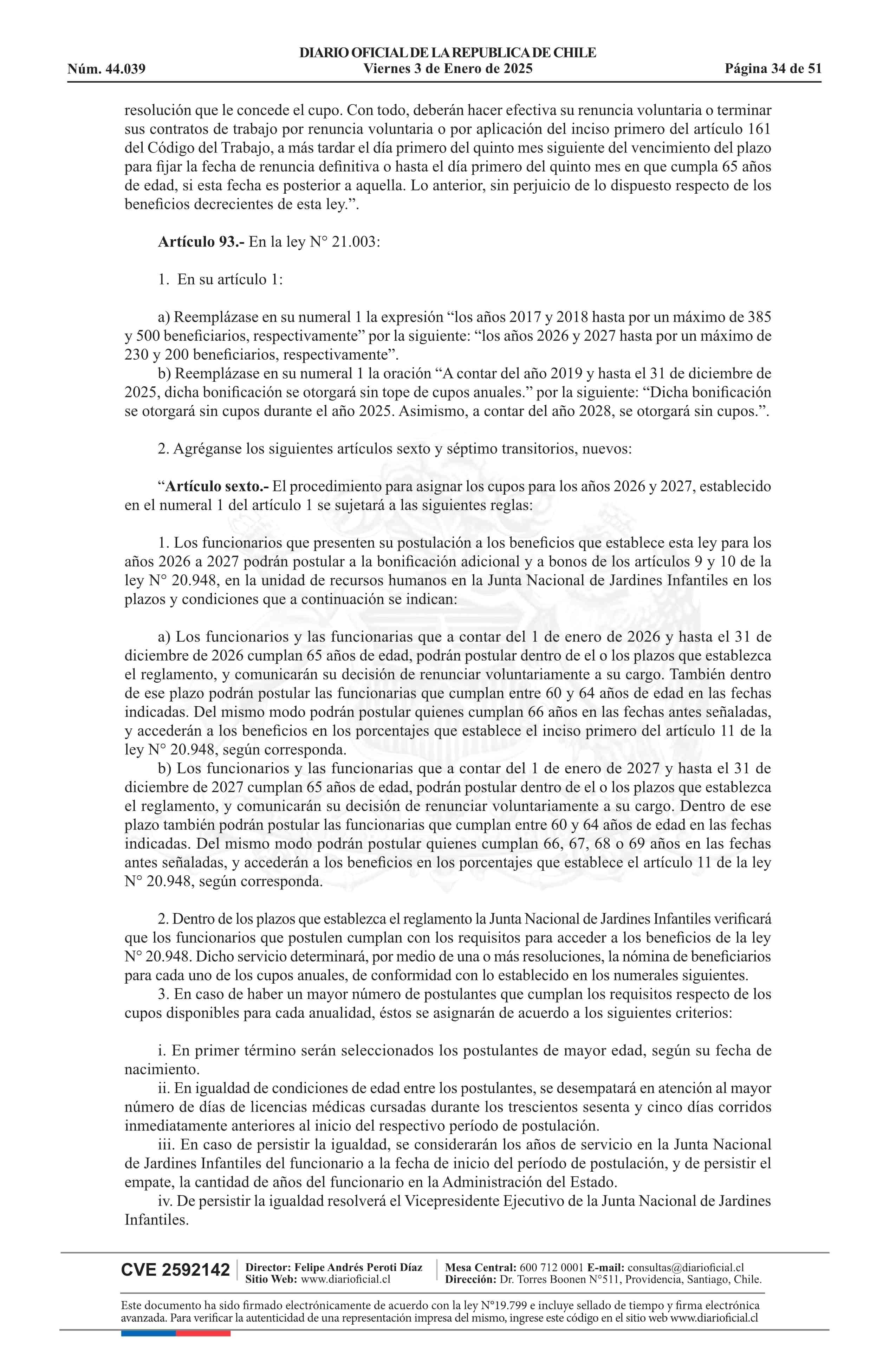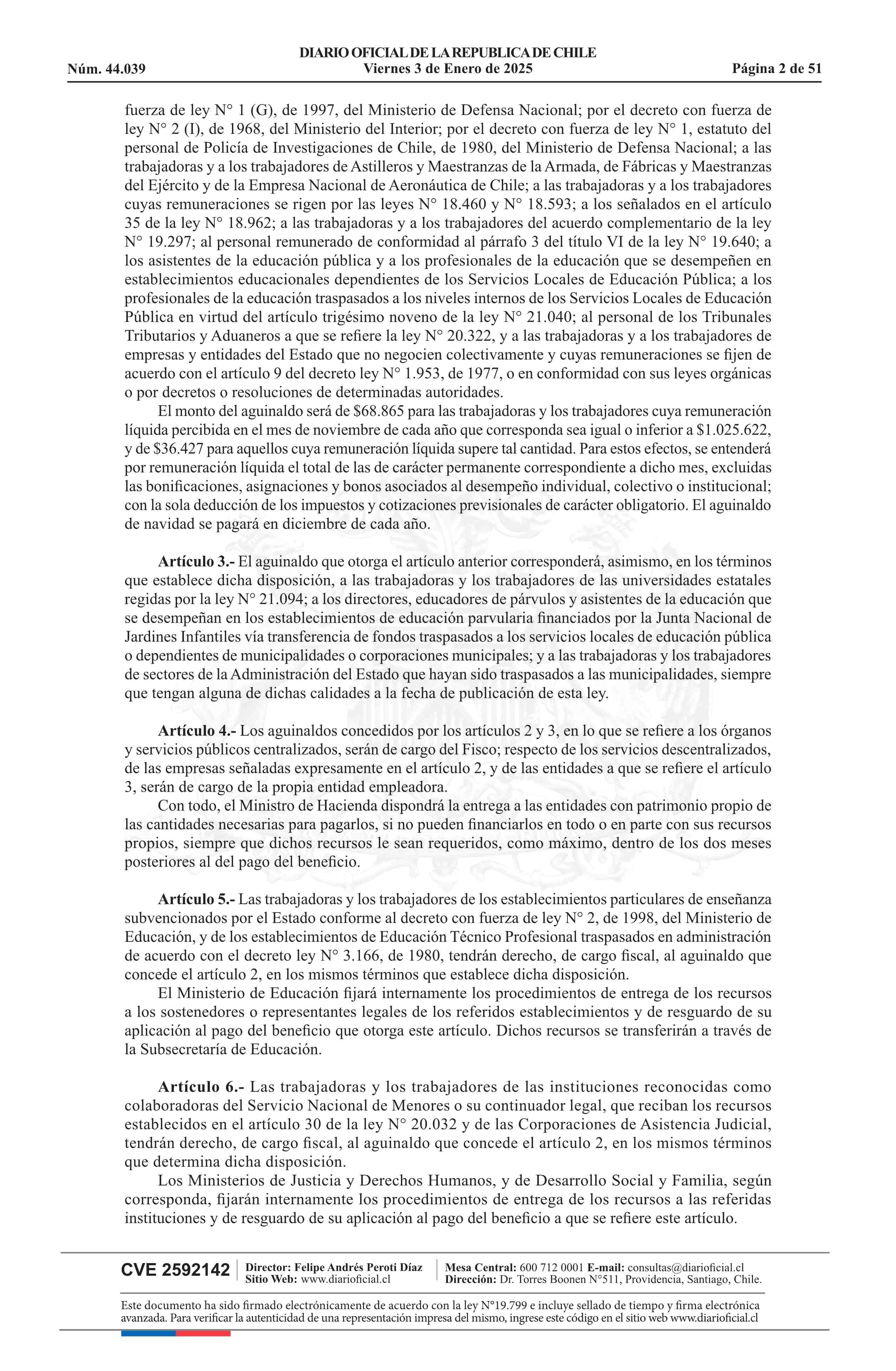 | Título: | Ley número 21.724.- Otorga reajuste general de remuneraciones a las y los trabajadores del sector público, concede aguinaldos que señala, concede otros beneficios que indica, y modifica diversos cuerpos legales |